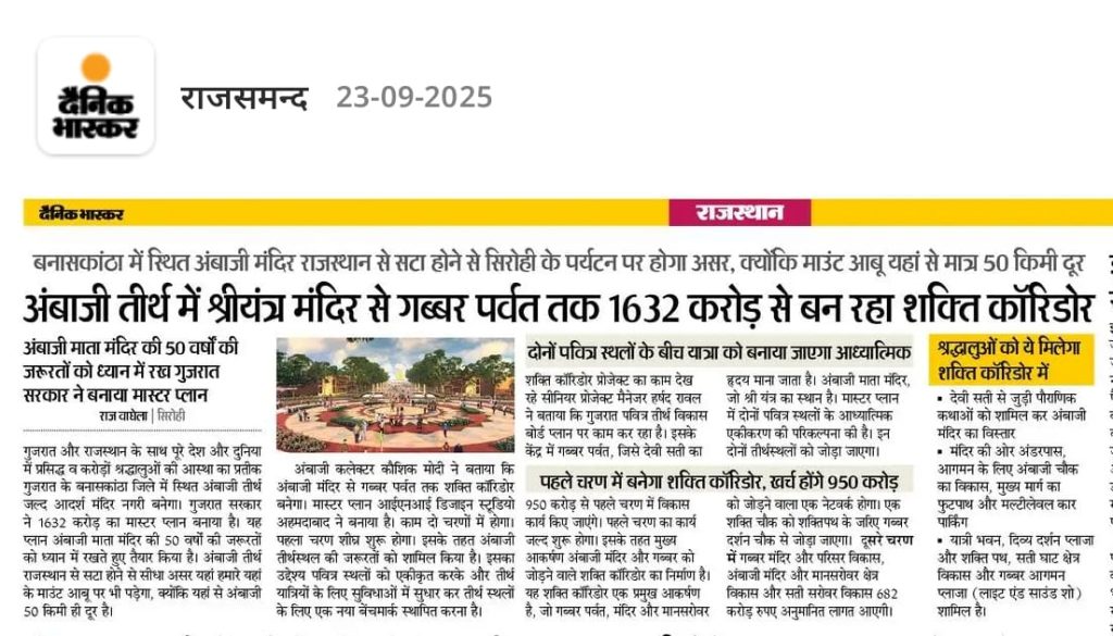 The Ambaji Shrine, located in the Banaskantha district of Gujarat, renowned in Gujarat, Rajasthan, and a symbol of faith for millions of devotees, will soon become an ideal Temple Town. The Gujarat government has developed a master plan worth ₹1,632 crore. This plan has been prepared keeping in mind the needs of the Ambaji Mata Temple for the next 50 years. The proximity of the Ambaji Shrine to Rajasthan will directly impact Mount Abu, as Ambaji is only 50 kilometers away.