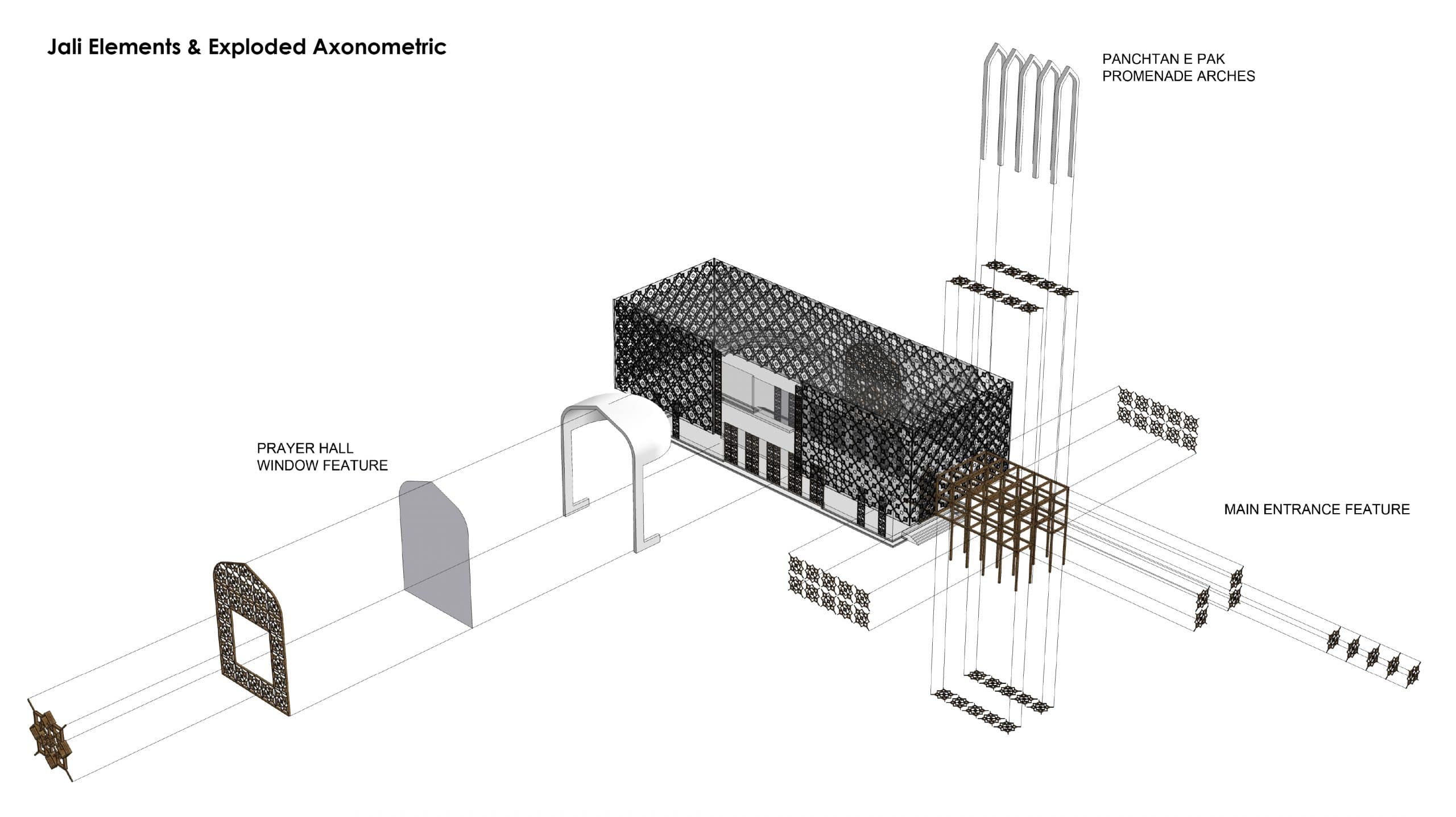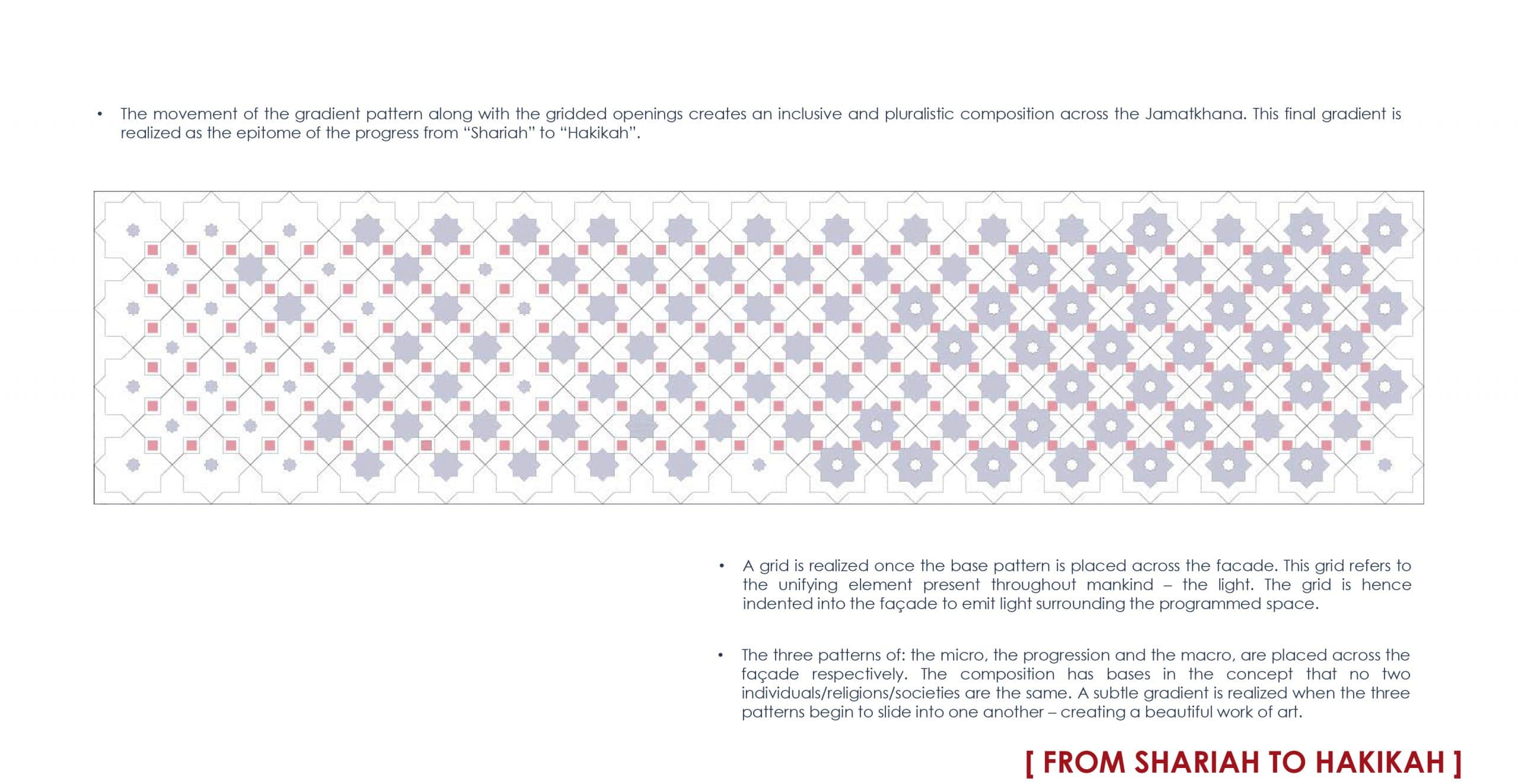 A modern form inspired by traditional mosque architecture, this ground + 2 story congregation building that functions as the social epicenter of the community is elevated on a translucent base at the ground floor, lending it visual lightness. Its main southern entrance faces the main entry point to the entire complex, and has a perforated lattice adorned doorway leading to a community gathering hall inside that can spill over to the community garden to its east. The upper two floors of prayer hall and religious school are contained in the Honey-Onyx stone clad elevated block, which projects out as a canopy above the ground floor entranceway. Five distinct geometric patterns representing the five founding holy personalities of the faith are used in the traditionally inspired latticed jalis covering the front southern façade and also ribboning intermittently around the east west facades and the roof. These jaalis serve shading devices that also filter light in beautiful patterns from outside inwards during day and outwards from the interiors after sundown.