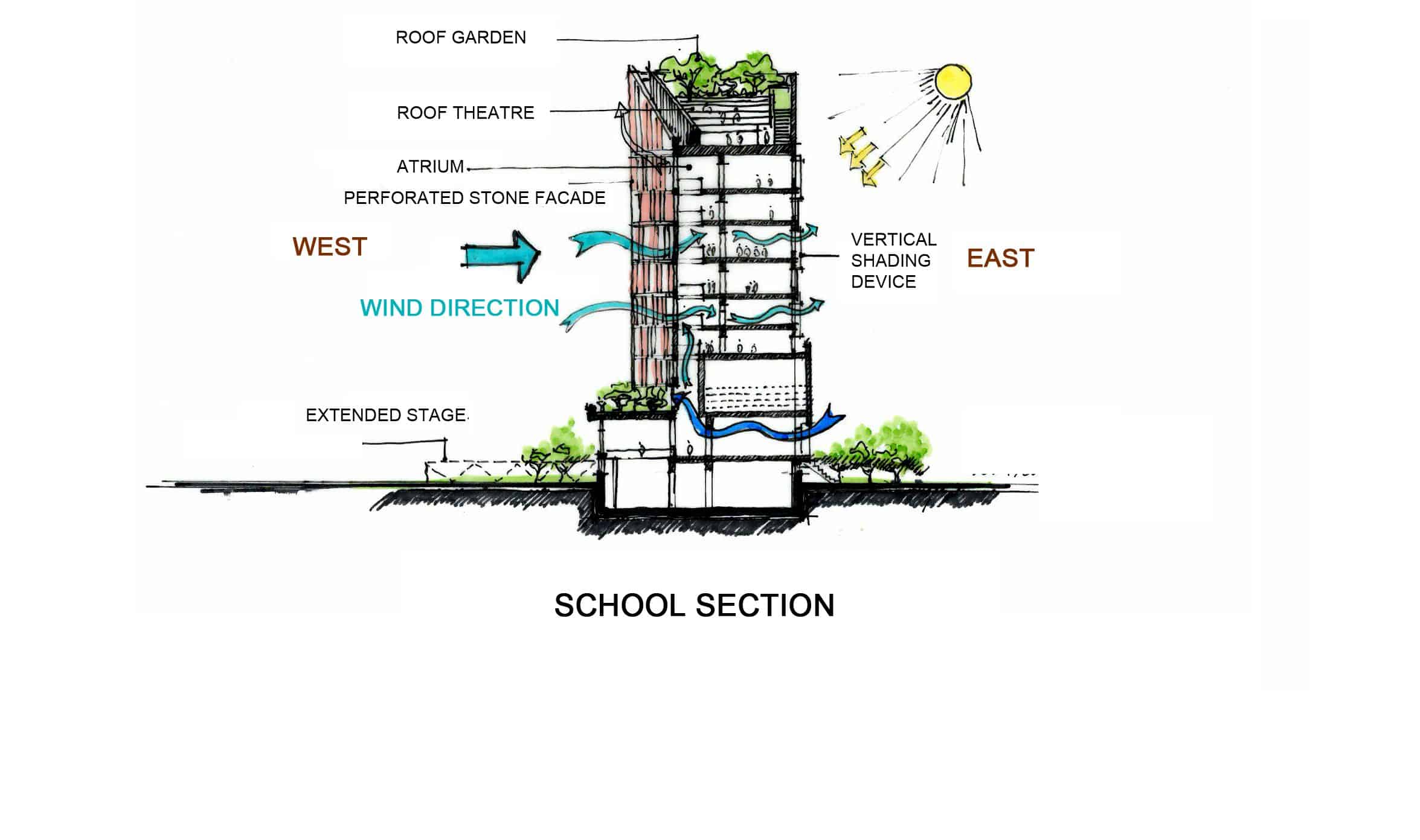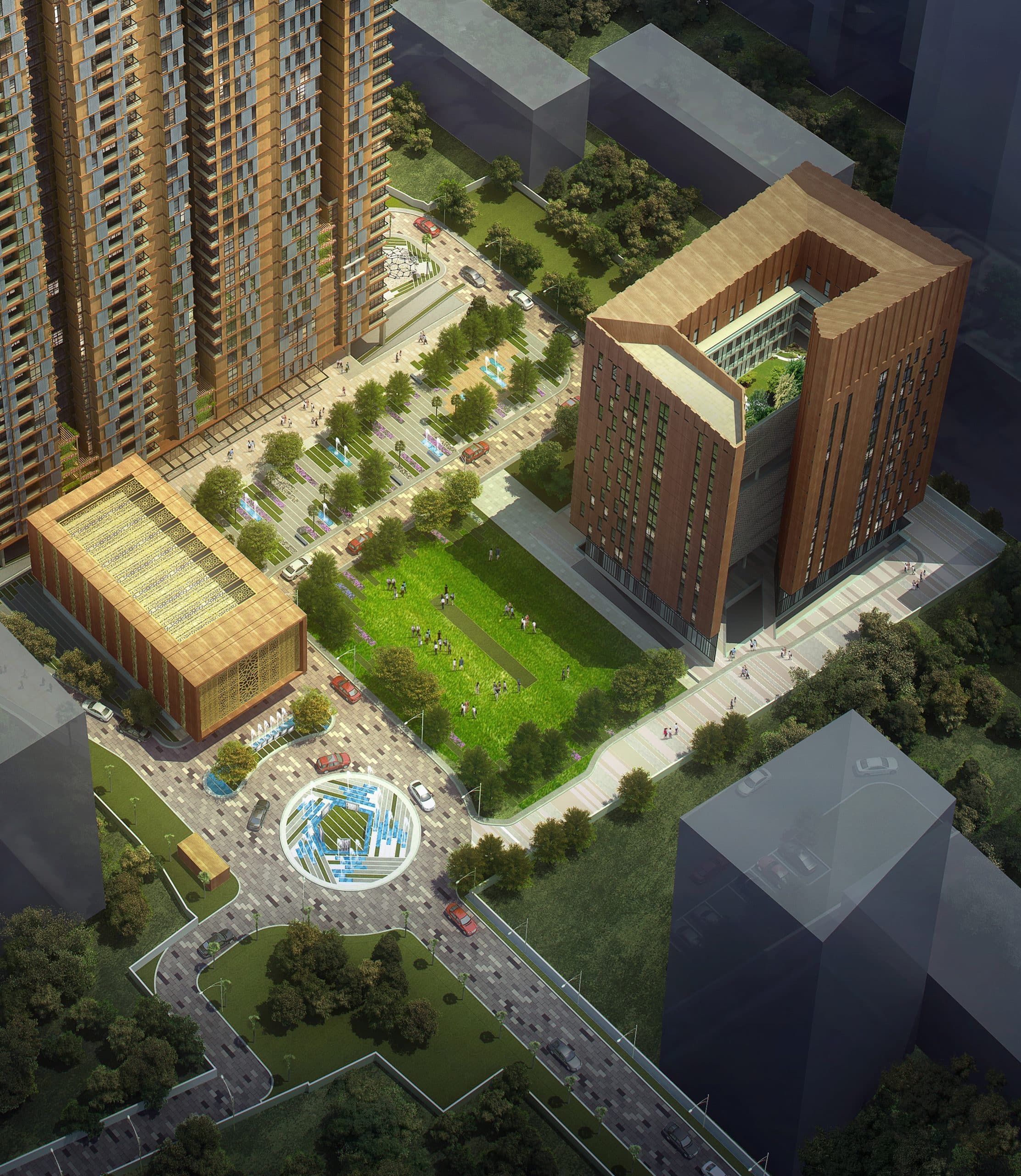 A nine floors high educational building having the Diamond Jubilee School on lower floors and a nursing institute on upper floors occupies the eastern end of the plot, with its grounds neighboring the central community garden. Classrooms are arranged at the periphery of each floor while the central portion Is dedicated to activities, topped off by a green terrace with stadium seating for events. The entire neighborhood is given a modern makeover with an efficient, cohesive layout equipped with the latest globally comparable infrastructural amenities and design experiences. But equal attention was paid to preserving traditional, socio-cultural and religious fundamentals at the core of the community