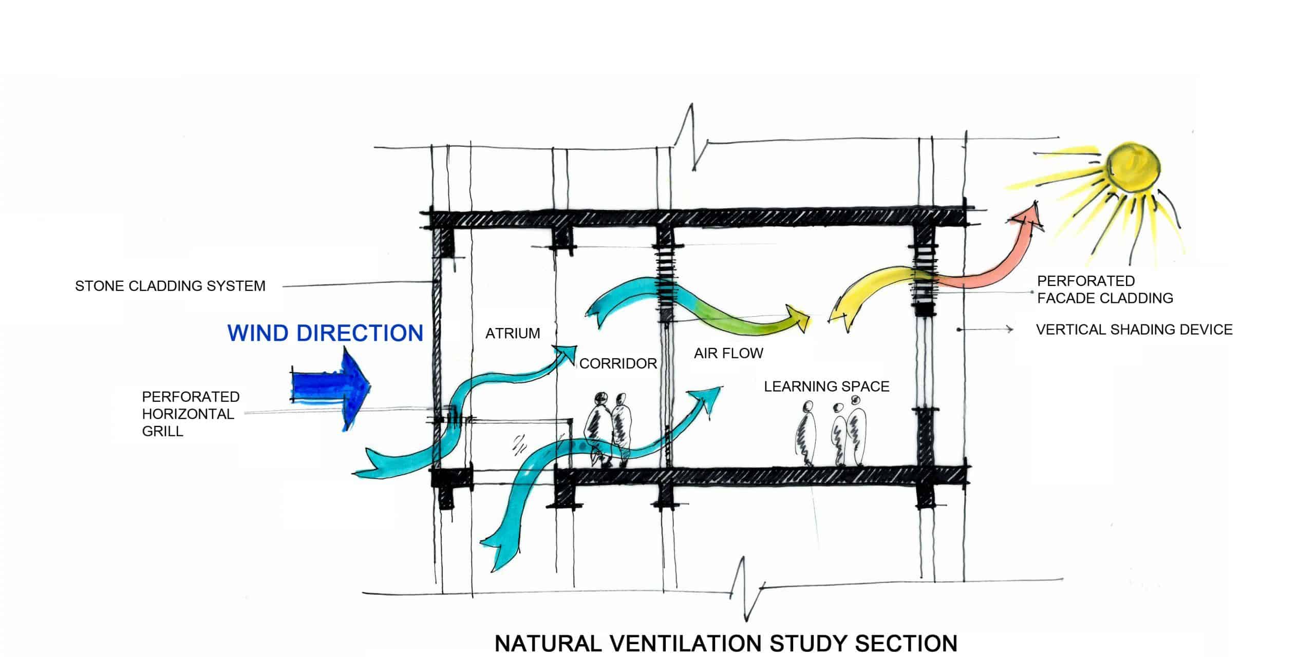 Two residential towers rise adjacent to each other at the northern edge of the site – a ground + 42 floors high tower to house existing tenants and a ground + 60 floors high tower with variously configured units for sale. Having a narrow, linear footprint and a high aspect ratio, these towers have a vertical hollow through their core to ensure cross ventilation through connected openings at intermediate levels. The green terraced tops of these two buildings step down gradually from west to east akin to a natural hill and explore views of the sea. The stone cladding throughout the facades is grooved to drain off rain water to instantaneously and the slab at every floor also projects out from the façade as a rain deflector.