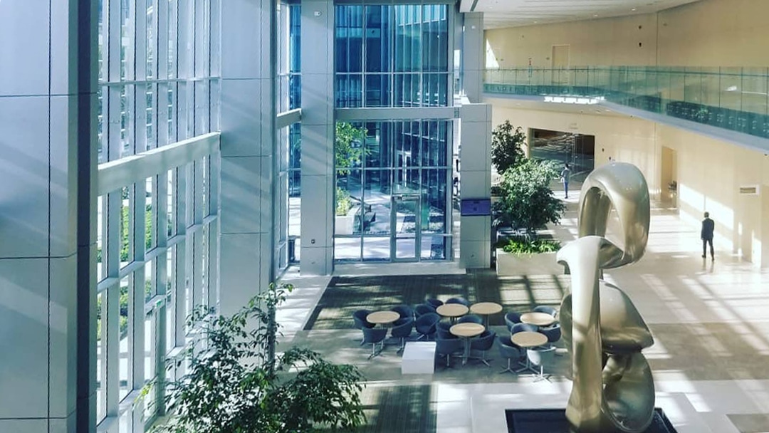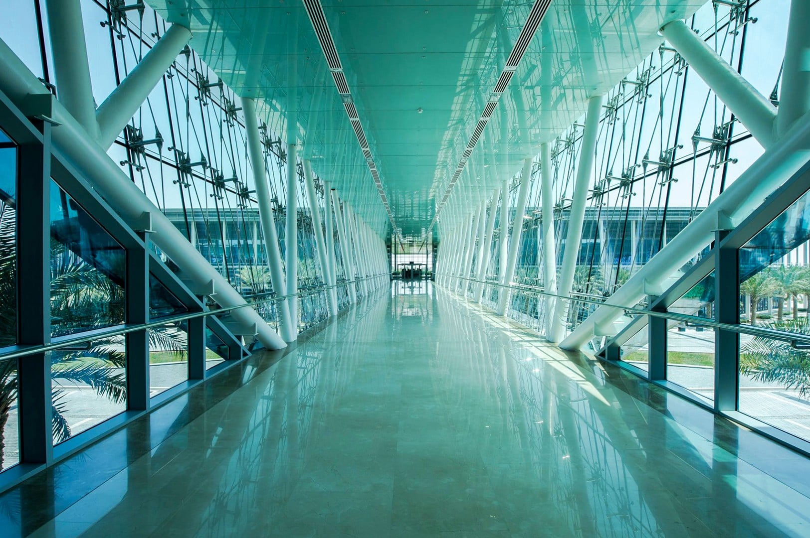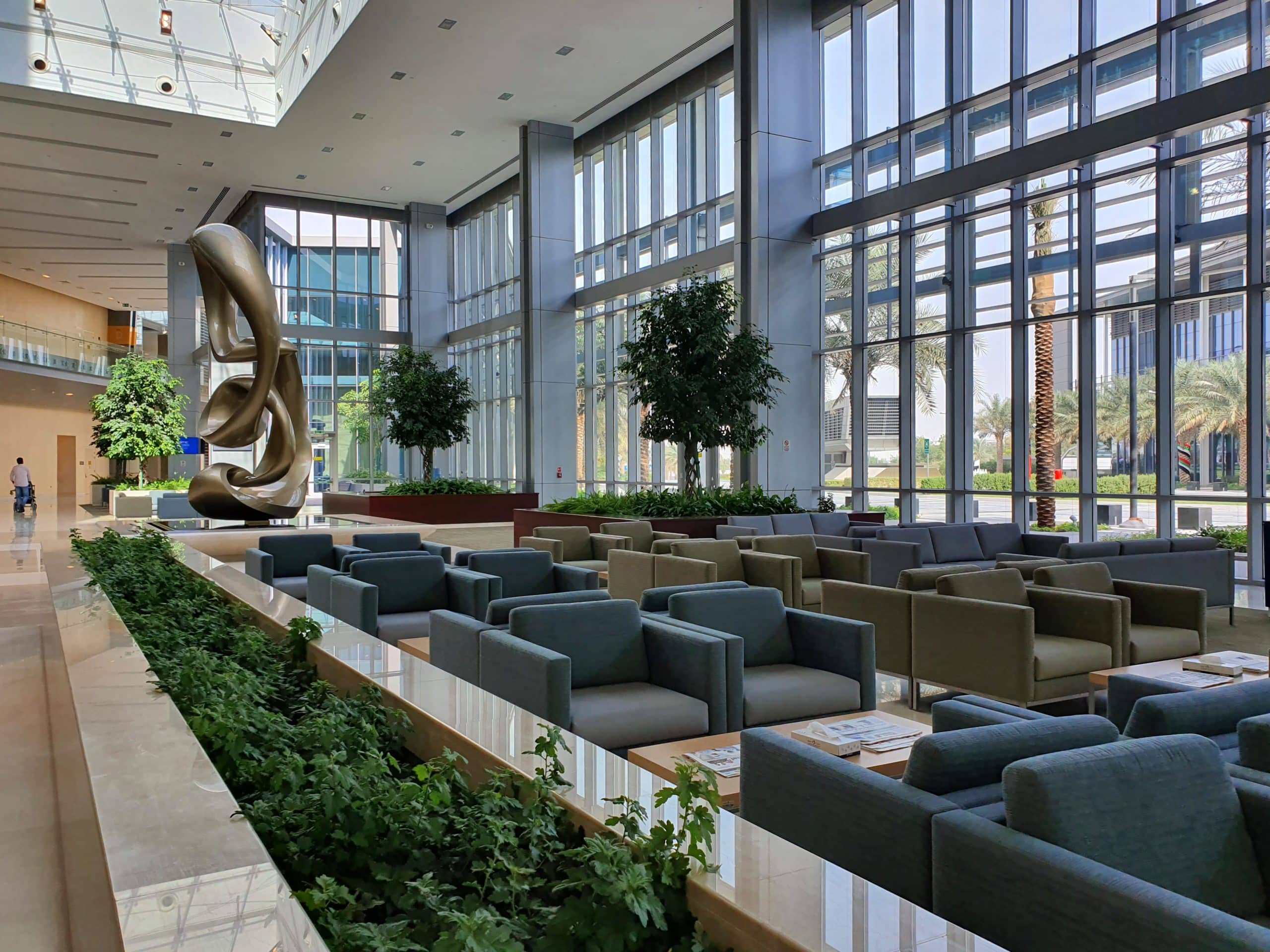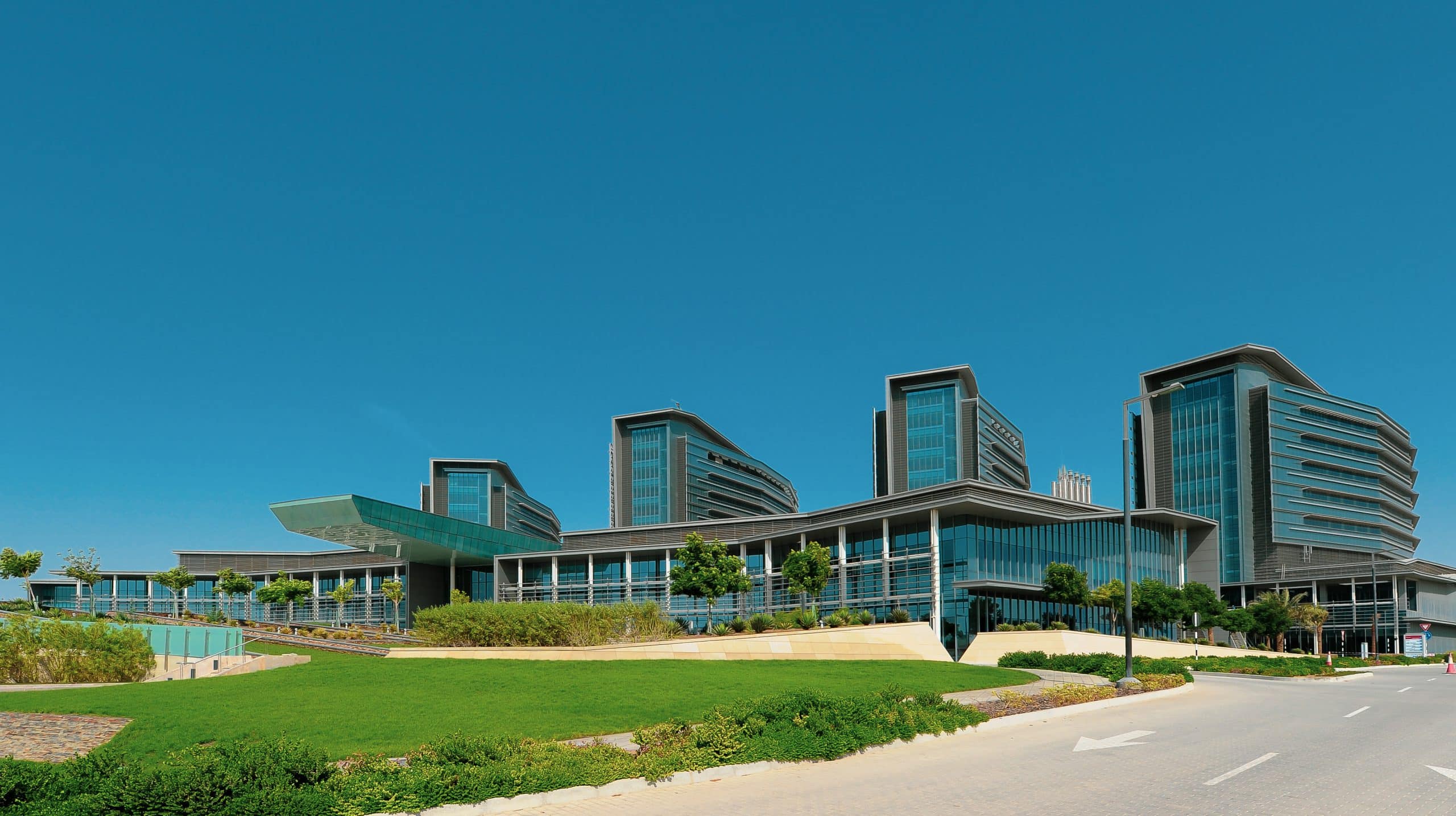 The climate-responsive design of the three-layered fenestration and façade system responds to Abu Dhabi’s harsh desert climate to create a comfortable and conducive working & healing environment within the building. A well-calibrated shading system ensures glare-free natural lighting and multiple layers in combination with low-E glazing cut the harsh heat at all times of the day.
