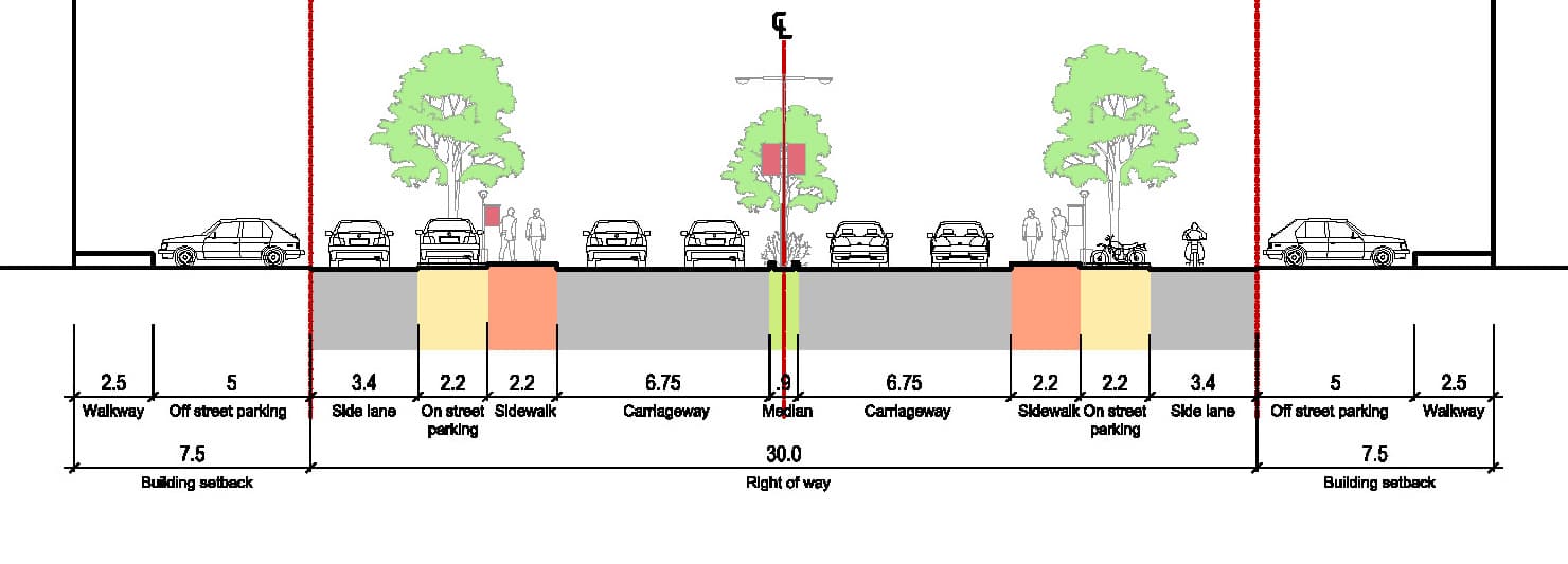 Apart from negotiating for agreeable solutions/relocations with encroachments lining the road edges and demarcating the extent of the road width with asphalting, sidewalks and walkways were inserted which helped define various functions of the road clearly in addition to facilitating unhindered pedestrian movement. Defined spaces were marked for on street and off-street parking as well as hawking zones allocated for vendors. The sidewalks were made wider and safer with ramps and shady trees planted.