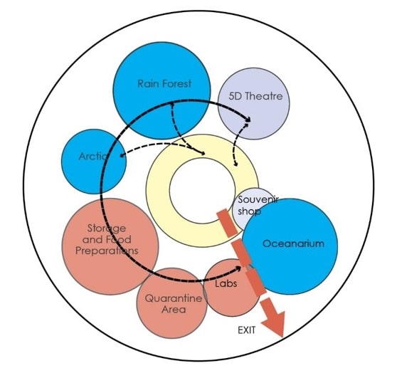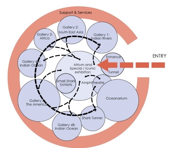 Being an inland site, the design for Aquatic Gallery came with its own challenges. The building, designed in a shell shape is intended not only as symbolic representation of the aquatic life, but also as a form that allows connectivity and free movement. The aquarium has three water types - fresh water, brackish water and salt water that are sequentially demonstrated by creating “water worlds”, by location. These are Indian Rivers, South East Asia, Africa, The Americas and Indian Ocean. Worth noting with emphasis is the importance of back of house spaces for the servicing of the tanks and associated living environments of the various species.