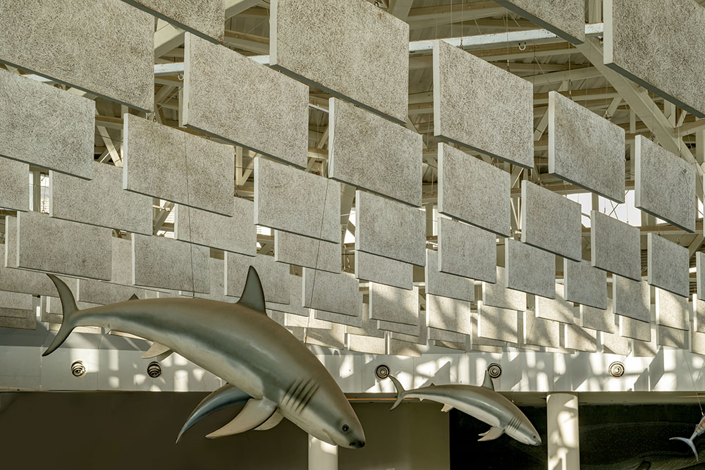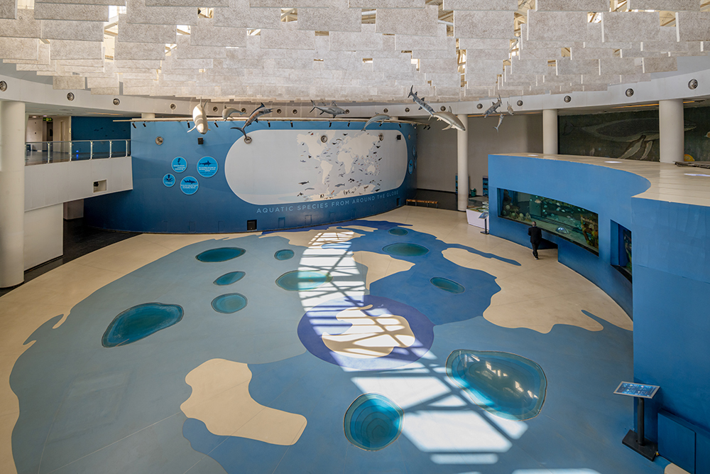 The western entrance reserved for support and service staff and goods ensures smooth, uninterrupted service and maintenance of the tanks and their inmates, and of filtration plants, labs, and quarantine zones. Sun shading ensured by higher southern wings, the atrium roof’s southward slope accommodating northern clerestory windows, and calibrated façade glazing – all optimize the heat-light balance. Sustainability is further ensured by use of solar panels, insulated roof, fly ash bricks and rainwater harvesting