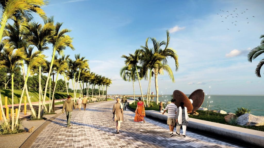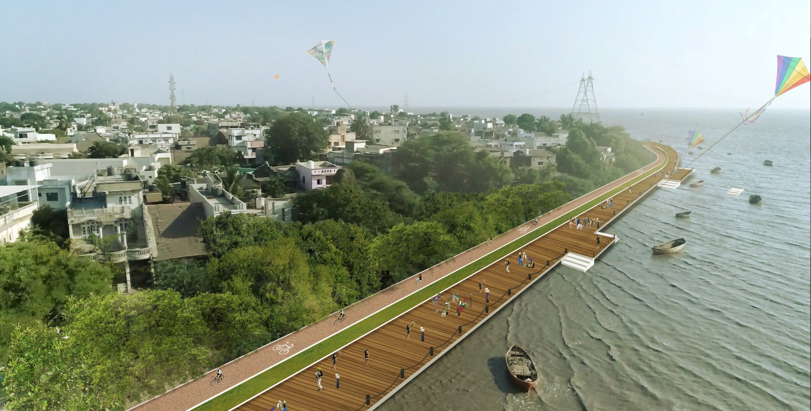 The site area under consideration totaling to more than 10,00,000 sq.km stretched out along the bending water edge suffered from poor accessibility and amenities and is also plagued massive tidal variations. The proposed design sought to create opportunities for ecotourism to encourage the conservation of ecological wealth like the mangroves and mud flats, take advantage of the proximal travel network links including the upcoming international airport to attract locals as well as tourists with a range of recreational opportunities, socio-cultural spaces and water-based activities. In order to achieve this, the master plan included buildings and a built environment, roads and other infrastructure, landscaping with soft as well as hardscaped surfaces and water features. The INI team also conducted stakeholder consultation, planned the appropriate integration of the coastal regulation zone (CRZ) guidelines and drafted the proposal for acquisition of critical land by the SMC.