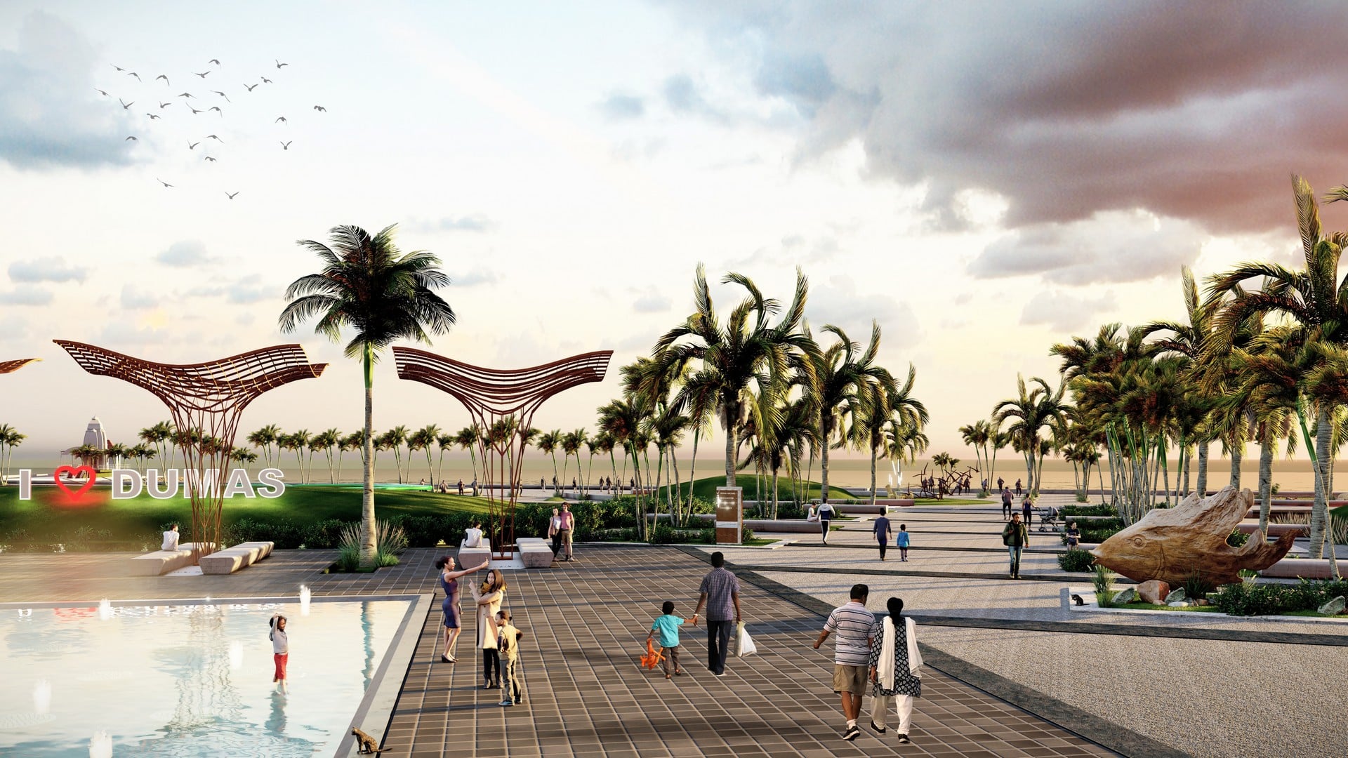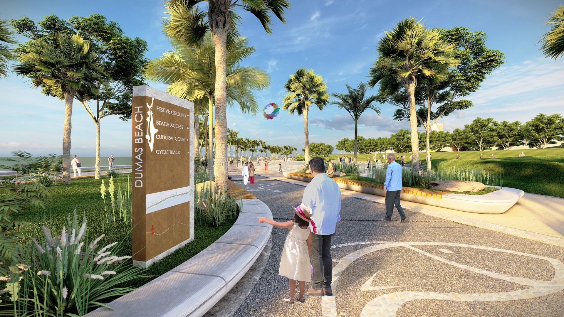 The master plan for the entire area was resolved in four zones in accordance with opportunities offered by the surrounding context. The Dariya Ganesh Temple is a religious destination built at the end of a singular road projecting into the sea marks the point where the shore-line bends forming beaches in two directions, a northward and an eastward stretch. This Temple road is widened and extended inland to create an access to the beach development connecting from the main city. The parcel of land (Zone 1) immediately north of this road has been developed as an urban hub with a plethora of gardens, plazas and buildings hosting recreational and tourism activities. Further north (zone 3) is the forest and ecotourism zone with wellness facilities, and still further beyond Goras Gamtal, around Dumas Port (zone 4) is the boat and yacht club with board walks and cycling and walking trails lining the entire shoreline. The stretch immediately east of the Dariya Ganesh Temple road is an eco-sensitive zone with a swamp and mangroves. This has been made into a facilitated nature camping site for locals as well as tourists.
