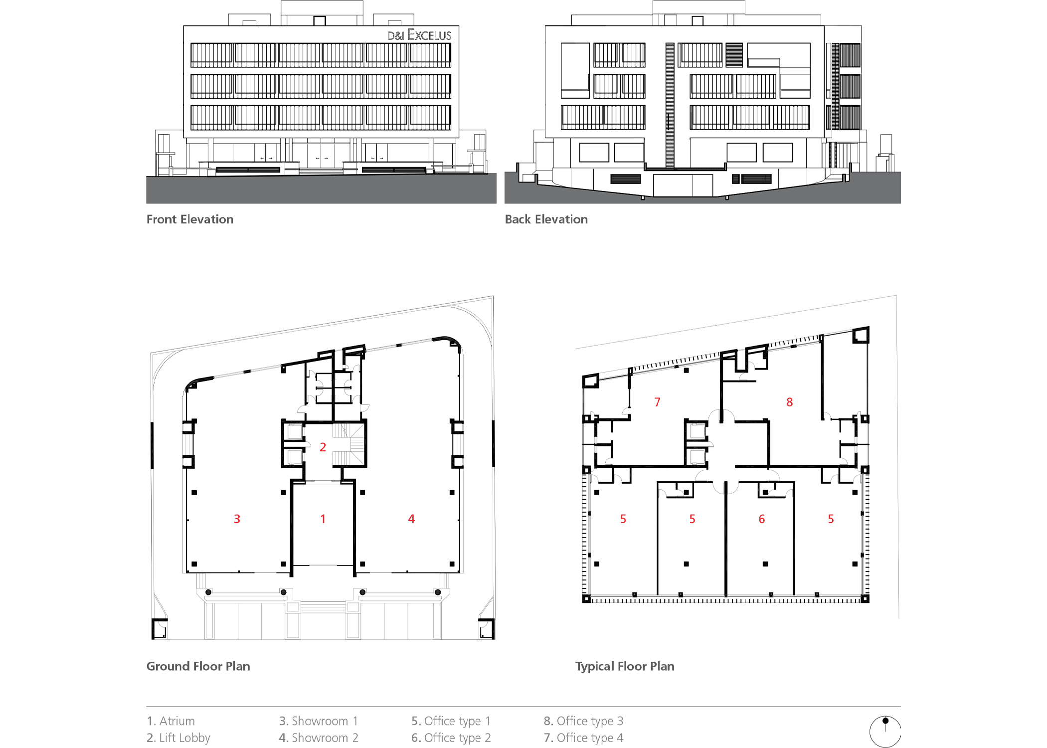 The architecture is elegantly minimal, defined by a clean-lined geometry within a large span structural framework that creates efficiently serviced vast usable interior spaces. A grand reception lobby on the ground floor is flanked by two large retail showrooms on either side, while its double-height atrium creates an impactful interior volume at arrival. A space-efficient elevator and staircase core at the center of the plan gives proximal access to offices on three upper floors. An operable glazed façade with laminated glass fins and terraces carved into the mass let natural light and ventilation enter every office space, irrespective of size or placement. Utilities like washrooms and pantries are neatly inserted in the space behind the elevator lobby resulting in a compact consolidation of all services.