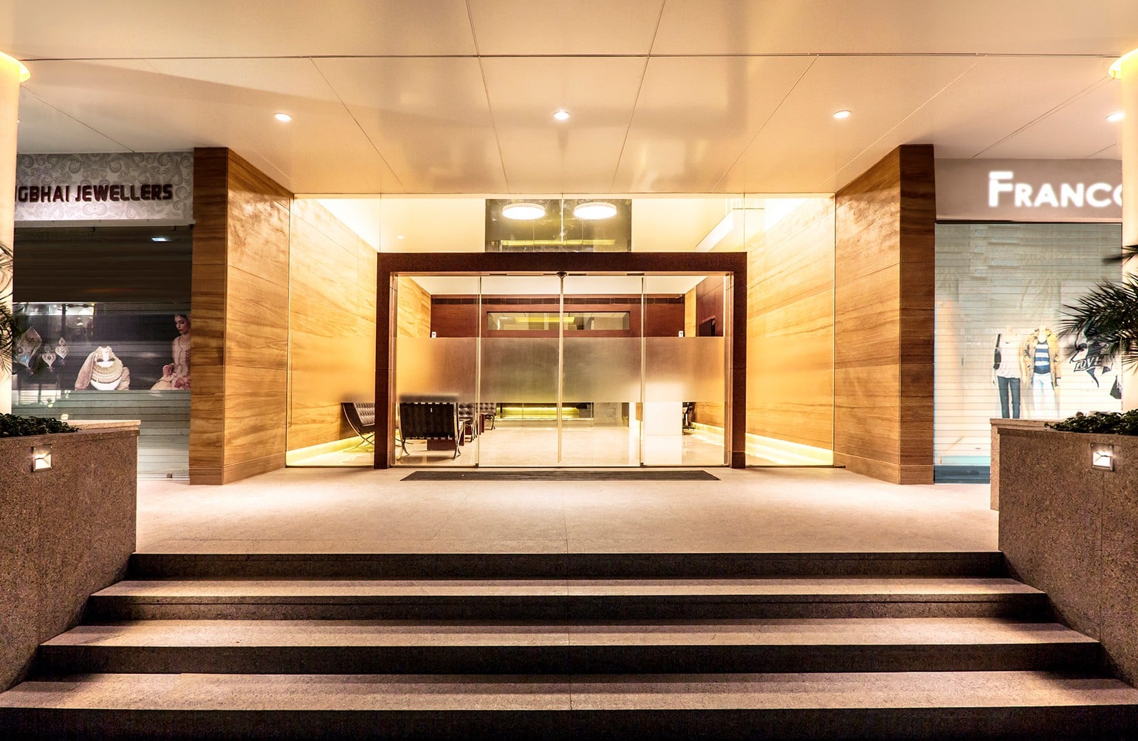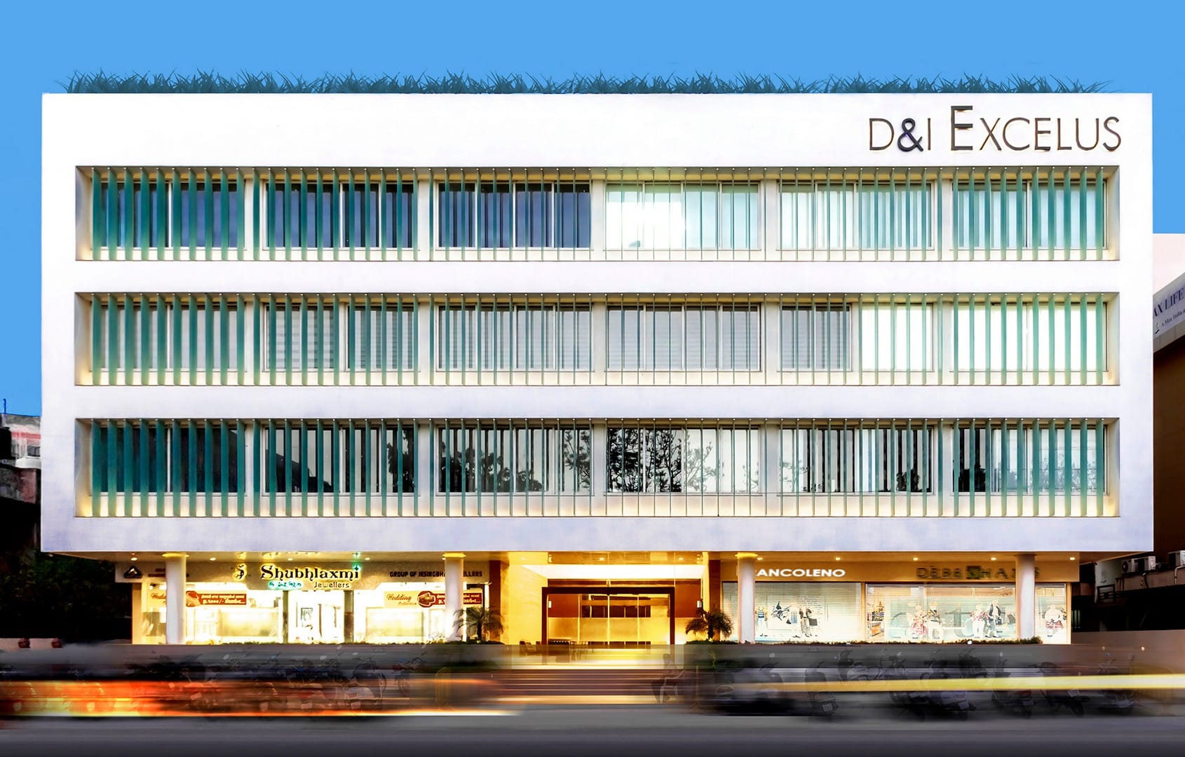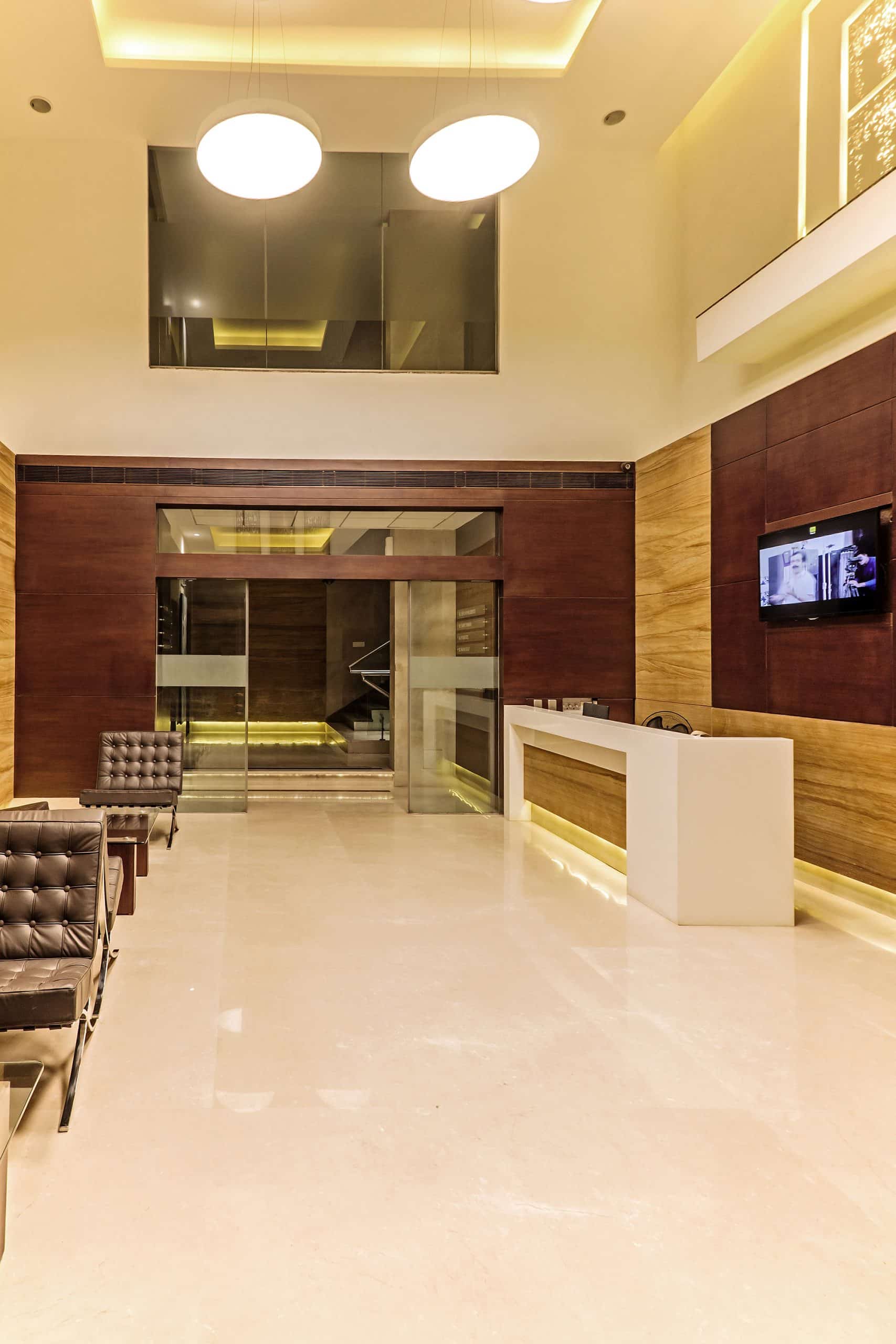 The building is intentionally calm and elegant in contrast to a varying Bhavnagar streetscape, with linear and symmetric opening treatment of glass louvers. These are recessed as long slits within the solid mass of the cubic building. The efficient layout, with varied sizes of retail spaces and offices, was designed with the intention of catering to and providing for the elite corporations, banks, multinational companies, and international retail brands. A plush foyer, elegant and