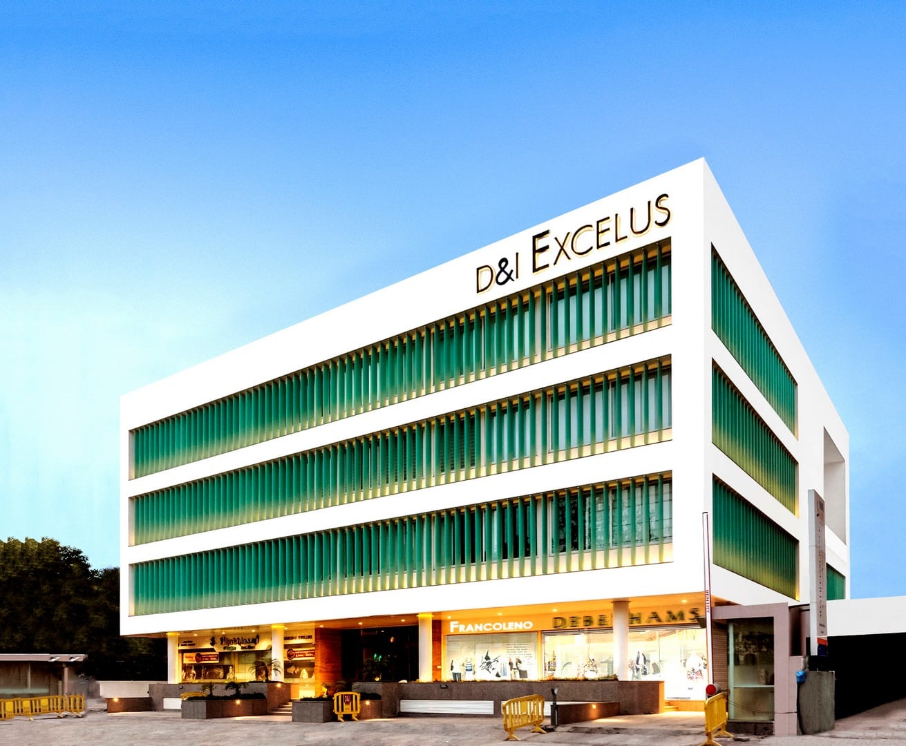 Advanced information and communication technology at par with the global best has been employed to enable businesses to be in step with their international peers. A pillared portico on the ground floor that gives a shady recess to the glazed shop-fronts and vertical laminated glass fins lining the glazed façade of the office floors above retarding heat and glare to offer comfortable natural light and ventilation to the interiors are some of the passive measures employed to create a future-ready LEED Gold certified sustainable building.