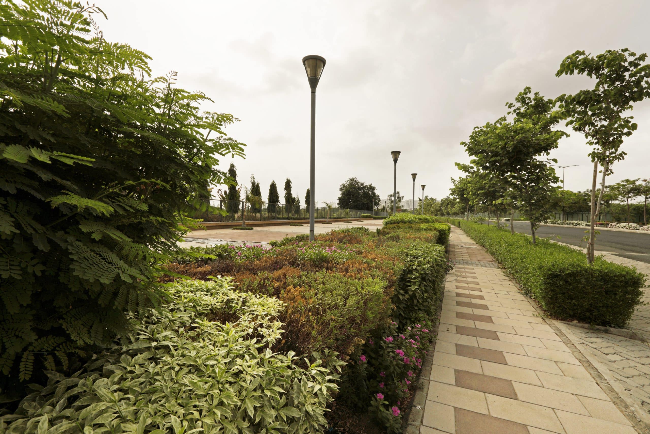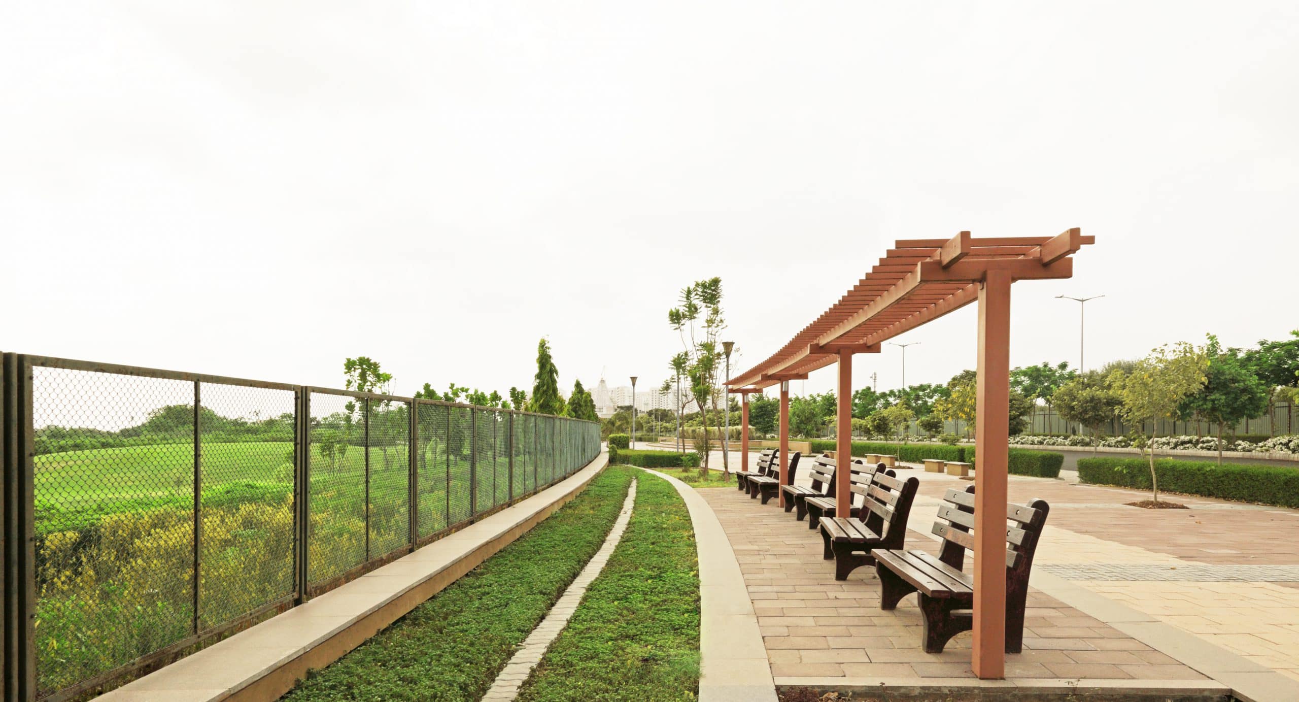 As the central open green of the Shantigram Towship, the 9-Hole Golf Course spread across 69 acres extending from the rear end of the Belvedere Golf and Country Club is also the social focal point of the community. The 1.5 km stretch of a pedestrian promenade that runs along this golf course expanse on one side with the main arterial road of Shantigram abutting its other side creates the perfect opportunity for various social and age groups to gather recreationally. INI has enhanced the promenade’s value as a social space through its sensitive planning and landscape design that makes it attractive, vibrant and comfortable for all members of the community to use it as a social and recreational open space for gathering, walking, jogging, biking and watching the sporting activity on the golf course.