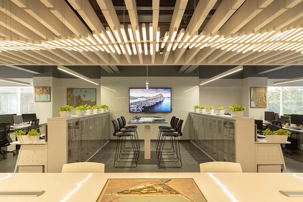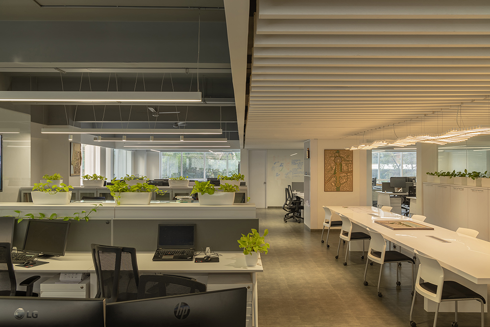 The design is minimalistic which exudes elegance and sustainability through a paucity of colour and material, attention to detail and use of high-end, eco-certified materials and furniture. The plain grey tile flooring and a calming palette of soothing whites creates an atmosphere of tranquillity and focus, promoting a clutter-free environment where ideas flow unimpeded. This minimal color palette is enlivened by abundant indoor plants and the subtle warmth of wood furniture. Lighting is provided through an eclectic combination of inobtrusive ceiling-mounted and hanging fixtures, as well as some custom-made fixtures that double up as pieces of art, all integrated seamlessly with the ceiling design.