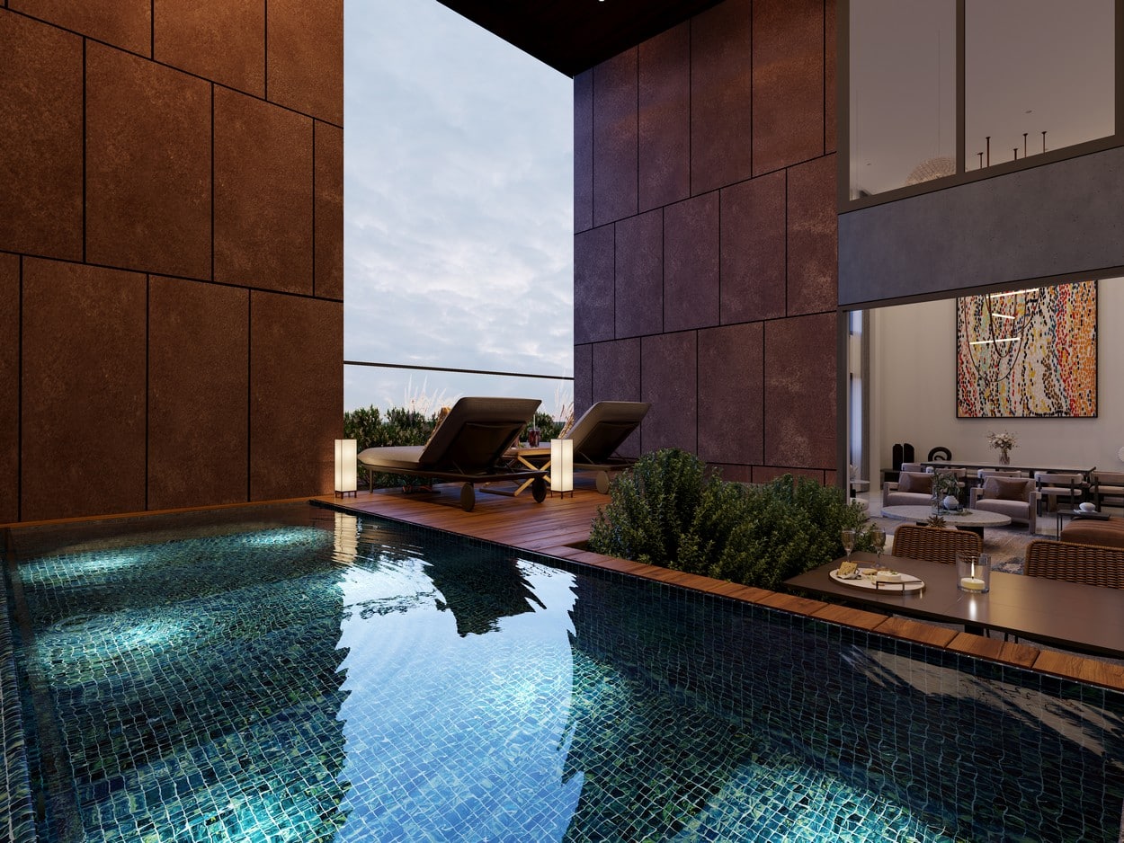 Harnessing the splendour of the surrounding landscape, the apartments have been thoughtfully designed to provide awe-inspiring views. Whether it be the captivating city skyline, verdant expanses of lush greenery, or idyllic natural landscapes, residents will find themselves immersed in a panorama that captivate the senses. Expansive windows and inviting balconies ensure an abundance of natural light within each apartment, creating an ambiance that is both serene and rejuvenating. The four exclusive penthouses have been provided with private pool and double height living spaces overlooking the tranquil panoramic views.