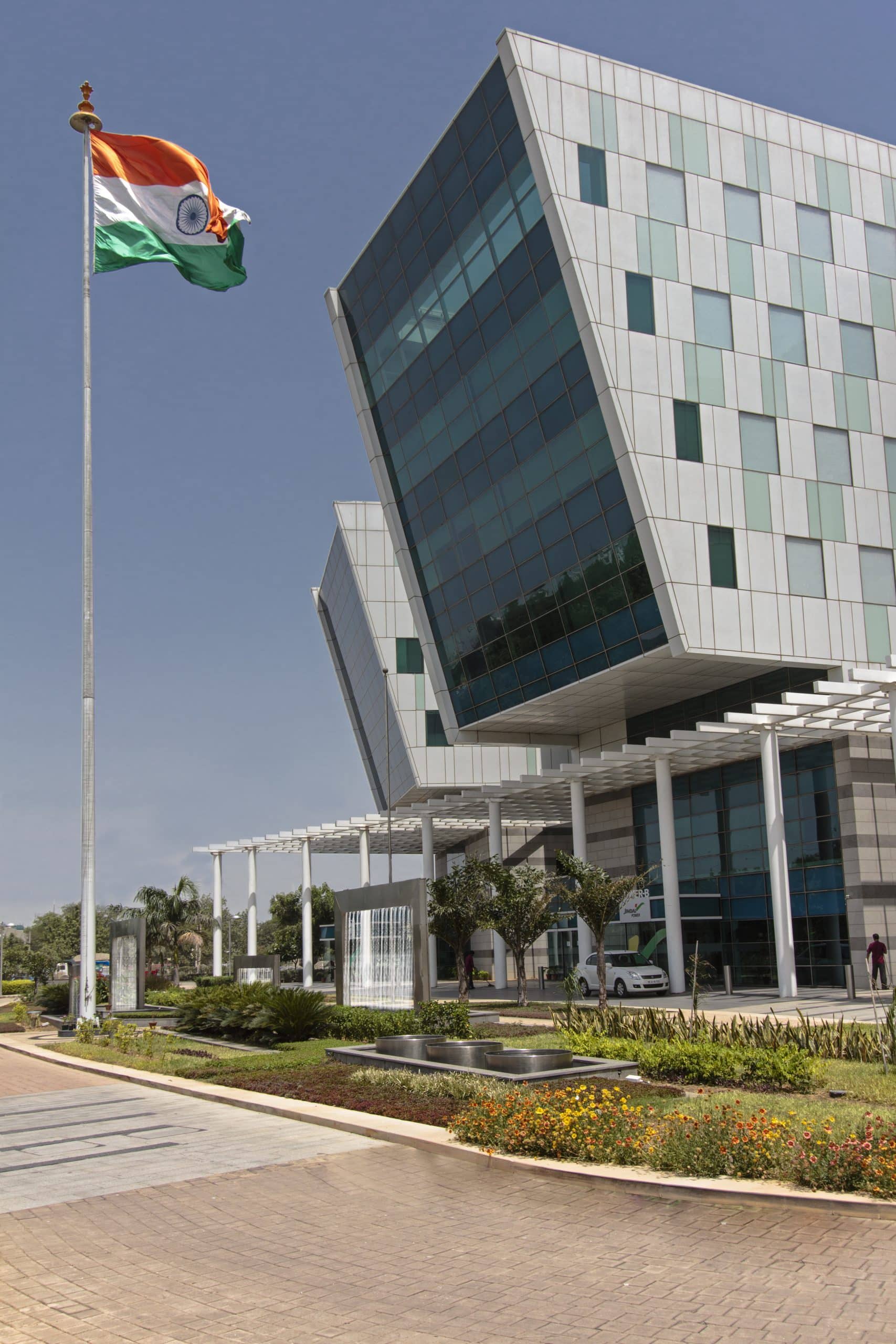 The Jindal Centre located at Gurugram in the National Capital Region is a corporate facility housing the offices of three of the Jindal Groups companies, i.e. JSW, JSPL and JSAW. The architectural articulation of this steel industry giant’s triple concerns comes to life in this three-faced modern corporate structure clad in glazing and composite panels. Essentially laid out as three towers/ wings rising from a common base structure, they appear on the façade as three individual inclined glazed faces. Upper portions of each wing being only 4 (side wings) to 5 (central wing) floors high gives them a horizontal dispensation in the side elevations, as do the cladding bands on the base structure, setting the building apart from the corporate tower typology. The floors in the base facilitate reception, lift lobbies and atrium for all three wings and support amenities. These are fronted by an elegant pergola-covered porch which is further preceded by an elaborately landscaped arrival court greeting visitors & staff as they enter.