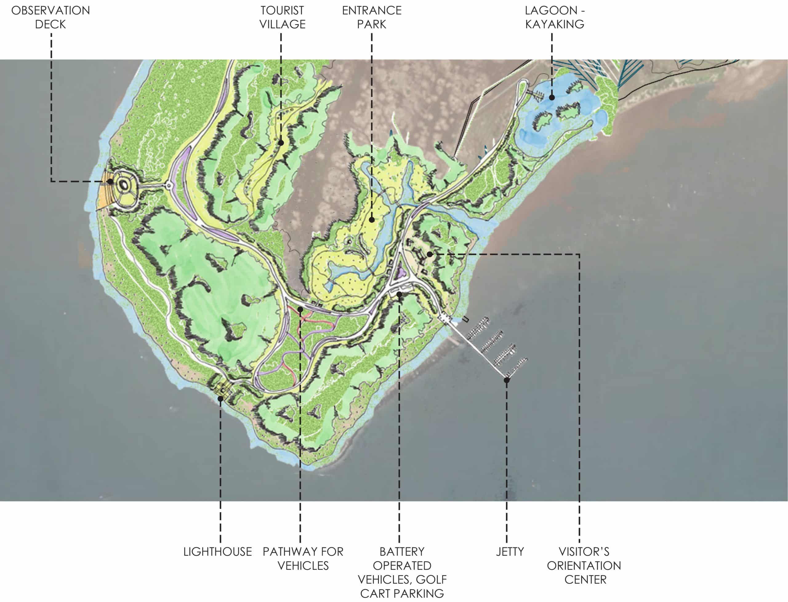 Generating the tourists’ confidence, attracting them to this eastern coastal destination needed lending it a sense of place. At the Kakinada Beachfront location, a ceremonial entranceway provides access, leading down axial twin roads flanking a lush parkway to an iconic water-borne sculpture park. Provision of infrastructure to support an Aquamarine park, amusement park, wax museum, convention center, hotels, retail and food outlets lend urbanity to this destination. The ensuing public plaza with shops and an amphitheater facing laser shows build up the tourists’ mood before taking the board-walks and pathways ahead to explore the more pristine aspects of nature on the coastline.