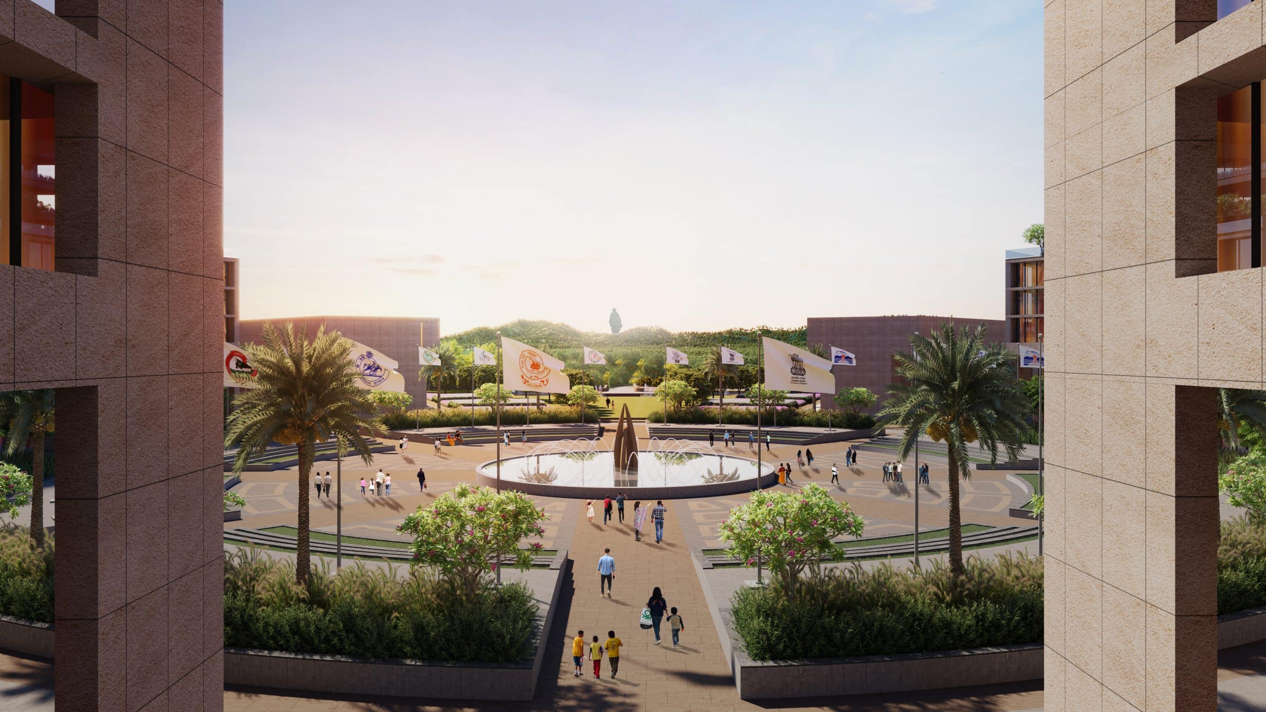 The buildings in the complex allow for luxurious and lavish courtyards that are shaded for most part of the day. Along with this garden terraces embedded in the form of the building help in reducing the heat gain. The design proposes to revive site elements and enhance it using natural contours and landscape. With sustainable strategies and a new way of looking towards national tourism the campus emphasizes the value of statue of unity and uplifts the tourism of Kevadiya gam, giving it world class infrastructure and facilities right in the lap of river Narmada.