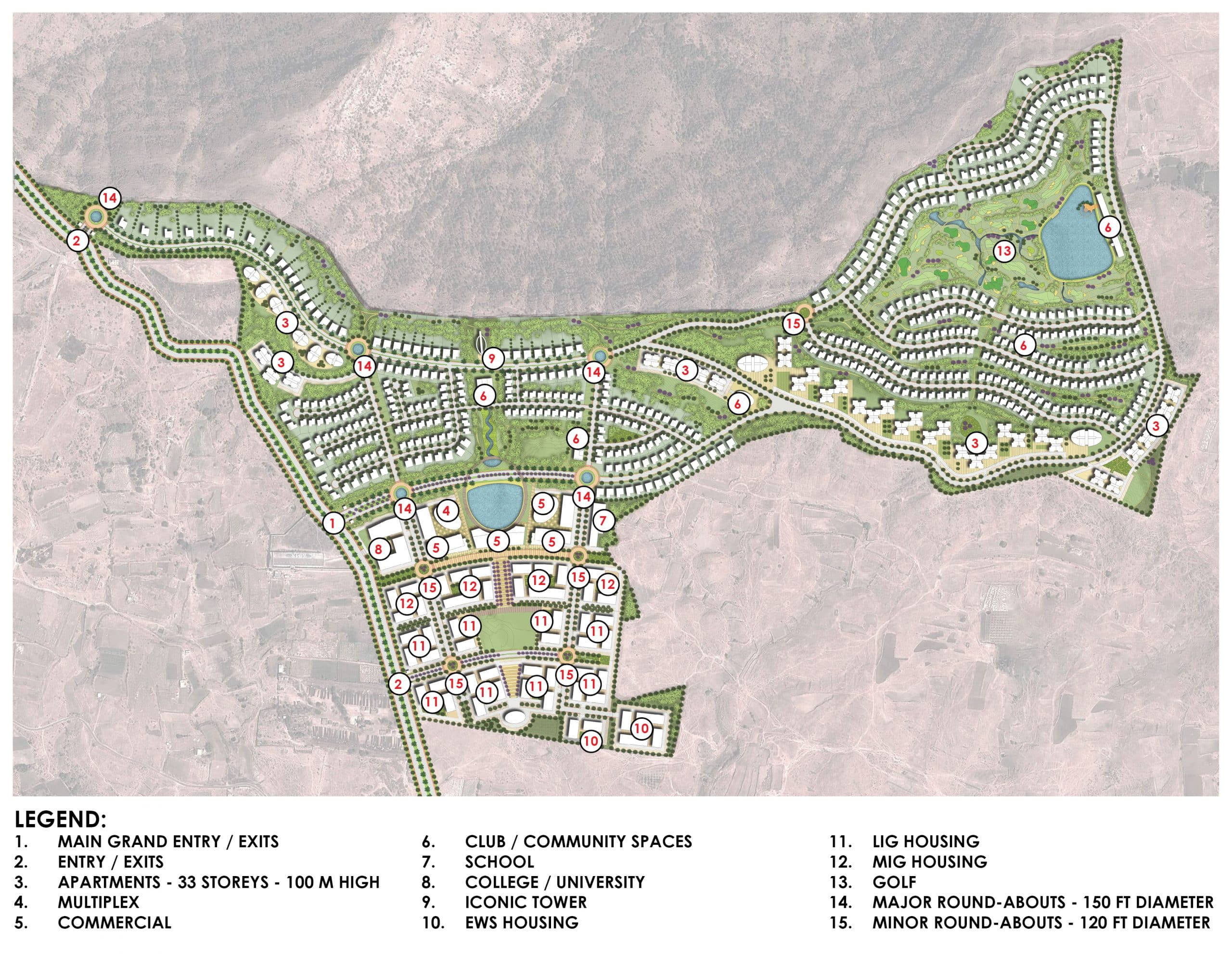 The undulating site of 250 acres located roughly along the north-eastern edge of the Pune-Khondva Highway is surrounded by lush hills with a panoramic view of Pune city opening out to its north. The project brief intended to create a comprehensive township containing residences, hotels, shops, schools and hospitals in the midst of the prevalent beautiful natural setting. The INI team’s masterplan works with the concept of neighborhoods offering a cohesive community life abounding with experiences connecting with Khondva’s rich biodiversity in a variety of ways.