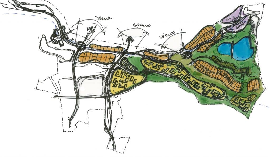 The entire main vehicular road which traces the northern edge of the site, starting from the entrance gateway up to the eastern turning around the lake offers breath taking views of the verdant site surroundings nestled between hills. Hence, this road is lined by a boulevard which opens out vistas at frequent intervals, including a viewing tower forming the terminal of the north-south green spine and connecting with a zip-line to the town below. The residential neighborhoods are planned in a pattern which traces the natural contours with the low-rise houses at the lowest elevation, mid-rise buildings at intermediate terrains and tall apartment buildings along the highest ridges. This allows lowest points like the lake to view the entire built-scape in a gradually rising elevation and also enables all the residences to enjoy unobstructed panoramic views. Weaving a network of green walkable trails through a minimally invaded natural ecosystem creates a permanent habitable green commune for the residents while conserving the region’s rich biodiversity.