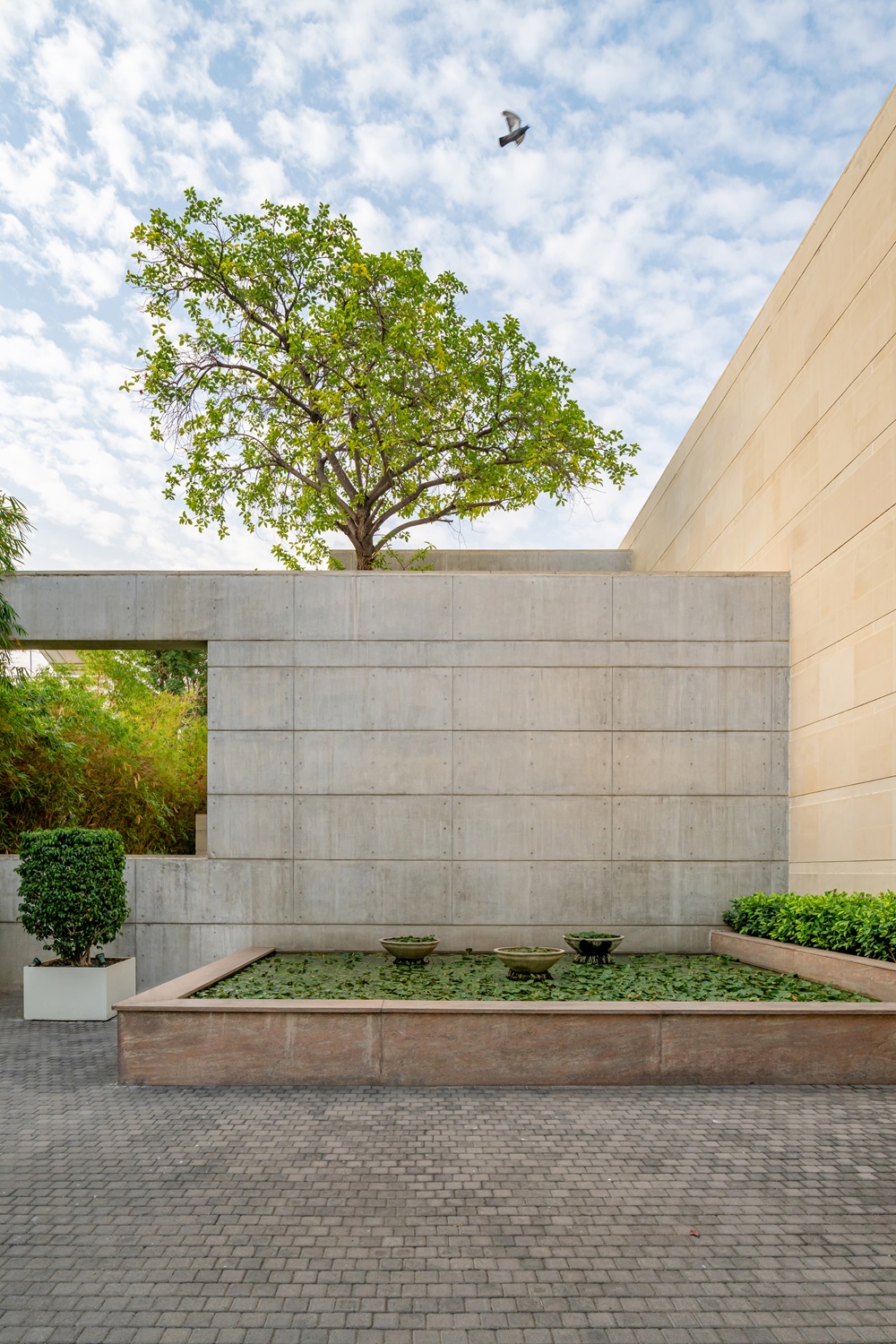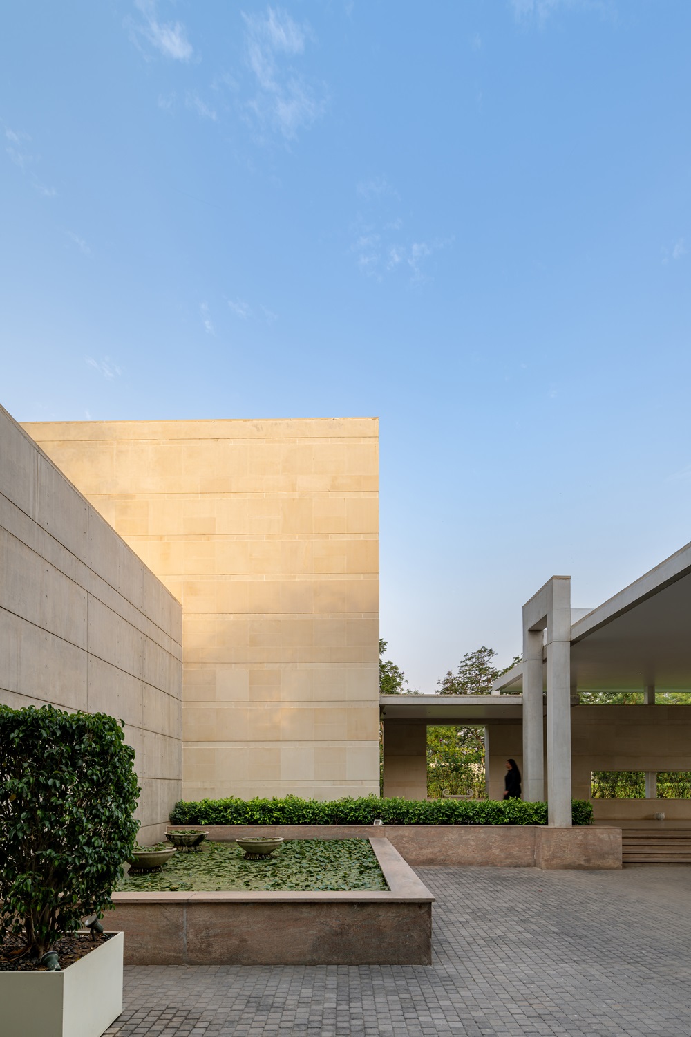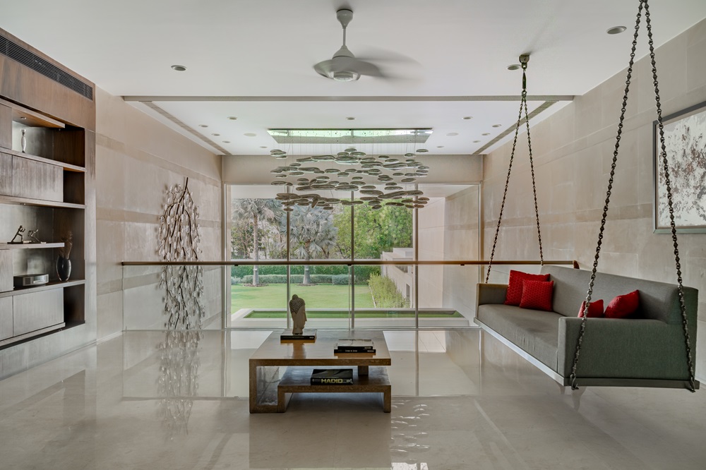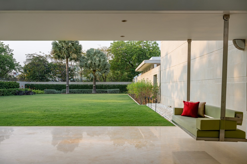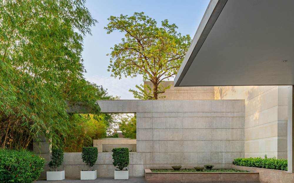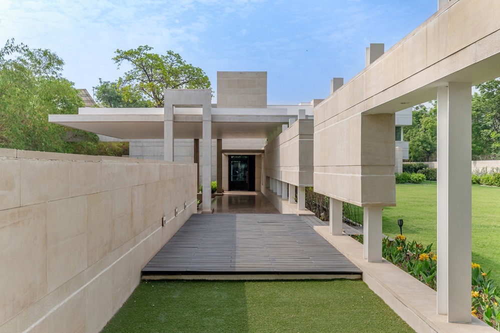The Lakhani Villa, in Ahmedabad, embodies the concept of ‘Tranquil Modernism’, blending timeless contemporary design principles with serene, nature-integrated living spaces. With an aesthetic featuring a clean geometry and uncluttered spaces, it provides a sanctuary from the urban chaos. The beige and white sandstone and exposed architectural concrete, complements the minimalist design. Expansive shaded glazing, spacious balconies, and landscaped courtyards and lawns integrate the indoor and outdoor spaces, fostering a profound sense of harmony with nature.