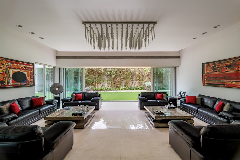 An expansive entrance plaza, covered by a sweeping canopy welcomes visitors with grandeur. A linear wall, punctuated with strategic openings, shields the garden from view, creating an intriguing visual element. The linear double-height vestibule that leads into the home serves to divide the public and private areas, its starkness artfully interrupted by interesting murals, adding artistic flair. Inside, the living and dining areas open into a large garden through floor-to-ceiling glazing system, enhancing the indoor-outdoor connection.