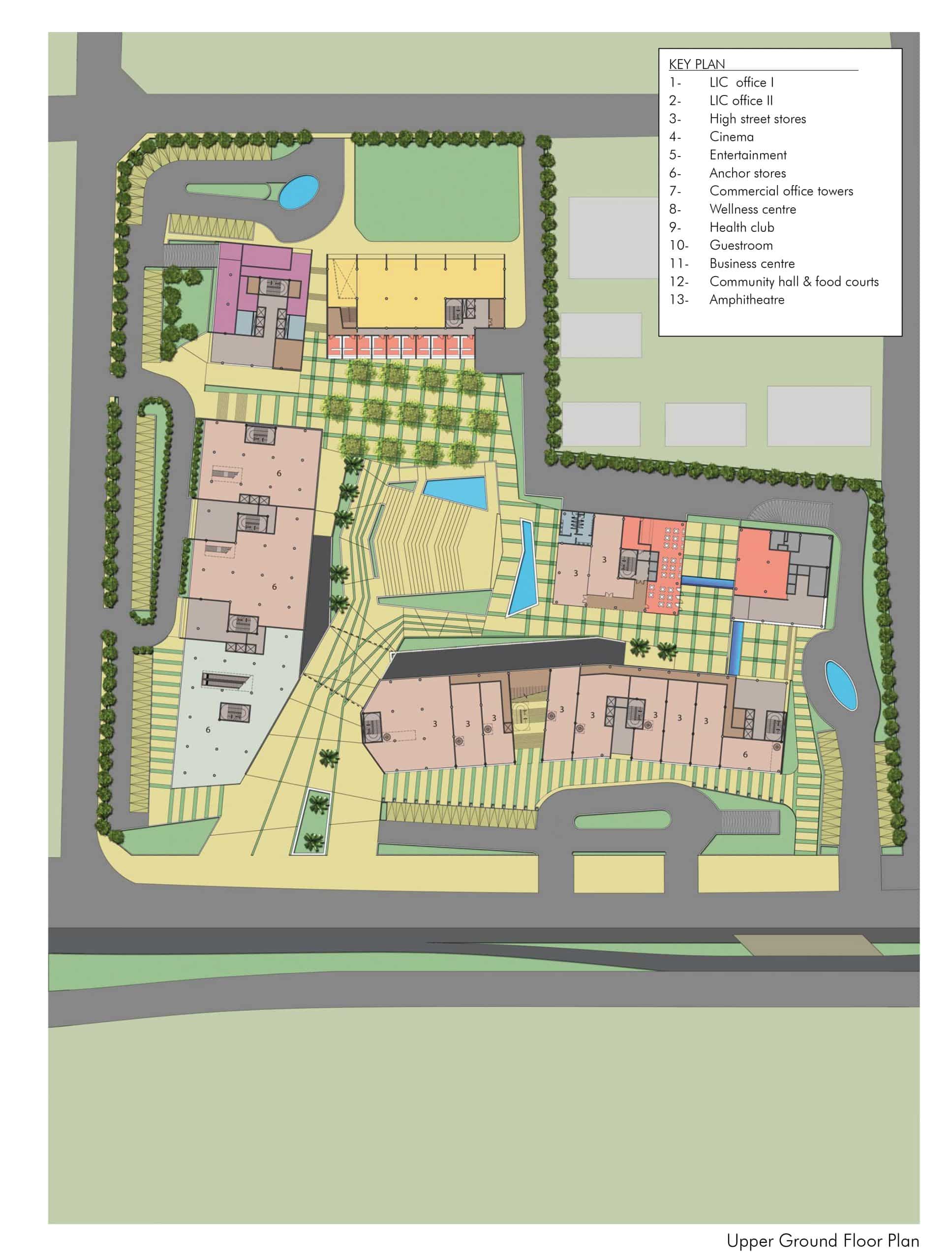 Three floors onwards from the lower ground carry various retail & commercial activities in six respective towers placed around a landscaped podium plaza, above which seven floors in each of the towers house offices including LIC office towers lodged on the eastern face. Two basement levels provide ample parking for all office and retail/ public facility users.