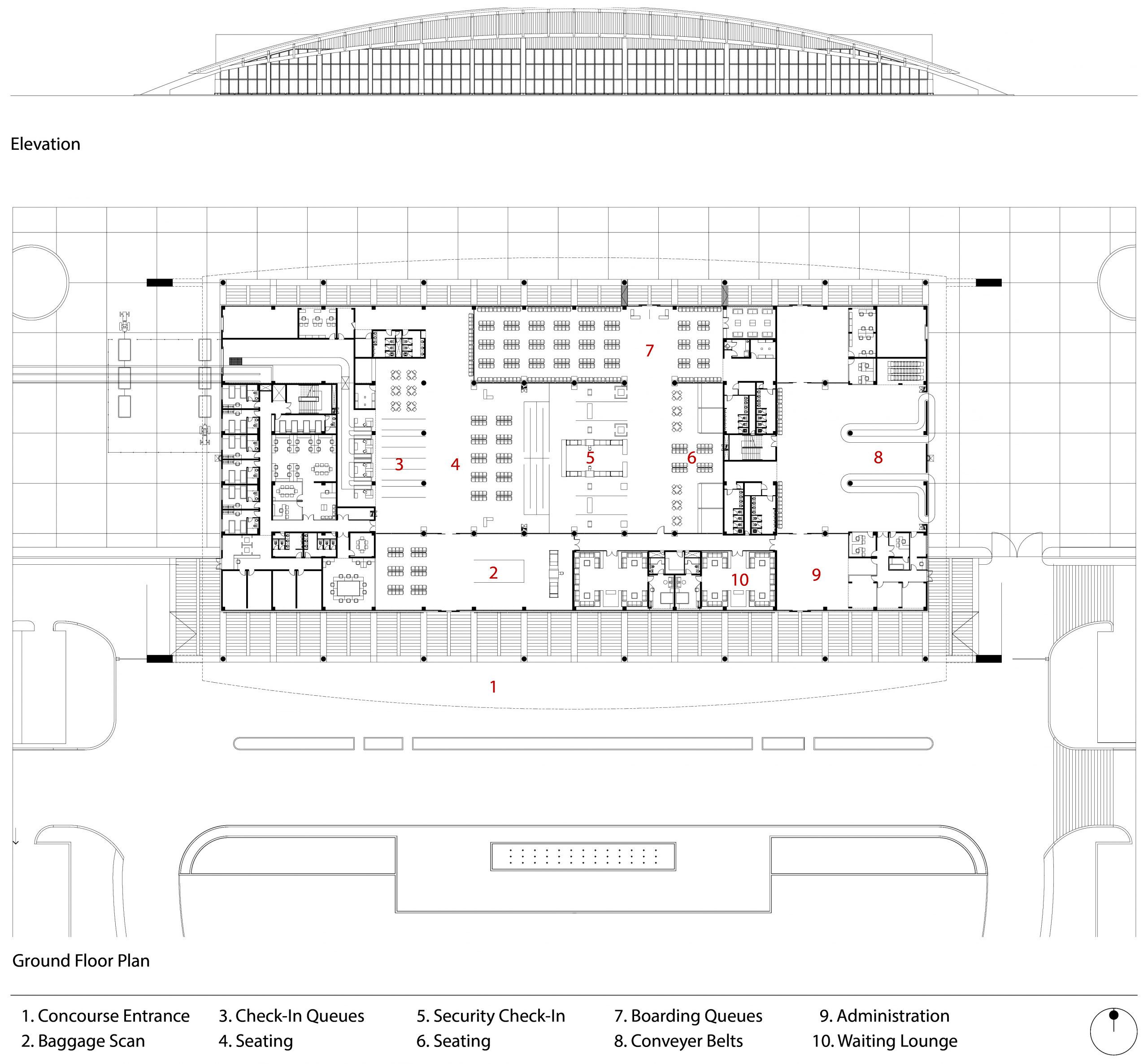This modestly sized air terminal is laid out with clear functional zoning to perform with optimal efficiency. A large forecourt facilitates a clear driveway, drop-off/ pick-up bays and ample segregated parking for both, arrival and departure facility users. The building itself is clearly divided into two functional parts, the larger northern part for departures and the southern one for arrivals. Within each part, the sequence of inherent procedures, starting with baggage screening and ending with the holding lounge near the gate for the departures and starting with baggage claim and ending with cab booking/ immigration counters in the arrival section, are laid out along clearly demarcated, uncluttered paths. The flow of passengers as well as baggage through the required screens and checks is well defined and each section is amply provided with restroom and refreshment facilities.