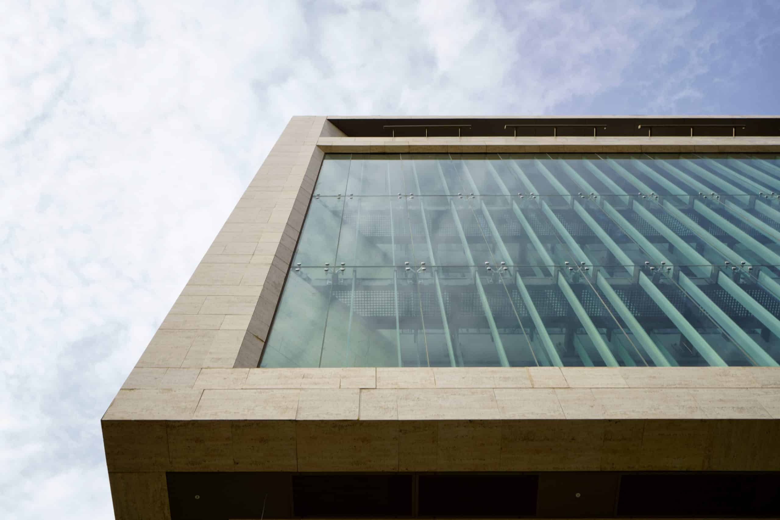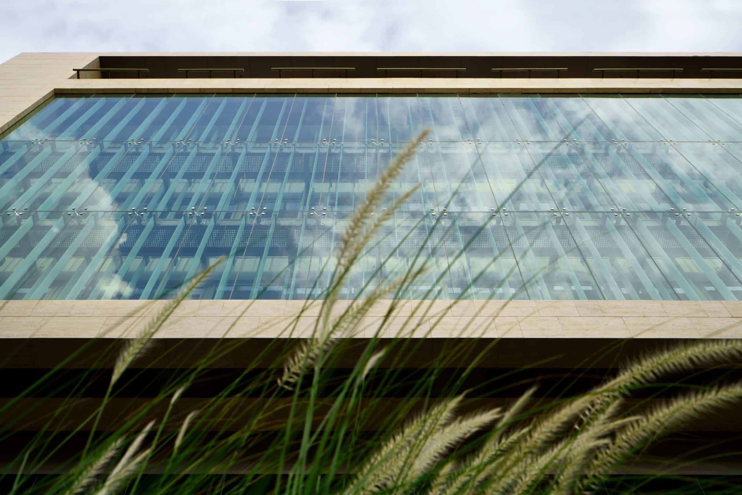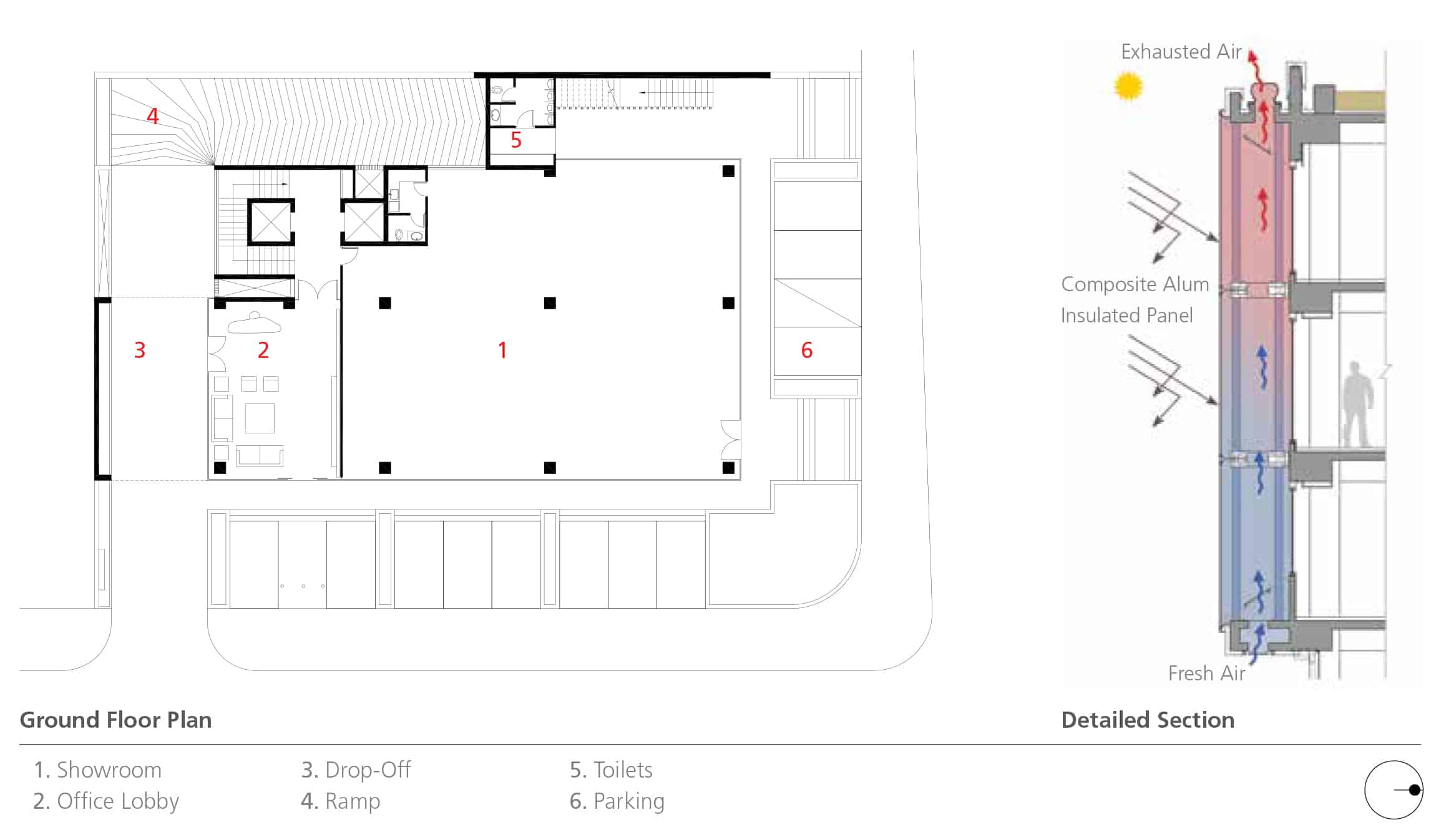 The building envelope sports a double skin glazing with perpendicular intermediate glass fins between the two glazing layers to allow ventilation while filtering the harsh sunlight and naturally venting out the radiant heat through a draft effect. This was a pioneering introduction of this technology in Anand’s architectural landscape. Other strategies of passive and active climate response as well as water and energy management incorporated in Om Espier secured it a LEED Gold rating.