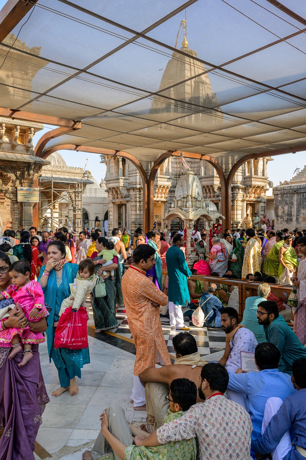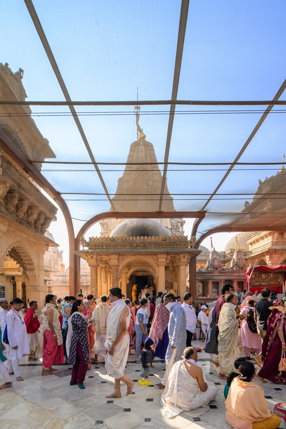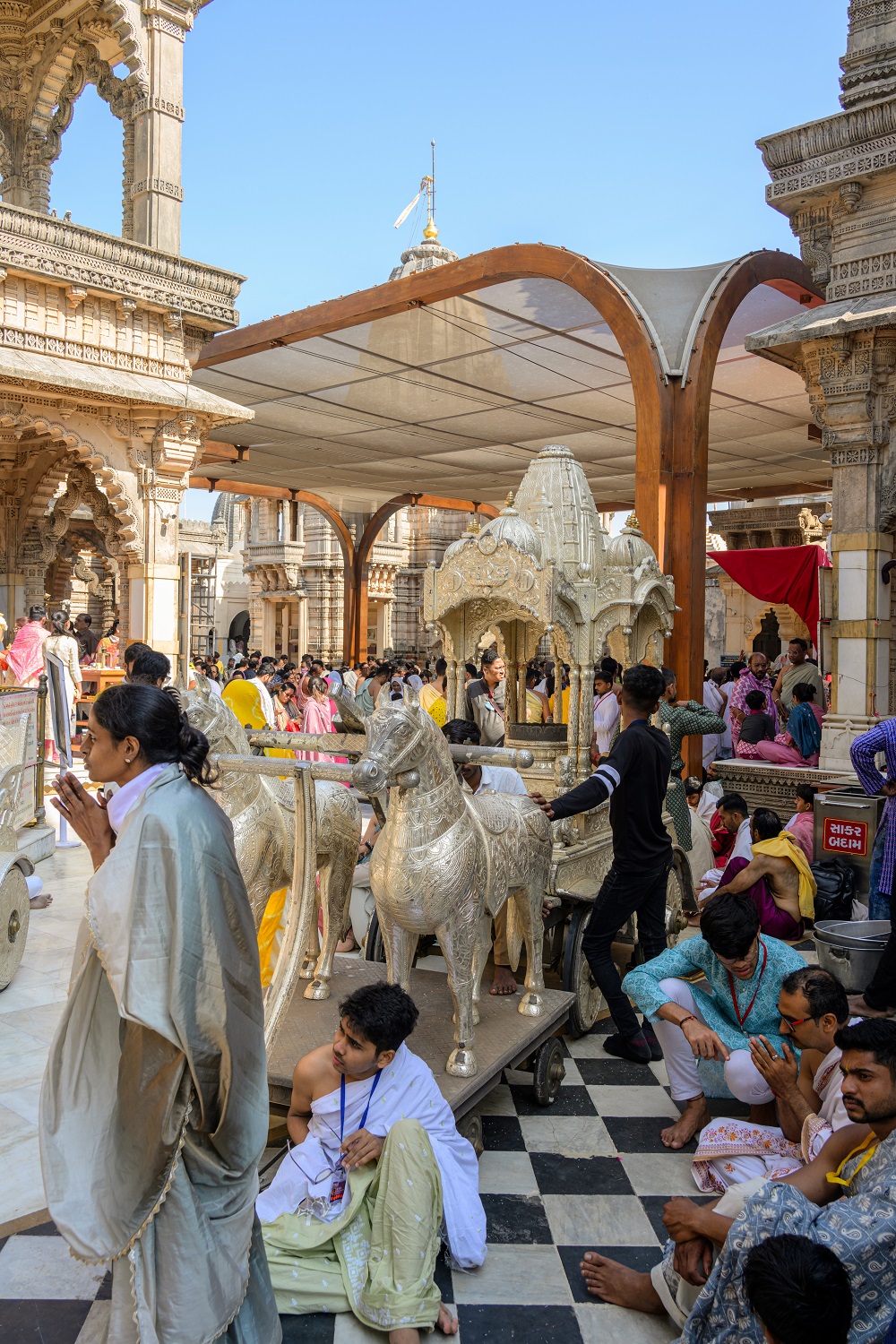 A key aspect of the design is ensuring the uninterrupted darshan (viewing) of the temples’ shikhar (spire) and the sky, which hold profound spiritual and symbolic significance in Hindu and Jain traditions. The Rang Mandap is designed to frame the towering shikhar against the open sky, preserving the essence of spiritual connection and aspiration for all devotees. The shikhar symbolizes the connection between the earthly and divine realms, and by maintaining clear sightlines to the sky, the design allows pilgrims to experience the transcendental power of this sacred architecture. The open sky above the shikhar represents infinity and boundlessness, reminding visitors of their spiritual journey toward self-realization and liberation (moksha). The act of gazing upon the shikhar and the sky is considered purifying, believed to cleanse the soul and elevate the seeker’s consciousness.