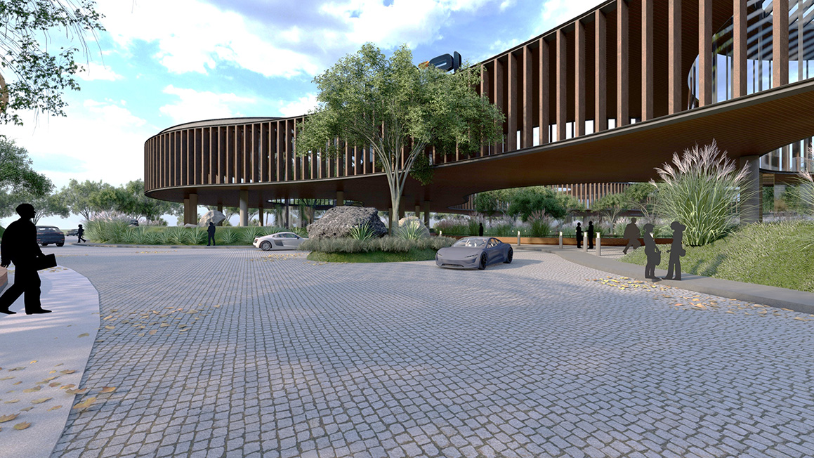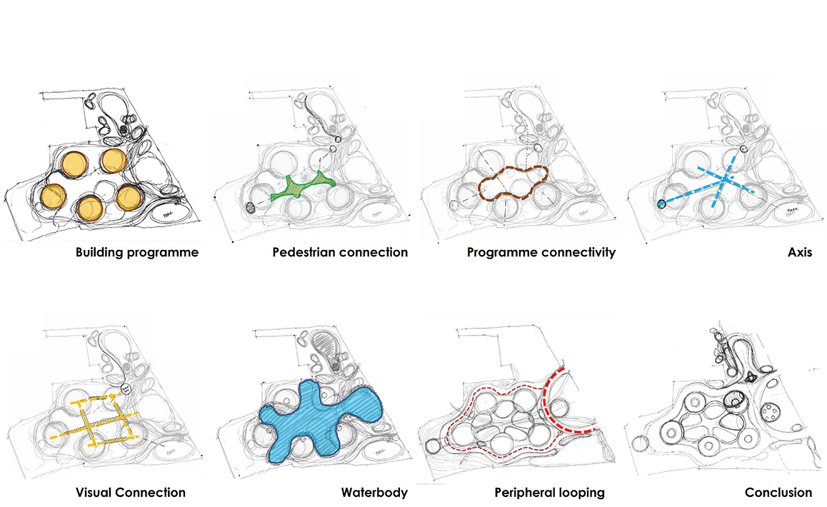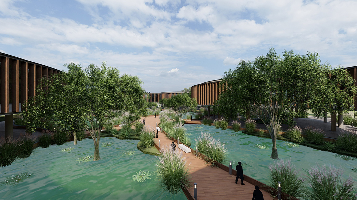 Thoughtful exploration and interpretation of the design program prioritizes pedestrian connections, promoting seamless movement and interaction between different areas of the campus. Walkability is promoted for the better health of the community, as pathways wind through the campus, offering not just physical connectivity but also a profound connection to the surrounding nature. The program connectivity and visual connections enhance collaboration and foster a sense of belonging. Zoning of the functions at various levels ensures a balanced distribution of spaces, allowing for focused work and privacy while encouraging collaboration and shared experiences. By integrating water bodies, built masses, and native landscaping, a balance has been forged between the built and unbuilt, leading to spaces that provide opportunities for relaxation, inspiration, and connection with nature, thus promoting a holistic and enriching experience that encapsulates the ethos of sustainability, adaptability, and inclusiveness.