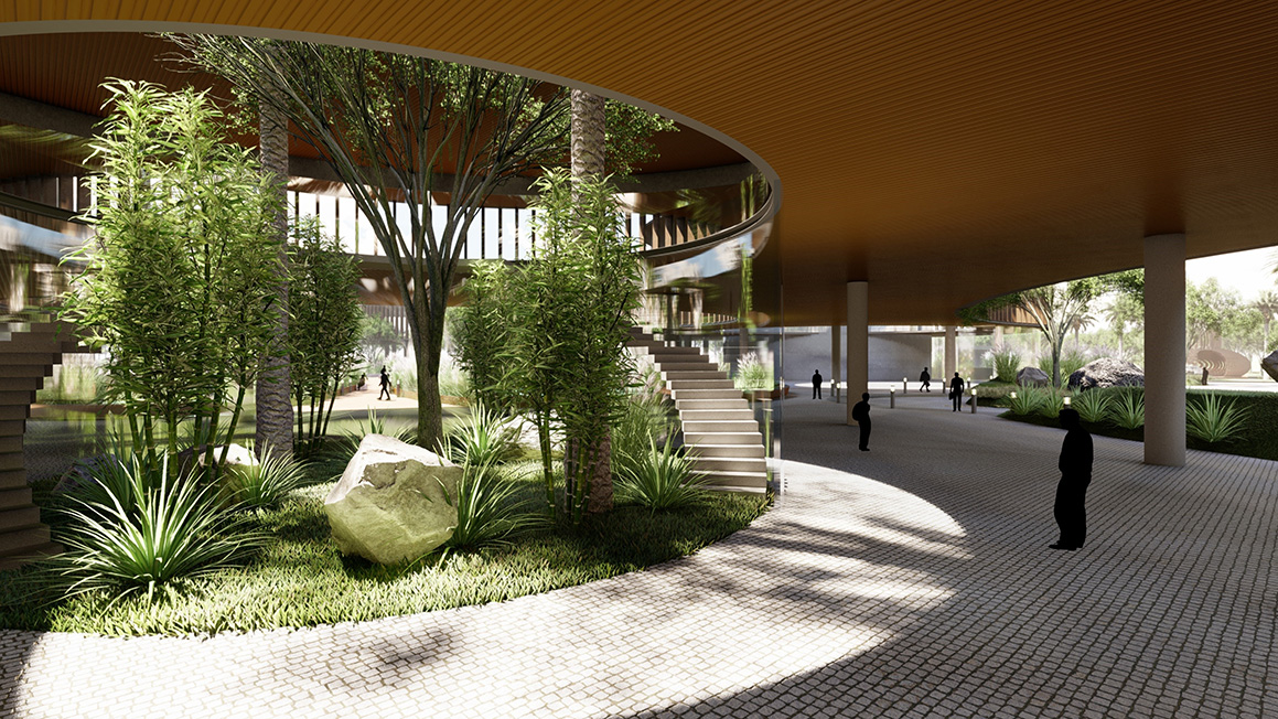 For the Patel Infra campus at Vasad, the aim is to create a truly sustainable, ecological, and adaptable workspace that seamlessly integrates with nature. Self-sufficiency is at the core of the design philosophy, achieved through the use of local materials, solar energy, water-saving techniques, and wastewater reuse. By reducing waste and converting it into biofuels and biogas, environmental impact is further minimized. Rainwater harvesting systems are integrated to maximize water conservation. Additionally, by allowing nature and the built environment to blend together visually and experientially, the design enables the user to experience the change of seasons through soft and natural daylight which further helps in generating a micro-climate that enhances the well-being of the workforce. Inclusiveness in the design promotes a healthy work environment, involving spaces for open discussions leading to a balanced work-play mix. Formal and informal working areas have been incorporated through free-flowing shapes that add visual interest and contribute to a psychologically stimulating atmosphere.