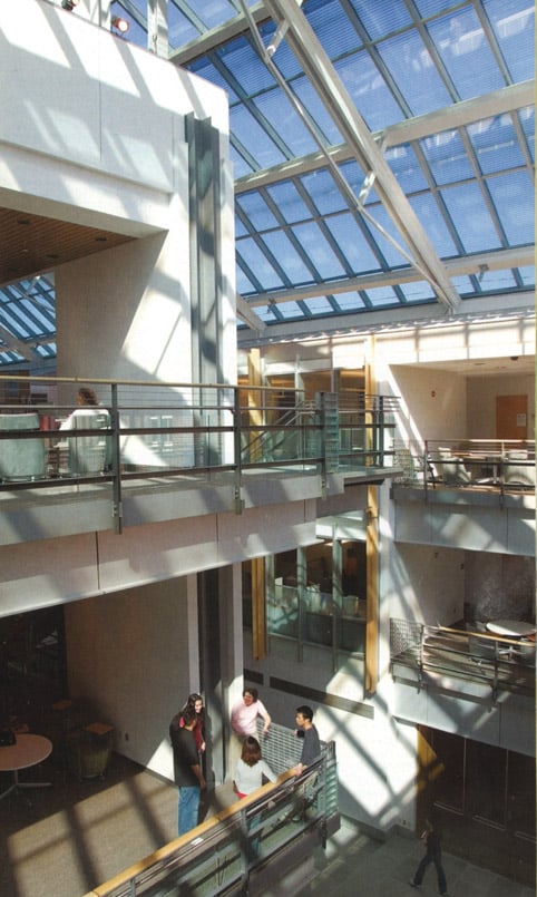 The design of this facility at the Rensselaer Campus unfolds over an L-shaped footprint along the length of which a linear sky-lit and naturally ventilated atrium covers the central double-loaded corridor which provides a wide interactive hallways at many levels. Laboratories of various capacities and fields line up along the north-facing length of this five story building, while the southern face (continuing on the shorter eastern face) is lined up with corresponding offices. An auditorium enveloped in a sculptural wavy wall abuts the building’s western end on the ground floor, while the eastern end houses the mechanical services and the northern short arm end has the Vivarium.