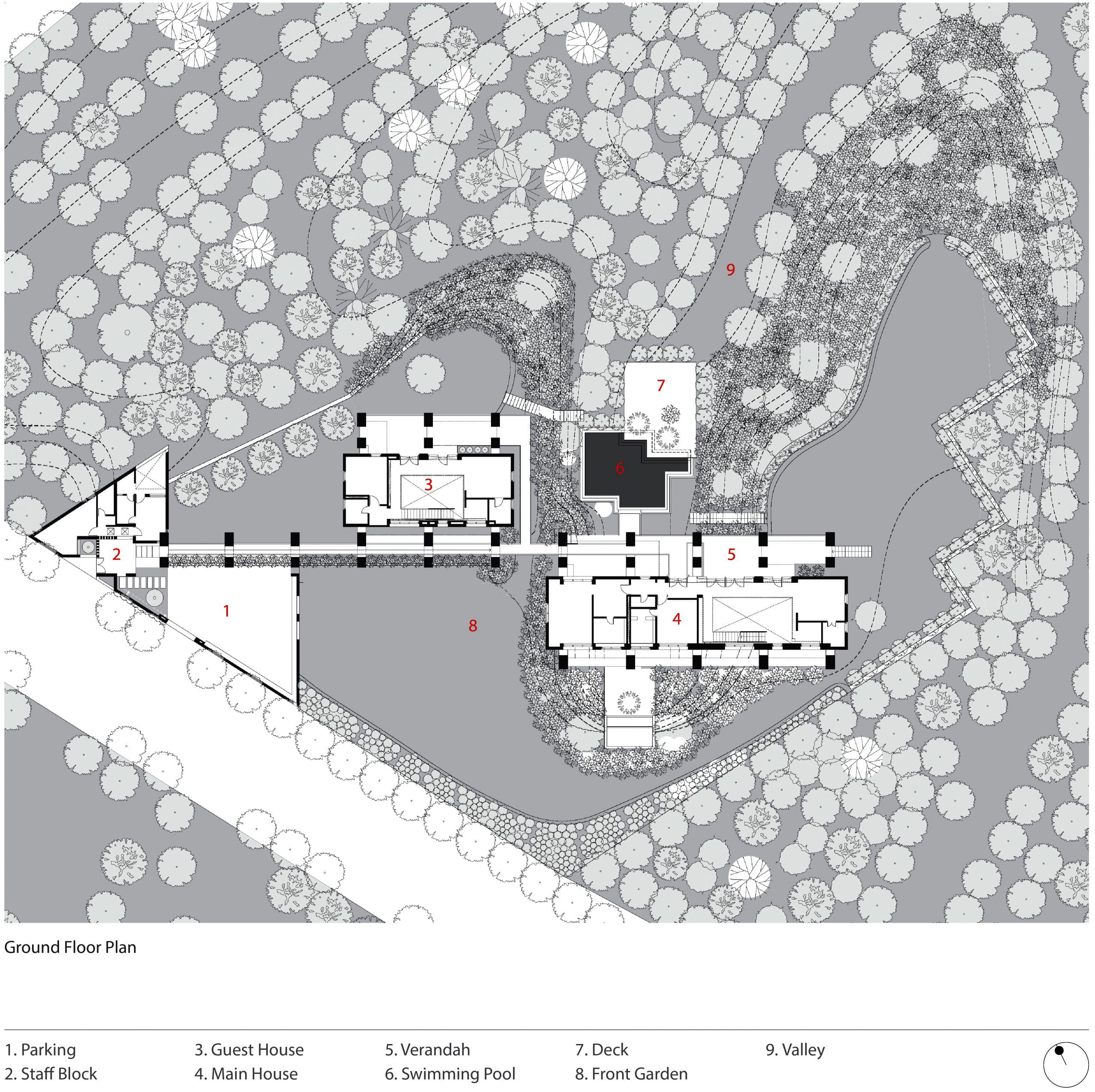 The Hariyani Residence is located about 45 kms from Ahmedabad at Aalloa. In this heavily contoured site the house is sited on a natural plateau from where it overlooks on to a valley. The house itself is slightly elevated so as to hover above the ground plane. This allows for uninterrupted flow of the natural systems including vegetation and water. The house is composed of two blocks and a pedestrian walkway. A larger block and a smaller block, the main living spaces and bedrooms for the family are located within the larger block overlooking the swimming pool and the valley beyond. The smaller block is the guest house for out of-town guests spending the weekend at the residence.