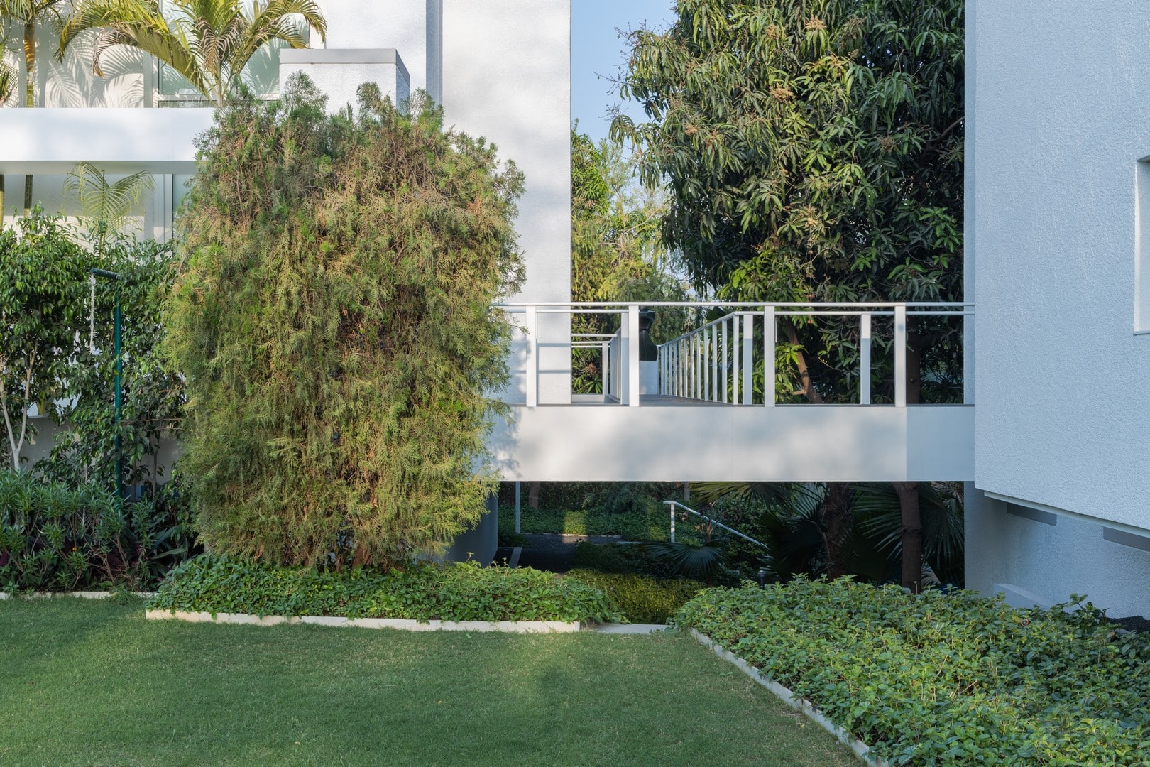 Rest and comfort in close consonance with luxuriant nature, reveling in it yet not disturbing its delicacy, with friends to share the good times – a perfect recipe that informed the agenda for this home at Aalloa hills near Gandhinagar. This accoutered 14,500 sq.ft of built-up area is conceived as a bright white bridge spanning the valley, standing out boldly against the ambient wilderness. This was accomplished by intuitively letting the component blocks meander linearly across the valley underneath, strung together by the thread-like access ramp. This ramp starts from the domestic helpers’ quarters below, leads from the parking bay at the entrance, connects the guest house along the way to end up at the main house atop the plateau. Hoisted off the ground on pilots like a high Machaan to avoid excessively encroaching the natural carpet underneath, the house affords views of the rolling greens around the Sabarmati River through endless deep, shady verandahs lining its two longer edges.