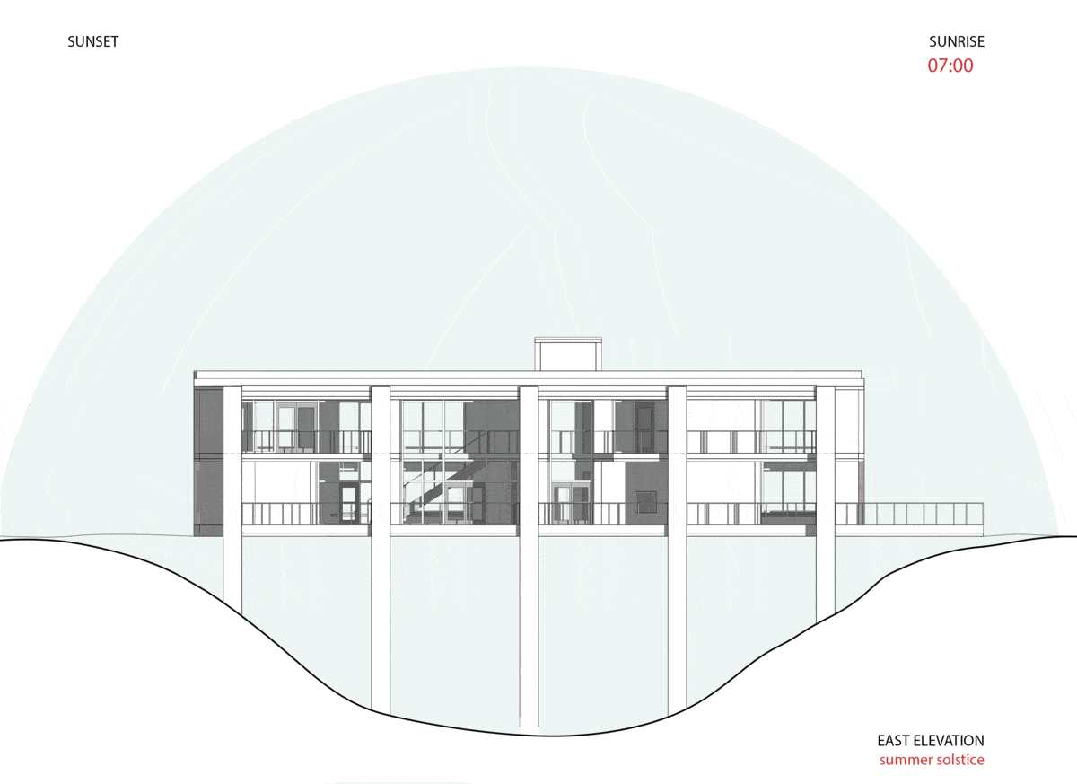 A china mosaic lined roof-top thwarts the harsh sunlight while wide, painted concrete sun- breakers positioned along the verandahs, sunk slab with cinder filling and double-glazed windows team up to reduce heat absorption, consequently cooling the building. Breezes blowing towards the house get cooled as they pass over the pool and waterfall flanking the main block on either side.