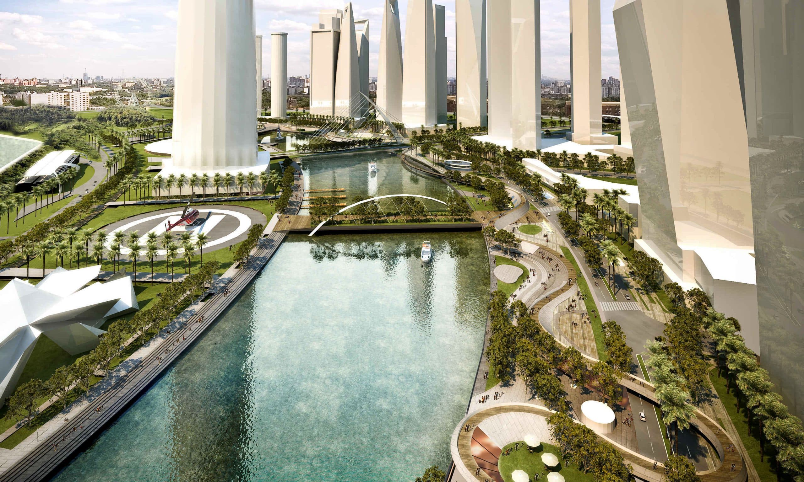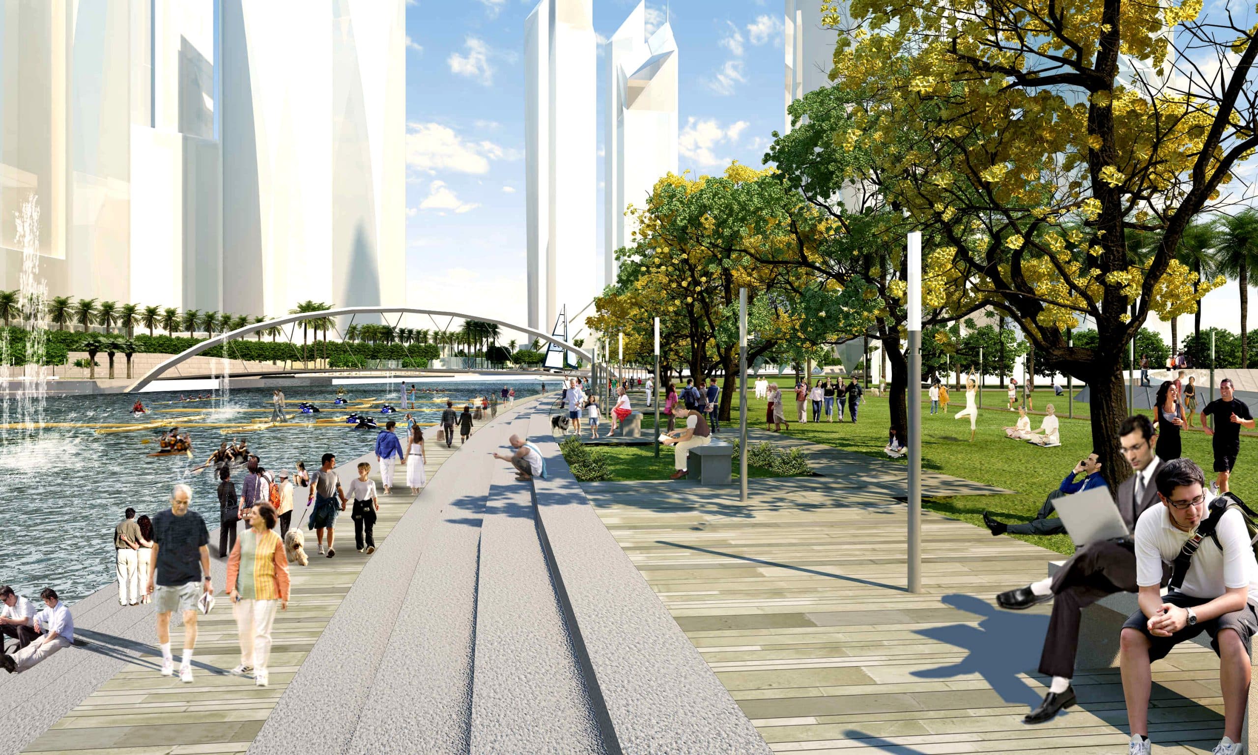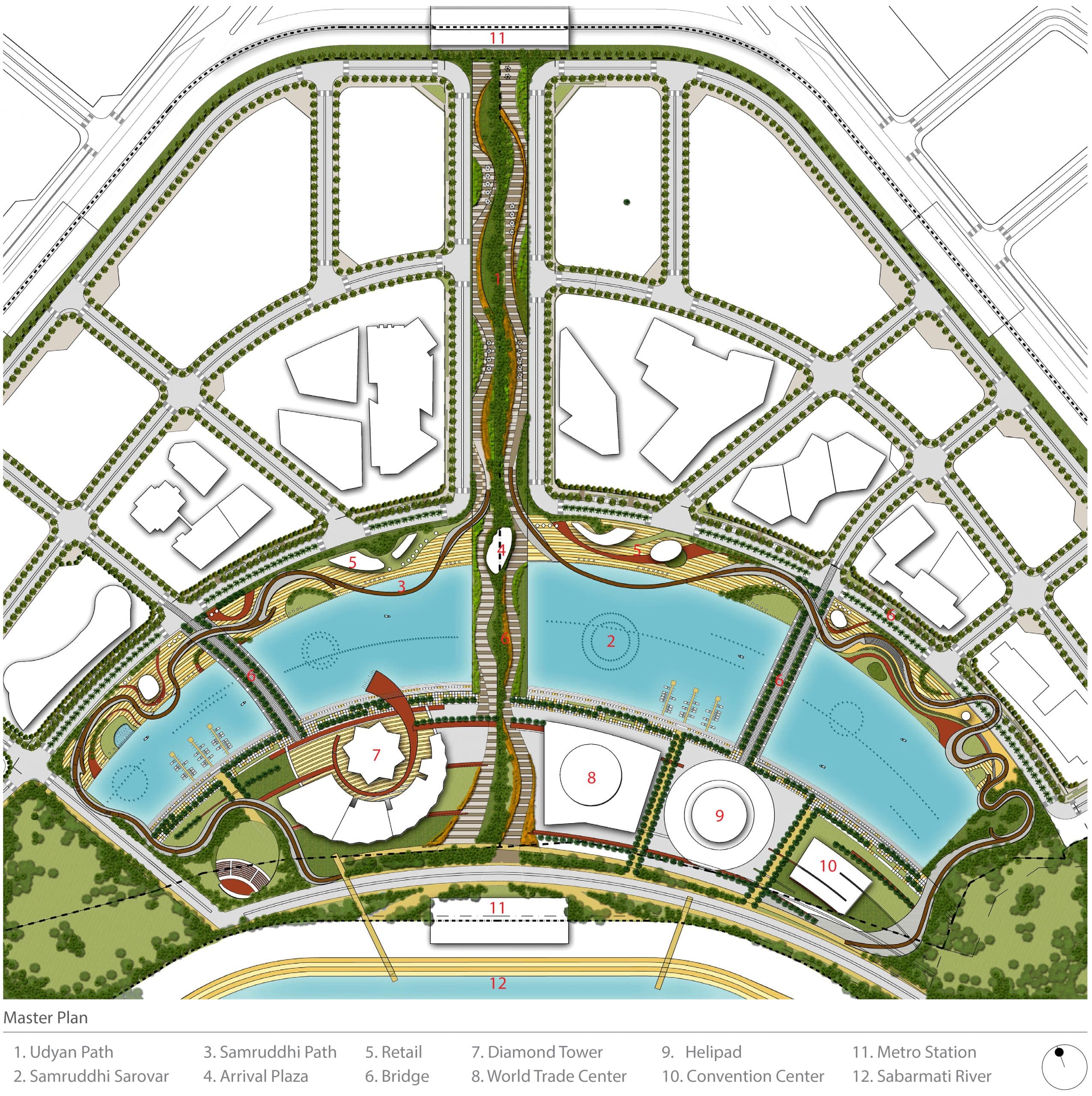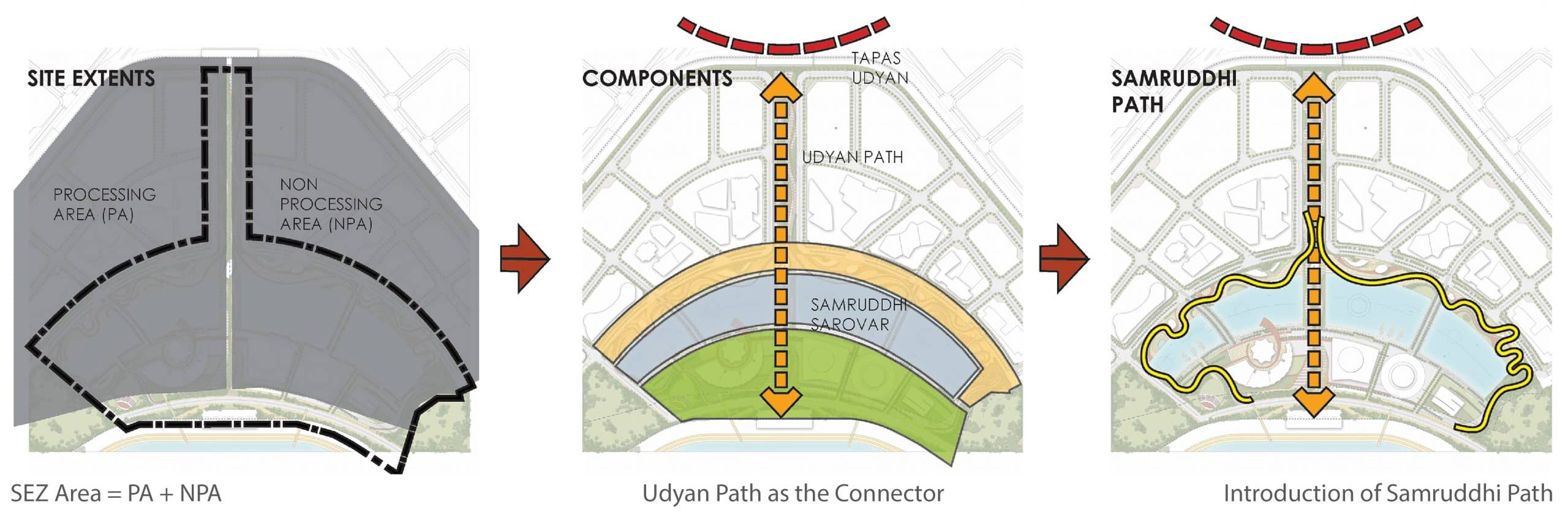 The reservoir lake fans out in a C-shape around a town center to its south, which is home to some tall commercial and corporate structures on the banks of the Sabarmati River flowing along the opposite southern side. Besides the complete bounding edges of the lake, the design site includes centrally placed entrance pathway leading to it from the main road and metro station located across a distance in the north. The entire stretch from this portal to the lake front and all around it is adorned with soft and hardscapes and water features, with a serpentine elevated promenade called Samruddhi Path woven around the lake, forming pockets on either sides where a wide range of activities are designed.