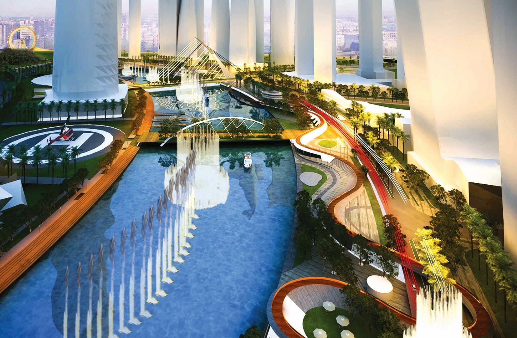 A landscaped green spine is cultivated along the central entrance pathway, which further joins the Samruddhi path promenade to complete the green connections. The straight entrance pathway, called Udyan Path, forms a connection from the Tapas Udyan and its metro station located in the north to the diamond metro station of the city centre in the south via a landscaped bridge over the lake. Two more bridges on either sides connect the northern and southern lake edges, while ample parking is made available alongside the peripheral roads bounding the development.