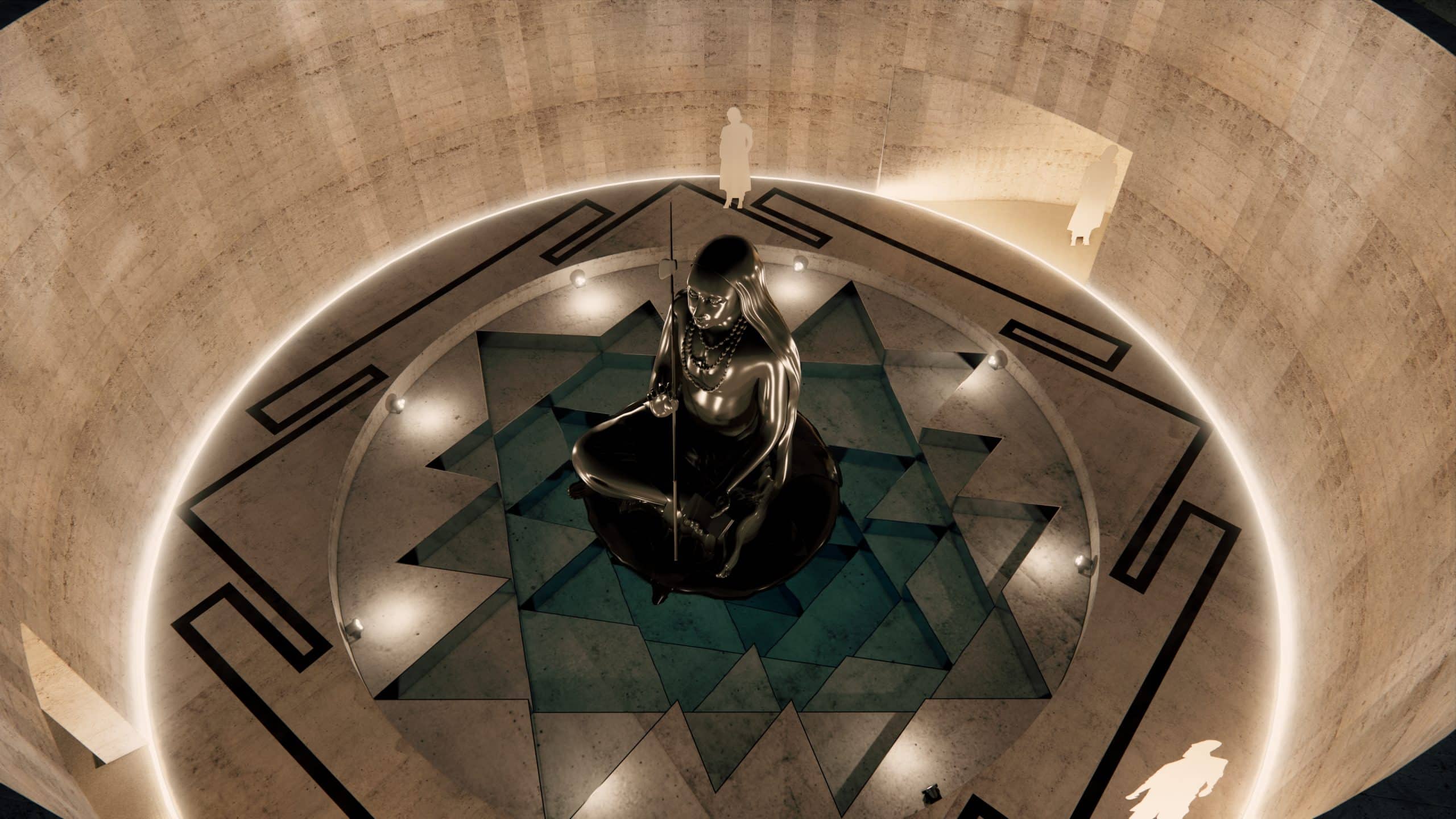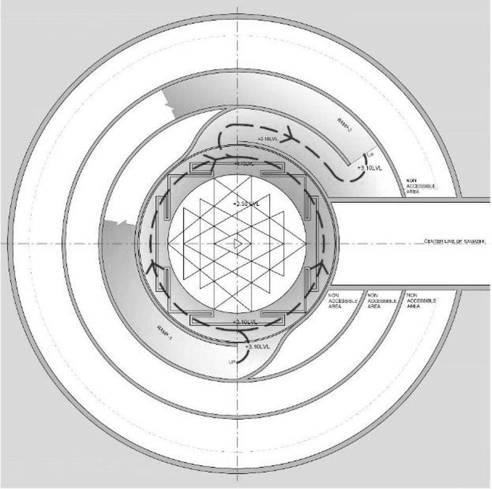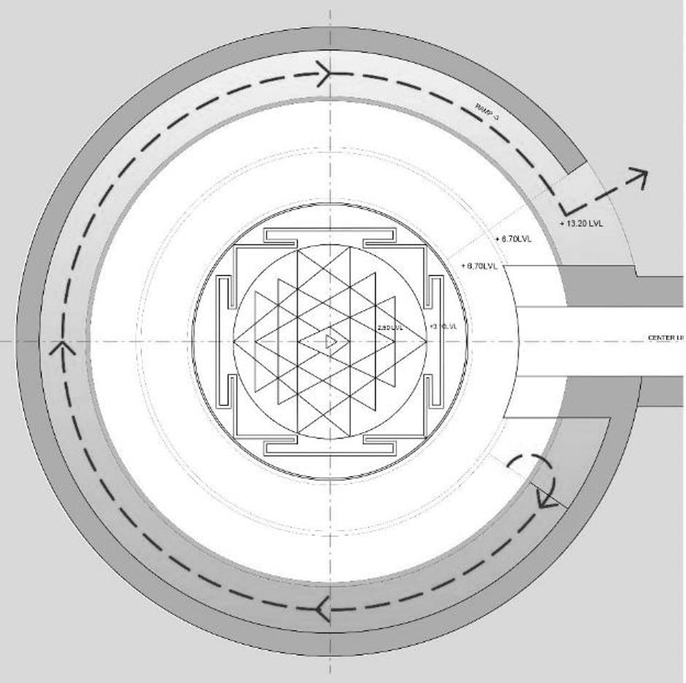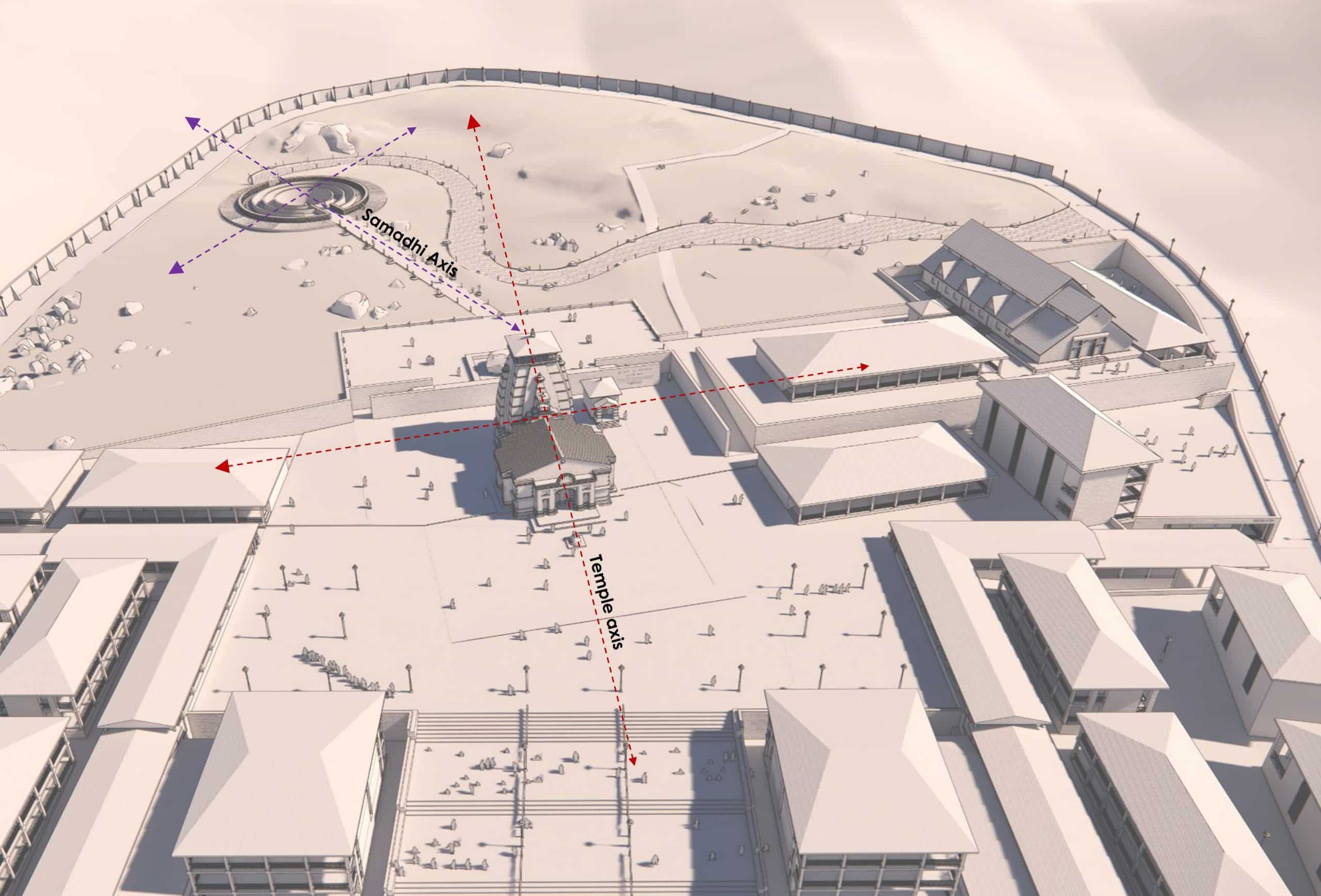 The Samadhi is submerged and does not over power main temple, while allowing backdrop of Majestic Himalayan Mountain. The design is also inspired by ‘spiral of life’ and allows for transformative experience to pilgrims.
