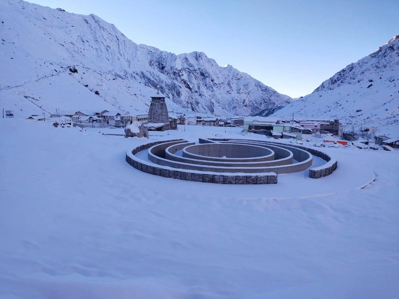 Samadhi Exterior with Kedarnath Temple in frame, after first snow fall post competition of project