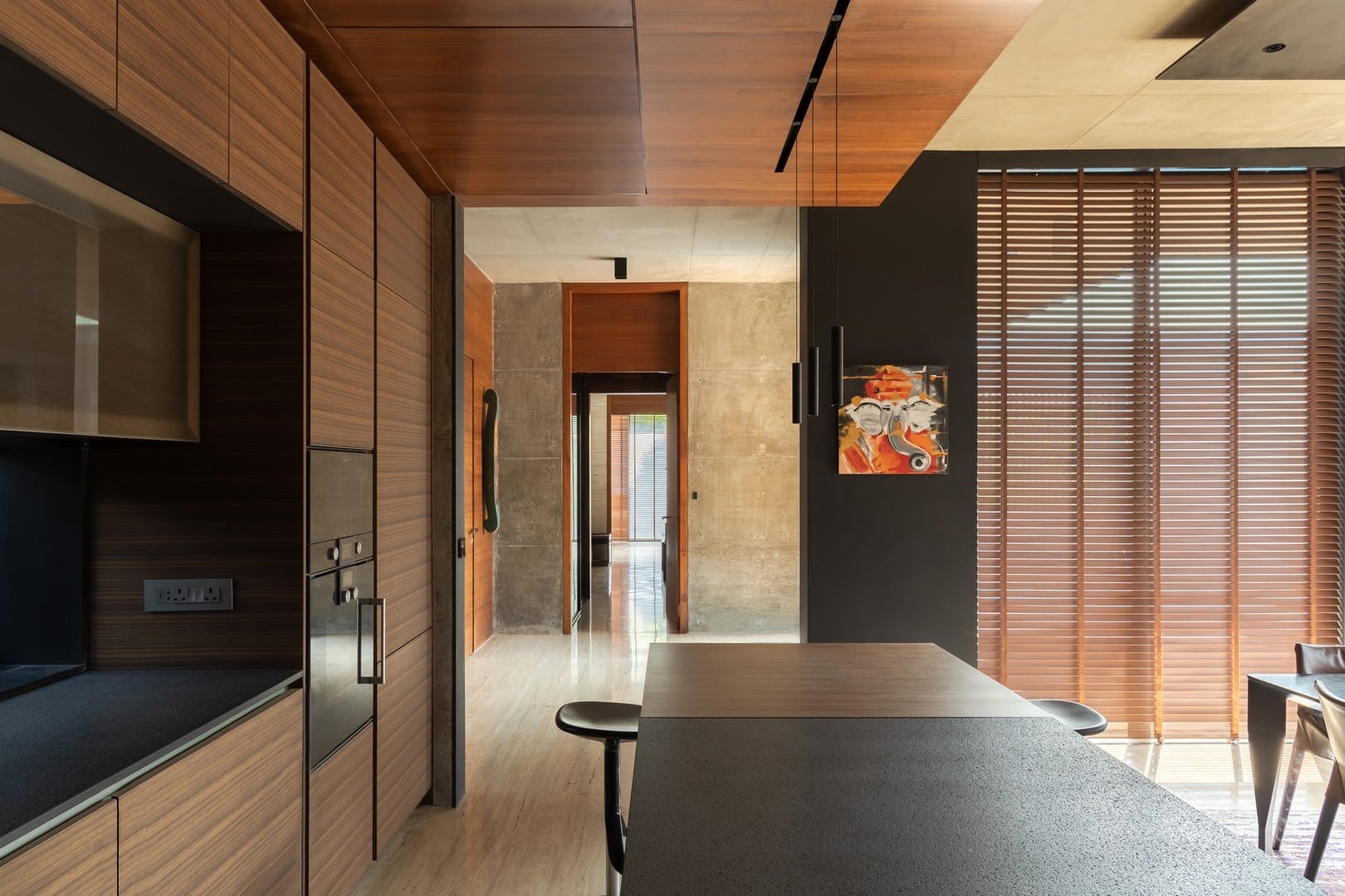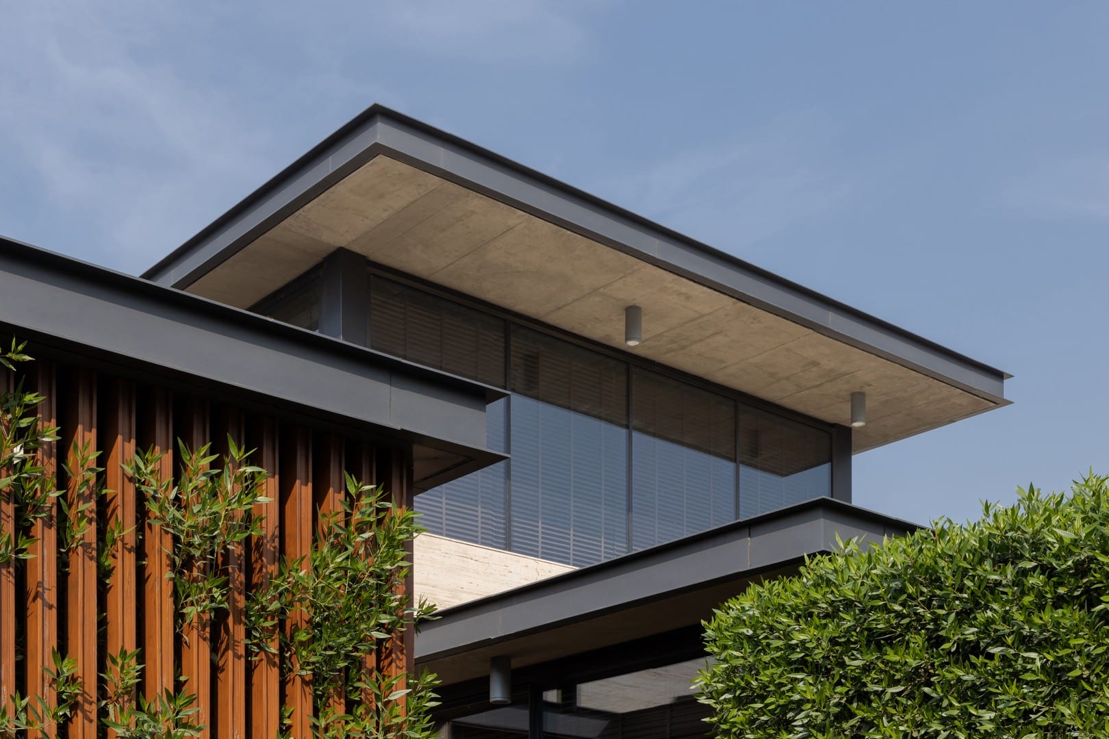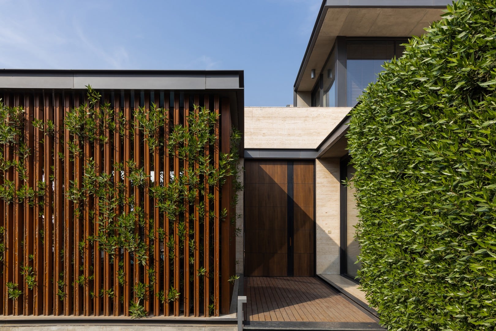 Exemplifying a truly modern aesthetic, the house sits over a monolithic expression of travertine stone accentuated by subtle touches with hints of concrete, metal and wood detailed to perfection. The upper section of the house showcases a captivating combination of glass, wood, and floating concrete canopies, adorned with metal accents along their edges. Abundant windows, strategically placed throughout the design, provide panoramic vistas that seamlessly connect the interior and exterior spaces. In keeping with the surrounding context, the compound wall is finished with local stone, both as cladding, and in the form of gabion, which creates a sense of tranquillity and seclusion, shielding the abode from the clamour of the bustling street.