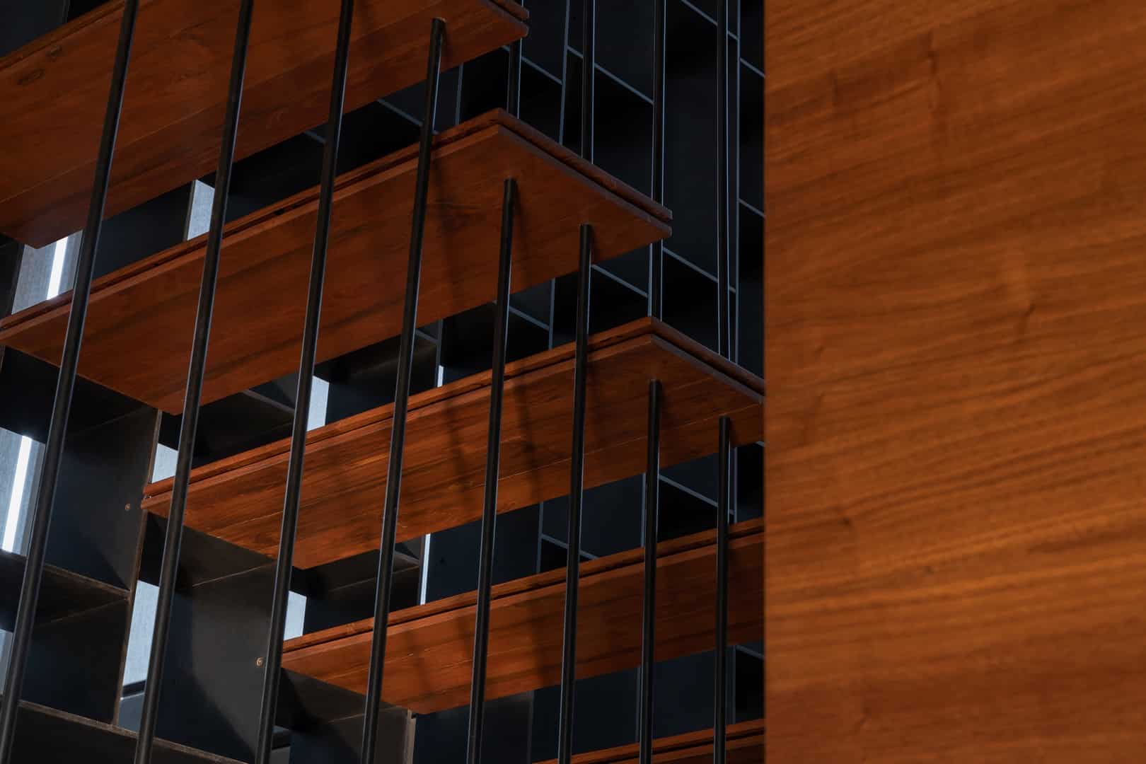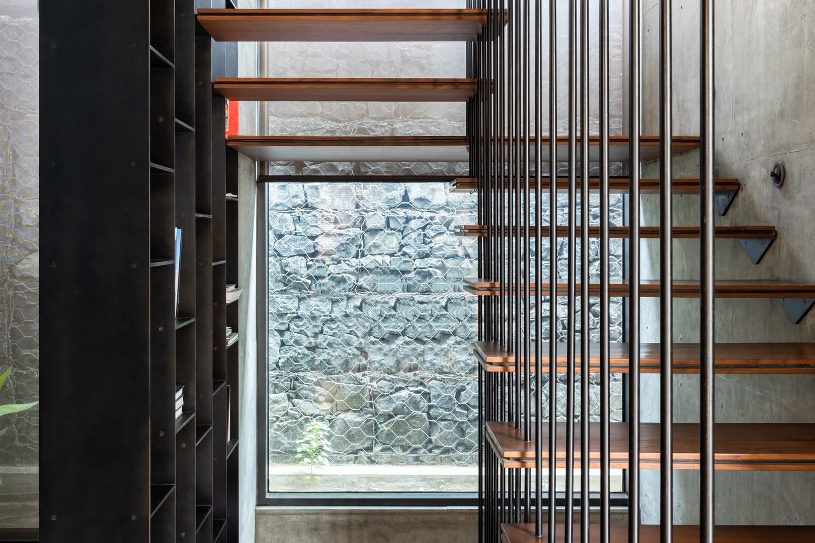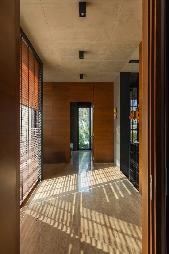 Exemplifying a truly modern aesthetic, the house sits over a monolithic expression of travertine stone accentuated by subtle touches with hints of concrete, metal and wood detailed to perfection. The upper section of the house showcases a captivating combination of glass, wood, and floating concrete canopies, adorned with metal accents along their edges. Abundant windows, strategically placed throughout the design, provide panoramic vistas that seamlessly connect the interior and exterior spaces. In keeping with the surrounding context, the compound wall is finished with local stone, both as cladding, and in the form of gabion, which creates a sense of tranquillity and seclusion, shielding the abode from the clamour of the bustling street.