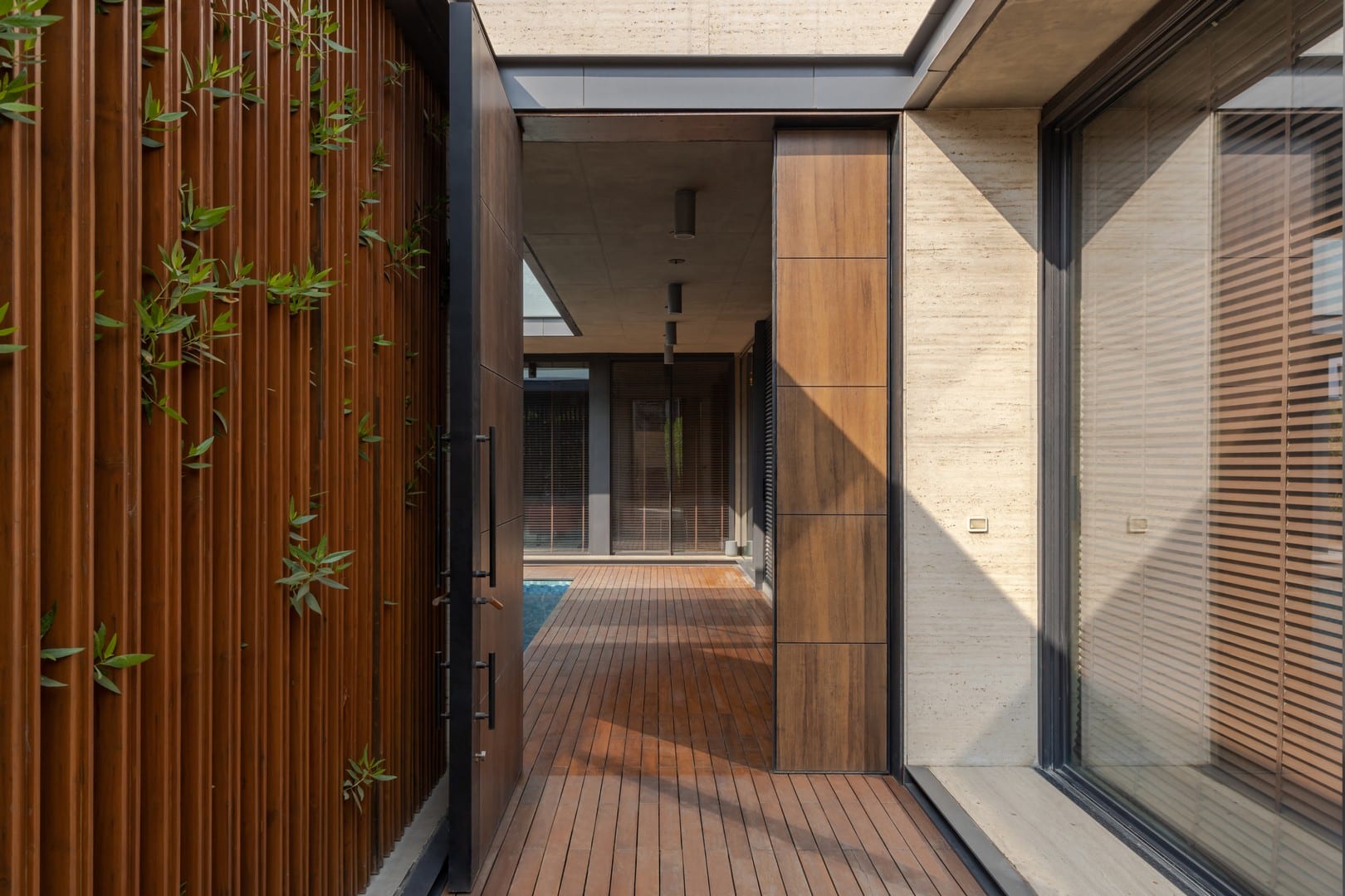 Inspired by traditional Indian homes, the spatial layout centers around a semi-covered courtyard. Enclosed by family spaces on three sides and an adjoining lawn on the remaining side, this central courtyard acts as the heart of the abode. The upper level of the dwelling is dedicated to private quarters, overlooking the courtyard and the pool.