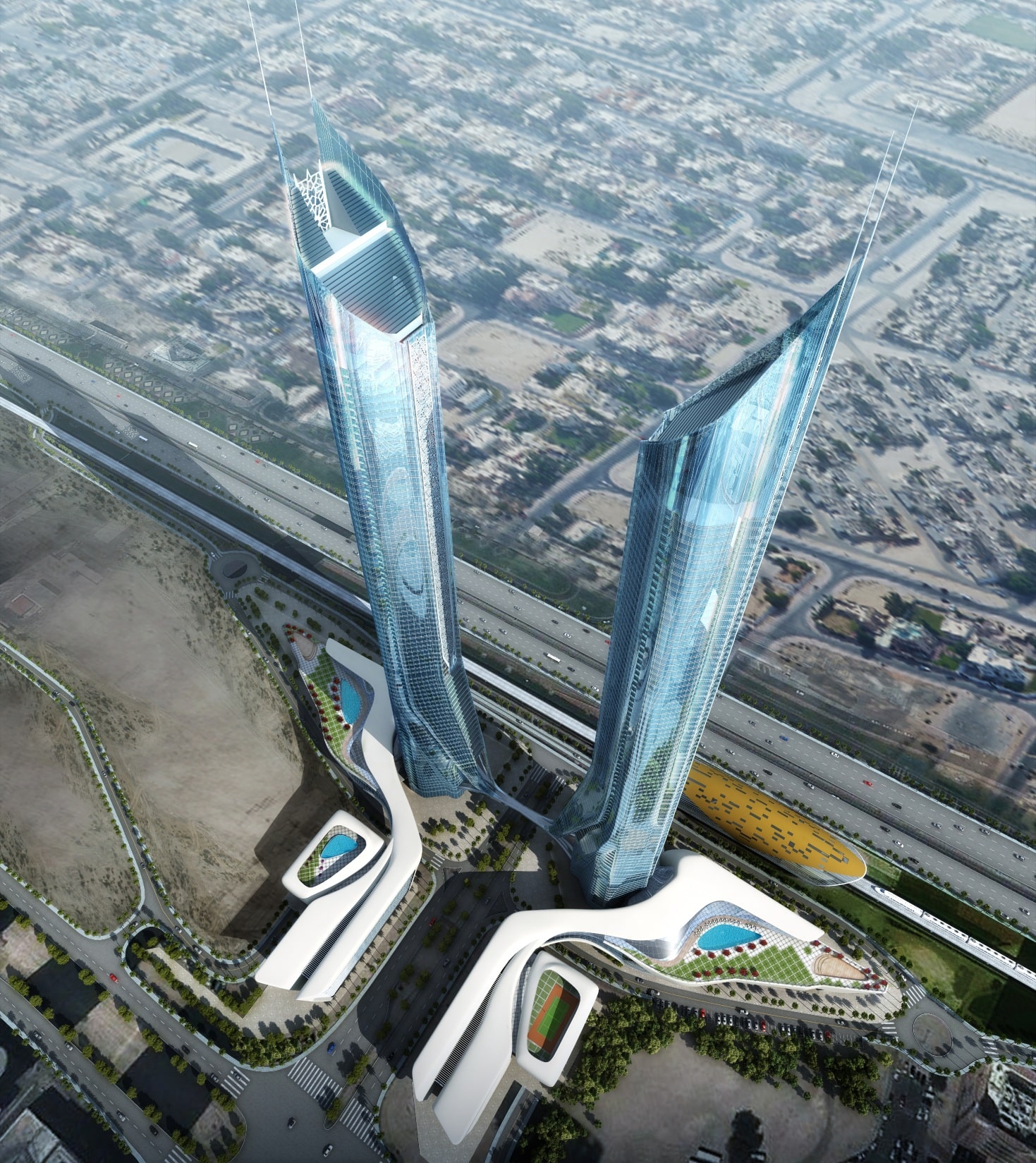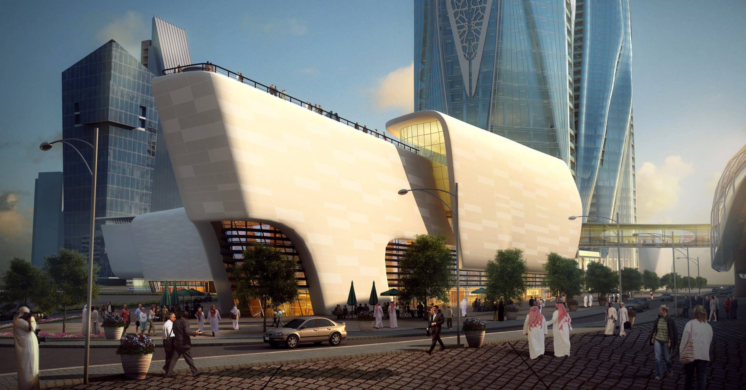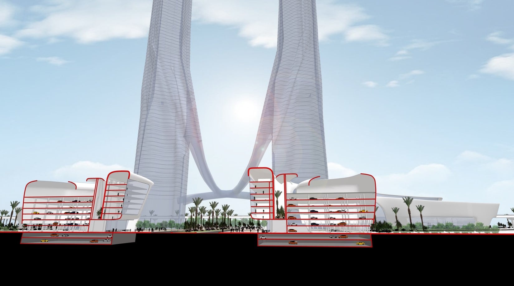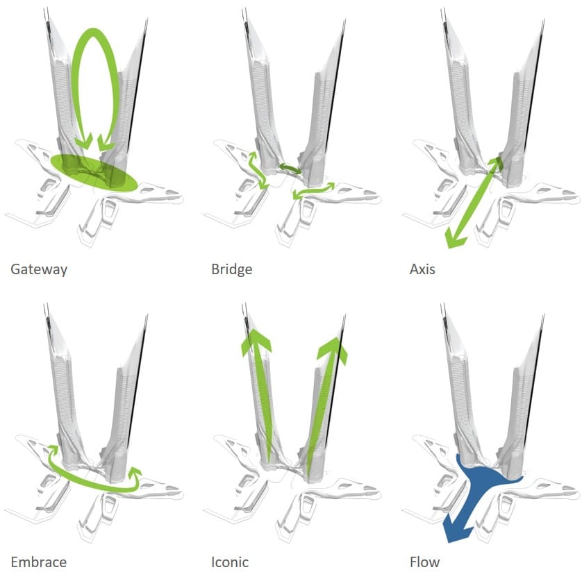 Sinuous bands seem to slice away from these base elements to rise up as symmetrical cylinders wrapped in steely, glassy high-tech aesthetics, punctuated by lit up slits. Adorned throughout their height by traditionally inspired and intricately designed perforated geometrical screens, the towers delineate an iconic gateway that is at once international of substance and local of flavor.