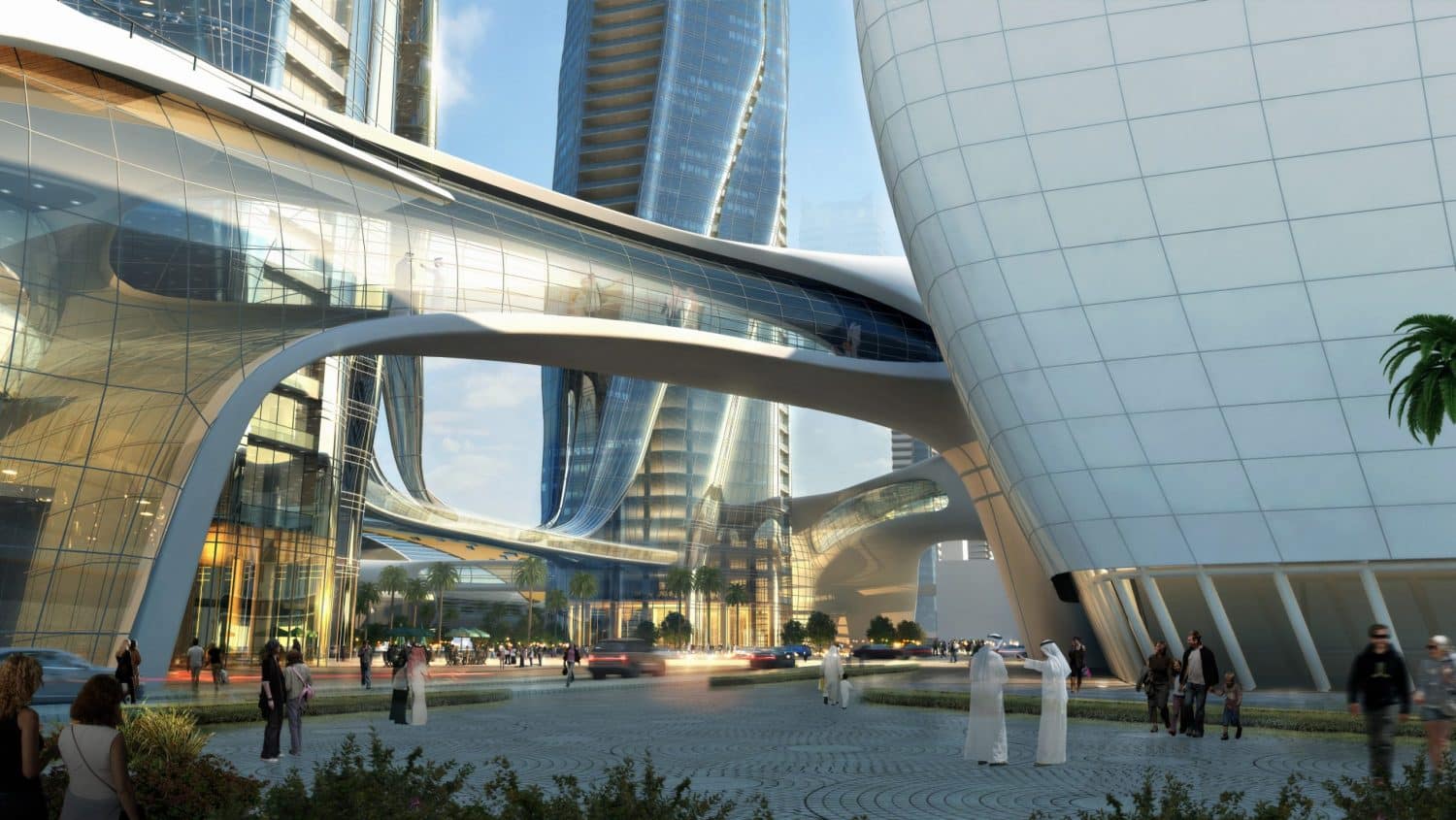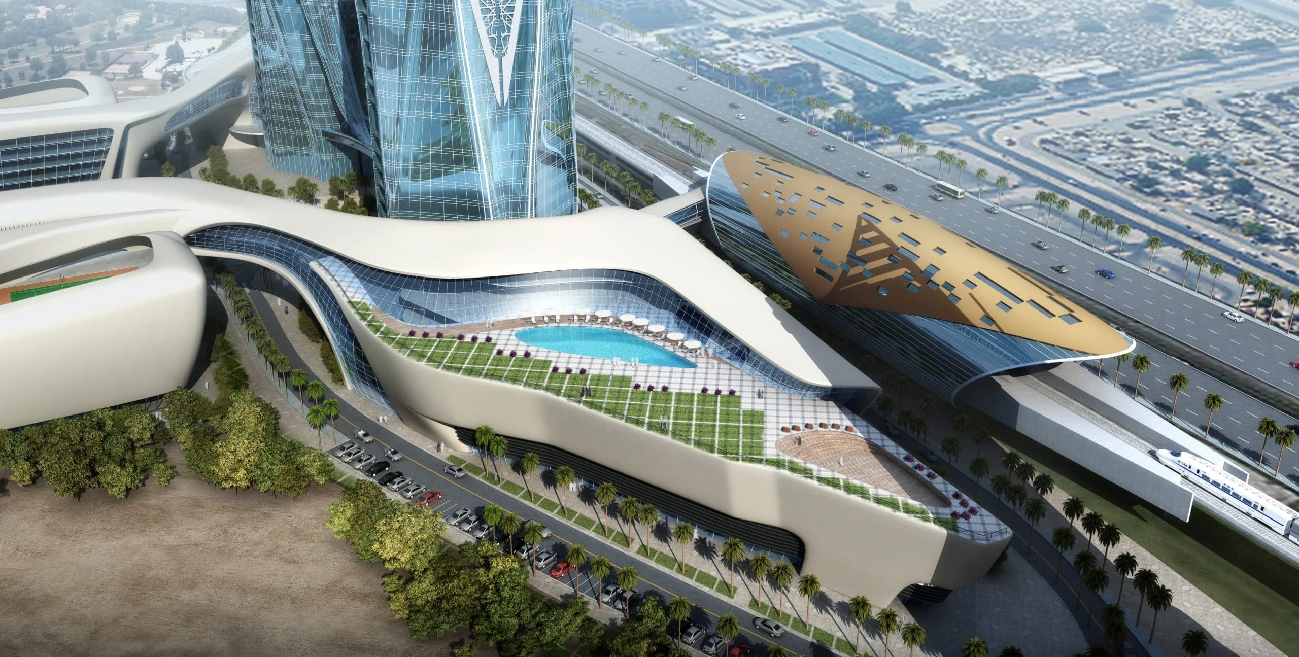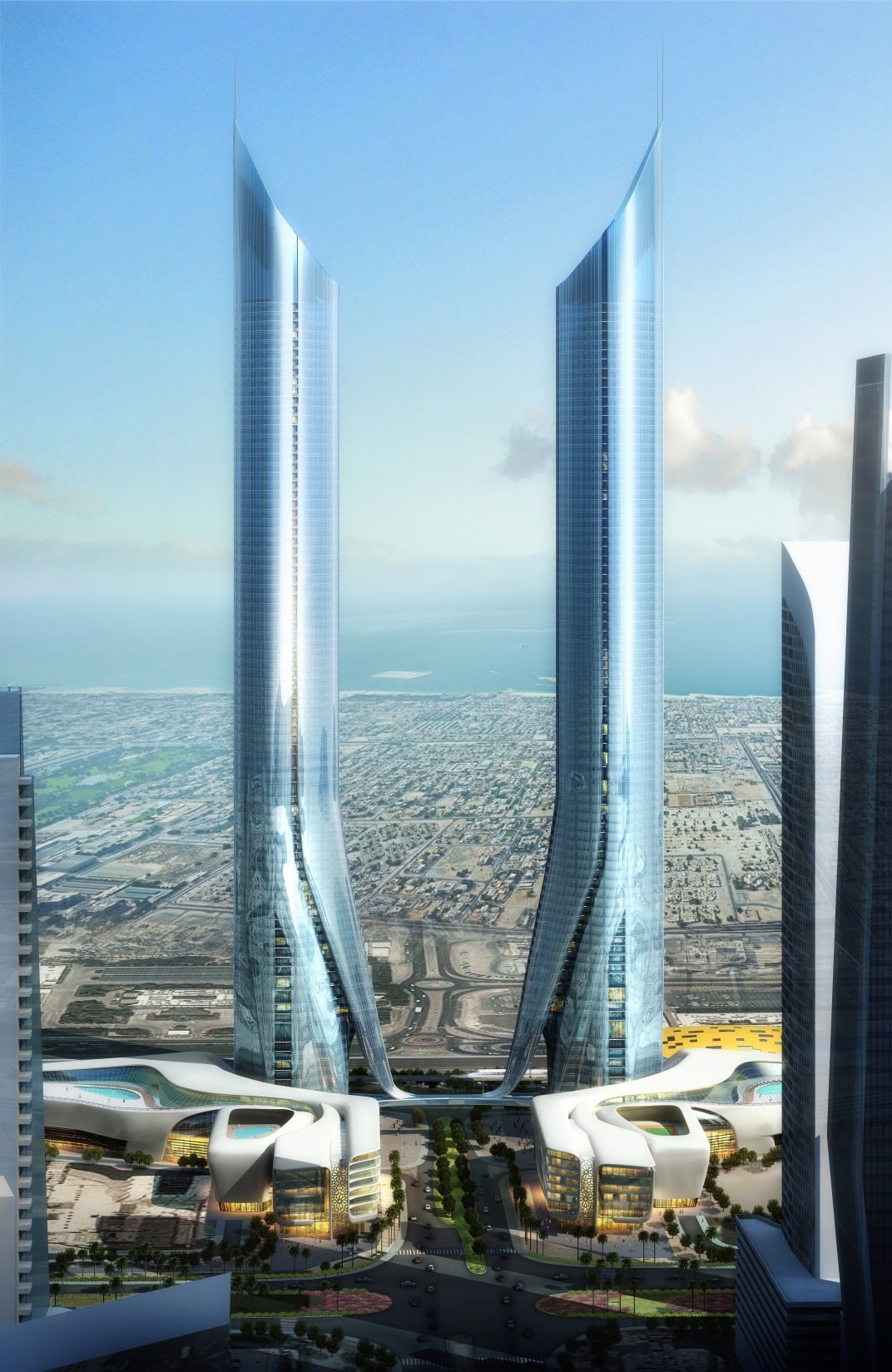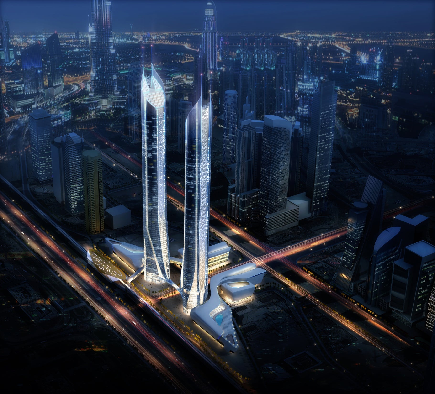 Sinuous bands seem to slice away from these base elements to rise up as symmetrical cylinders wrapped in steely, glassy high-tech aesthetics, punctuated by lit up slits. Adorned throughout their height by traditionally inspired and intricately designed perforated geometrical screens, the towers delineate an iconic gateway that is at once international of substance and local of flavor.