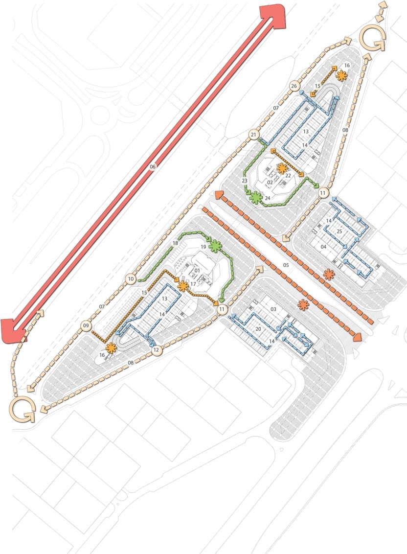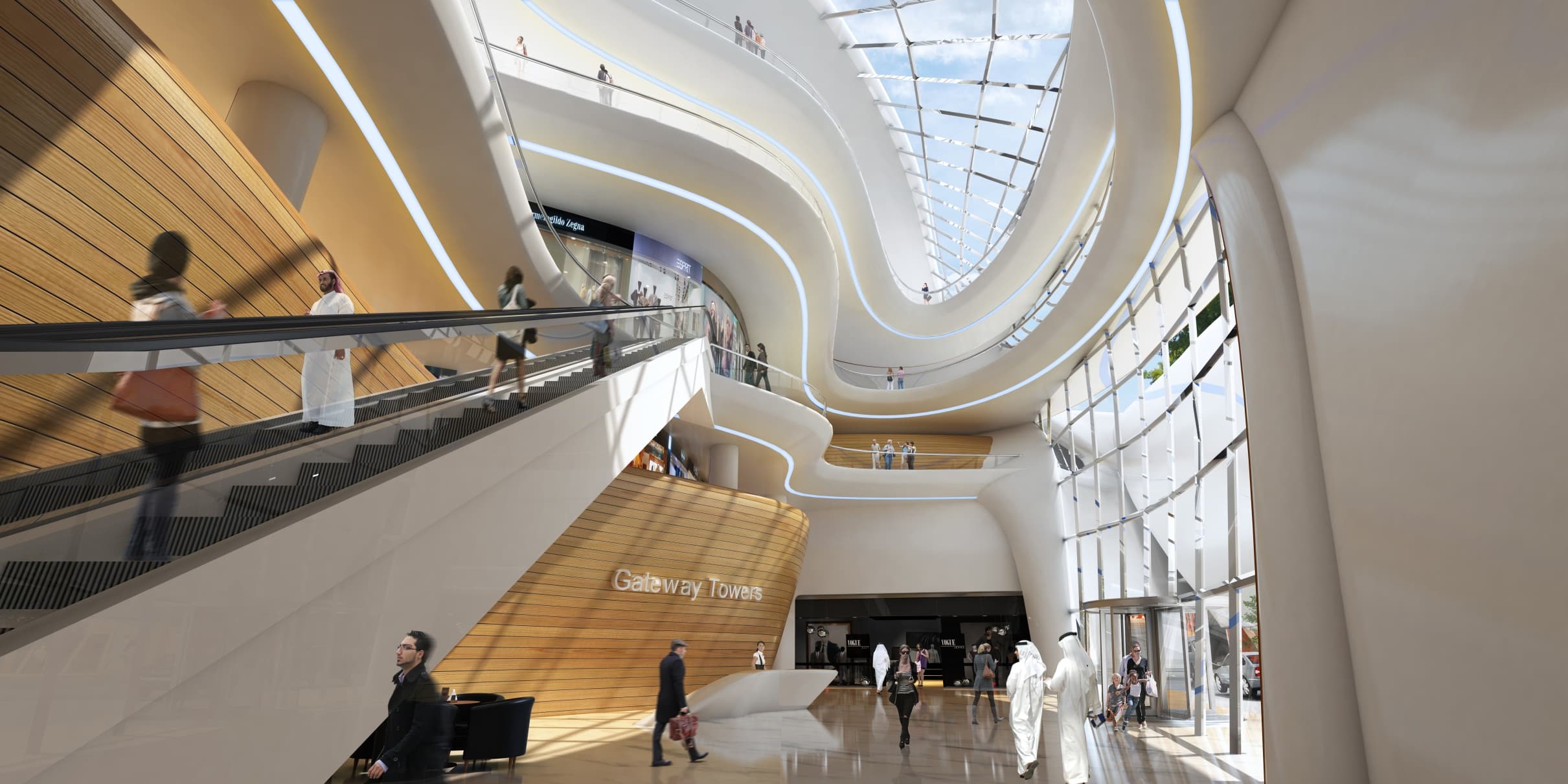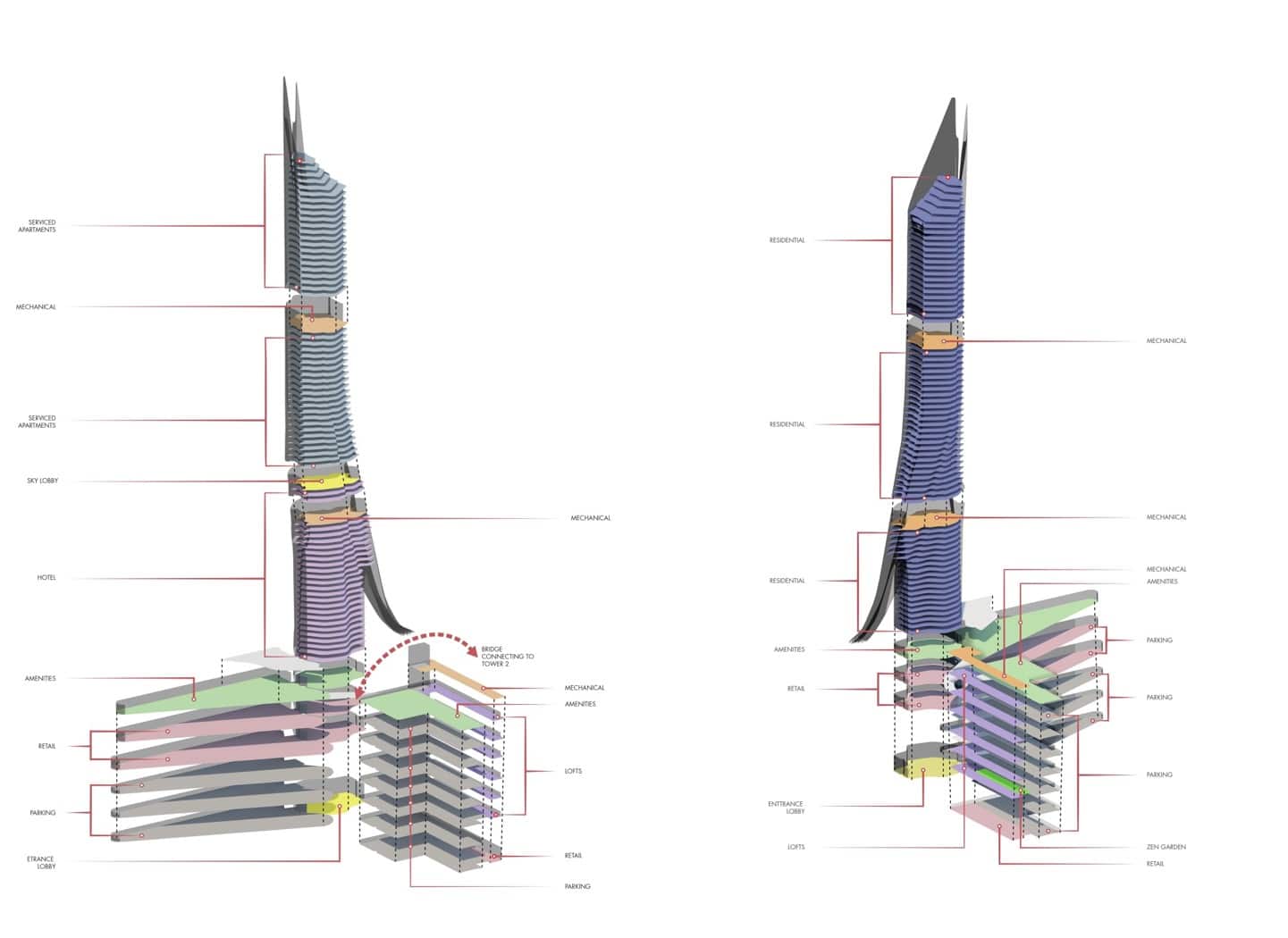 A plethora of mixed-use programs get covered within the premises of the Gateway Towers. A vibrant and seamless pedestrian path gets chalked in and around the bases connecting the metro station at one end, across the street via a bridge, and to the Business Bay in the final lap. Vehicular movement on Sheikh Zayed road and Al Khaleed Al Tejari 1 Street have been addressed and organized. Business spaces including malls, individual entities and offices mixed with recreational and F&B outlets find premium interfaces at the base of the towers. While one entire tower has residential units viz. 1, 2, 3, and 4 BHK premium urban homes up to the 72nd floor, the floors on other tower are divided between luxurious serviced apartments and a 250 key boutique hotel. The living spaces in both towers are arranged around an elaborate central circulation core which connects down to multi-level parking facilities, and the outer surfaces afford the residents breathtaking views of Dubai round them. Residential lofts are also available, lining the street side edges of the L-shaped bases.