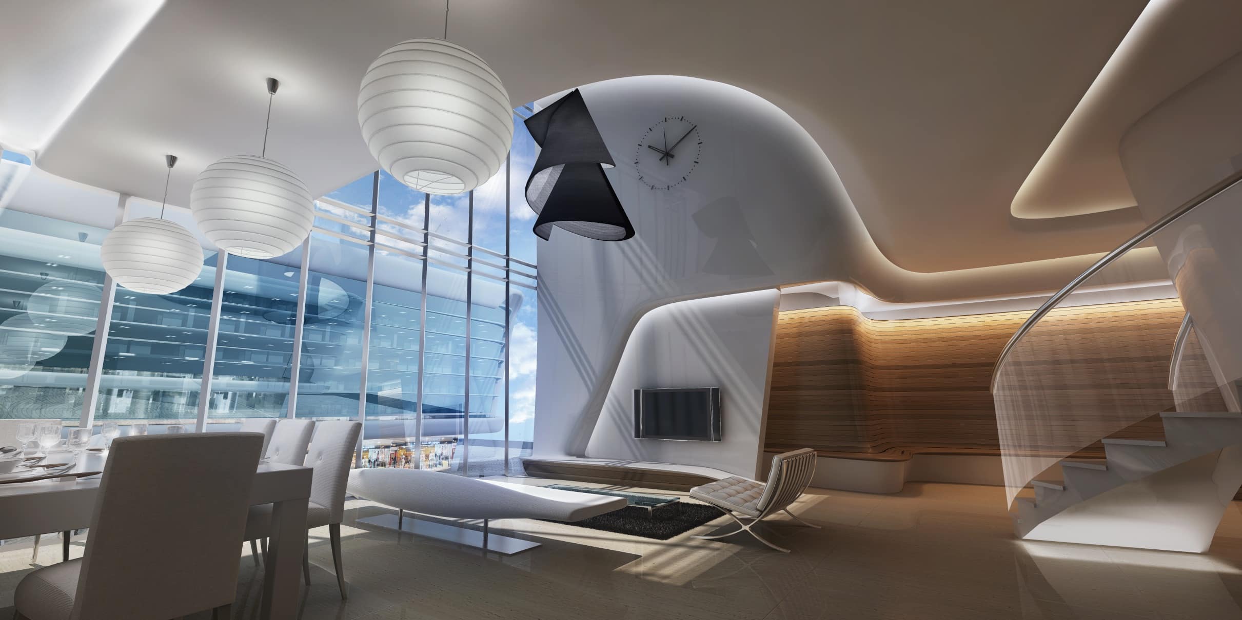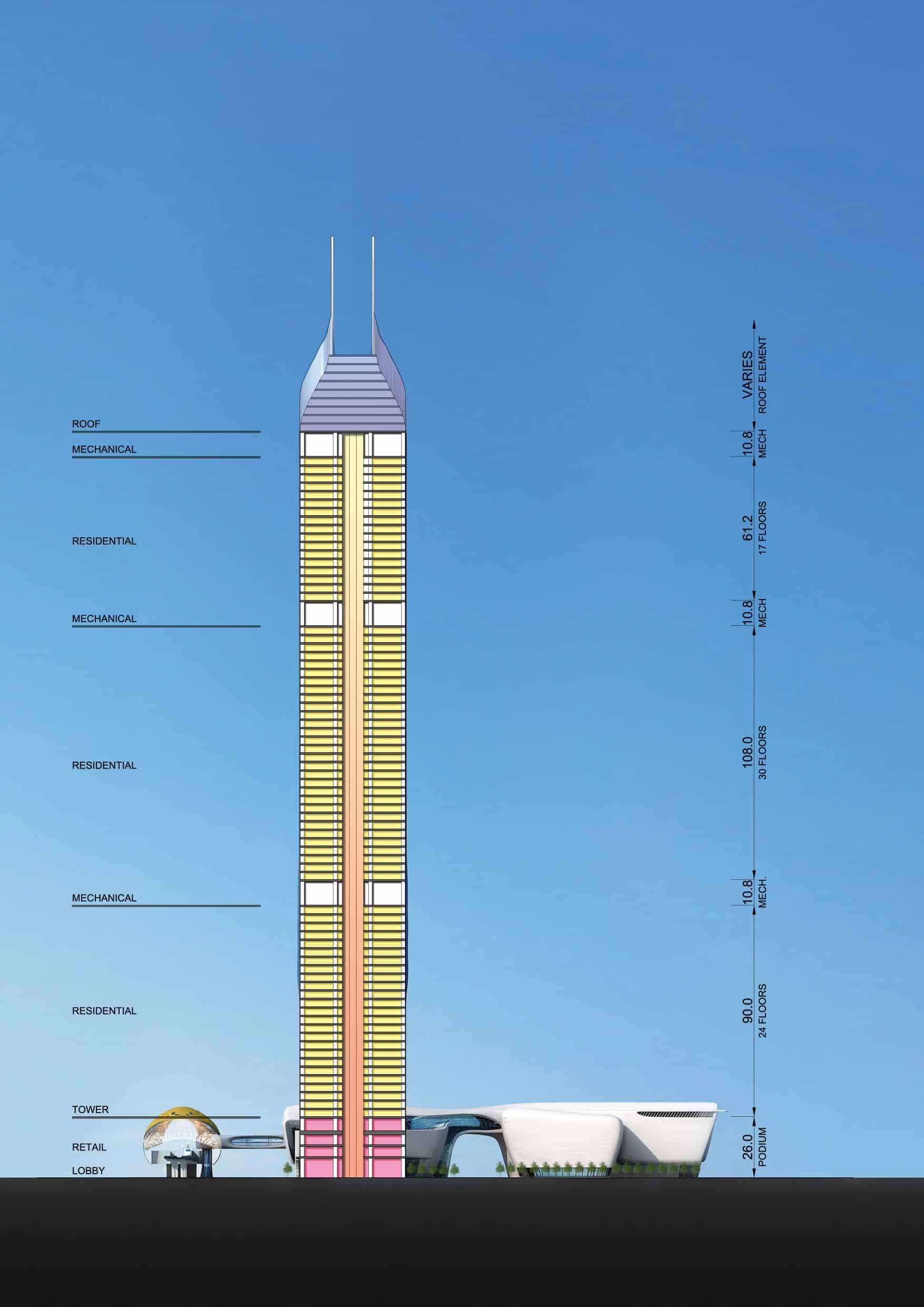 Having composite panel clad surfaces curvaceously looping around pervasive glazed facades, the 26 m high bases to both towers house branded retail outlets and recreational facilities including a variety of soft and hard landscape elements adorning the street shoulders at the ground level and the green podium on the top. While active fronts light up the roadside, two levels of malls line the ribboning circulation paths within. The foot bridge from the Business Bay metro station connects to these inner and outer circulation spaces, which in turn connect across the two towers a glass bridge at the podium level through, together forming an unbroken sequence of pedestrian movement enhancing the vibrancy of the retail and recreation spaces.