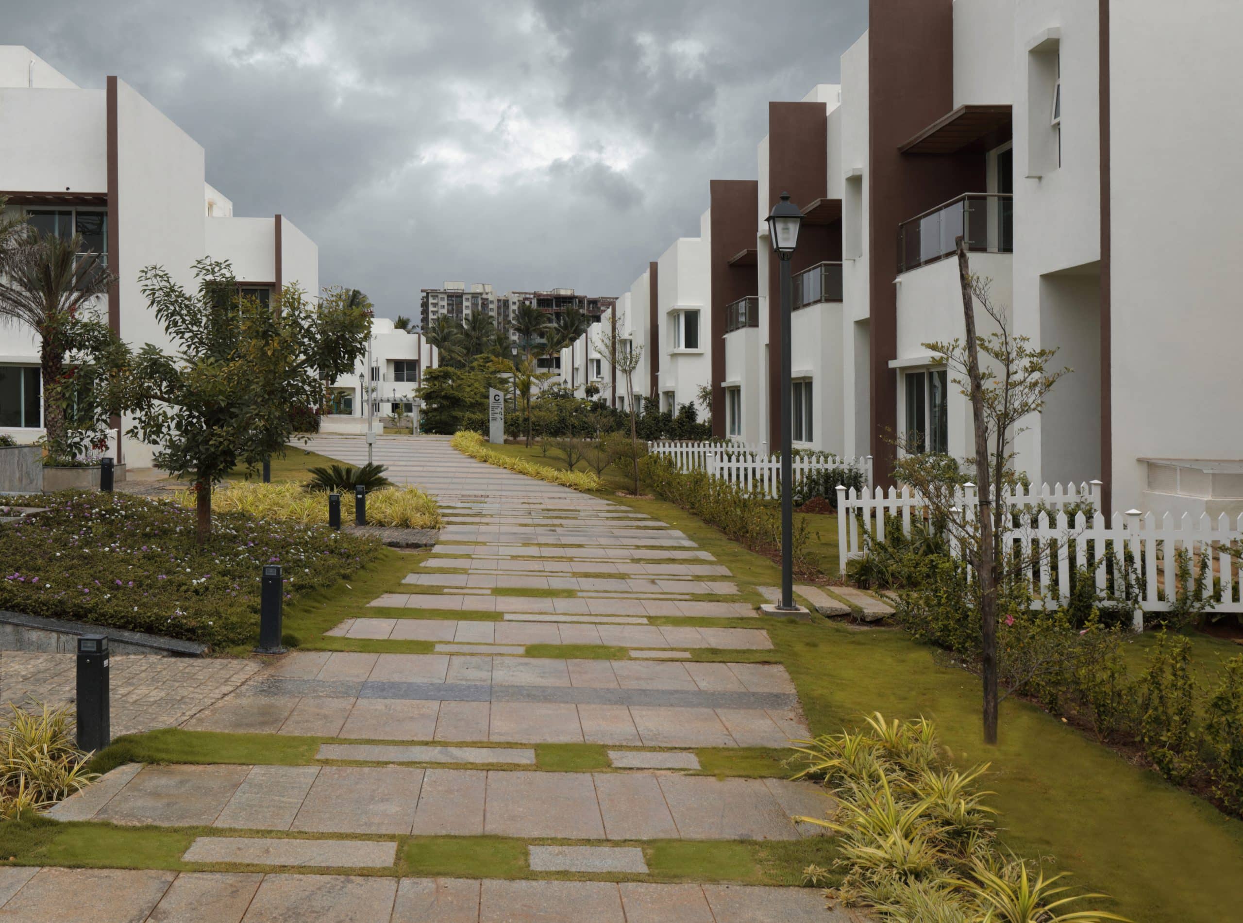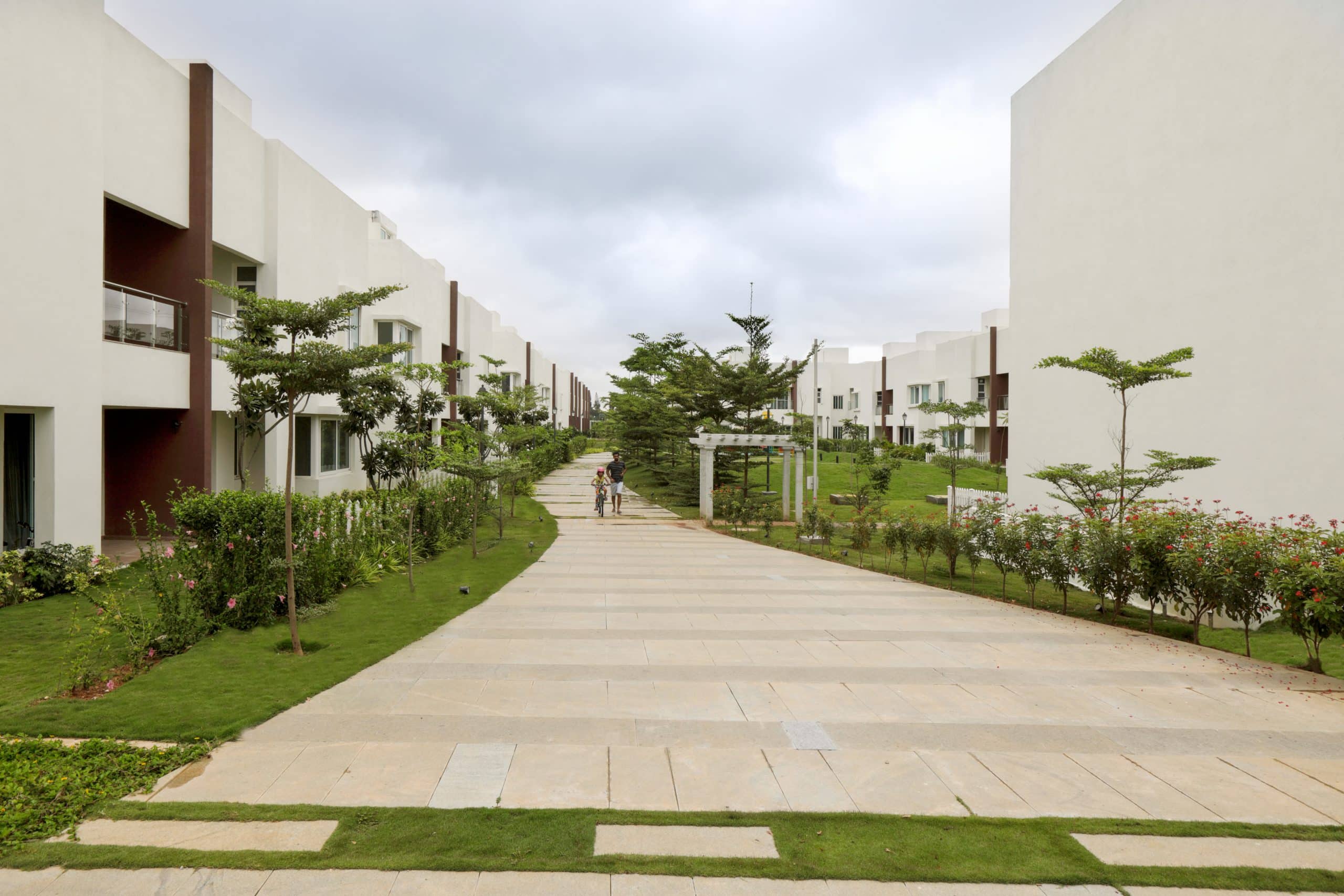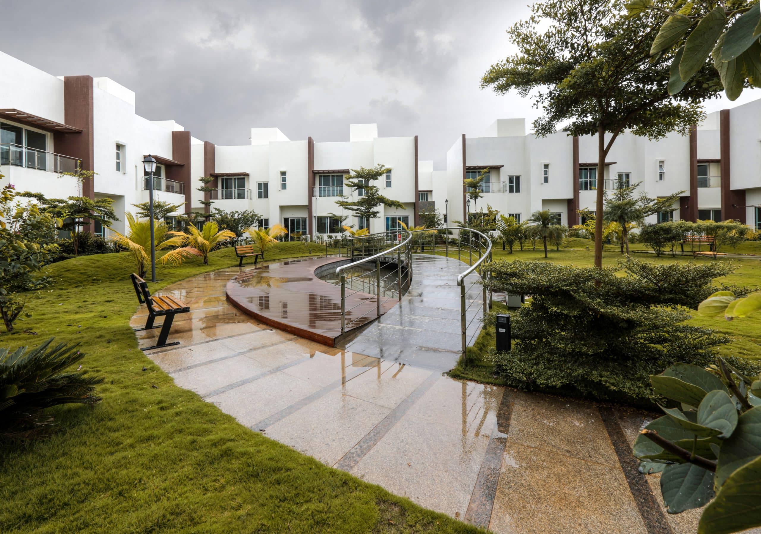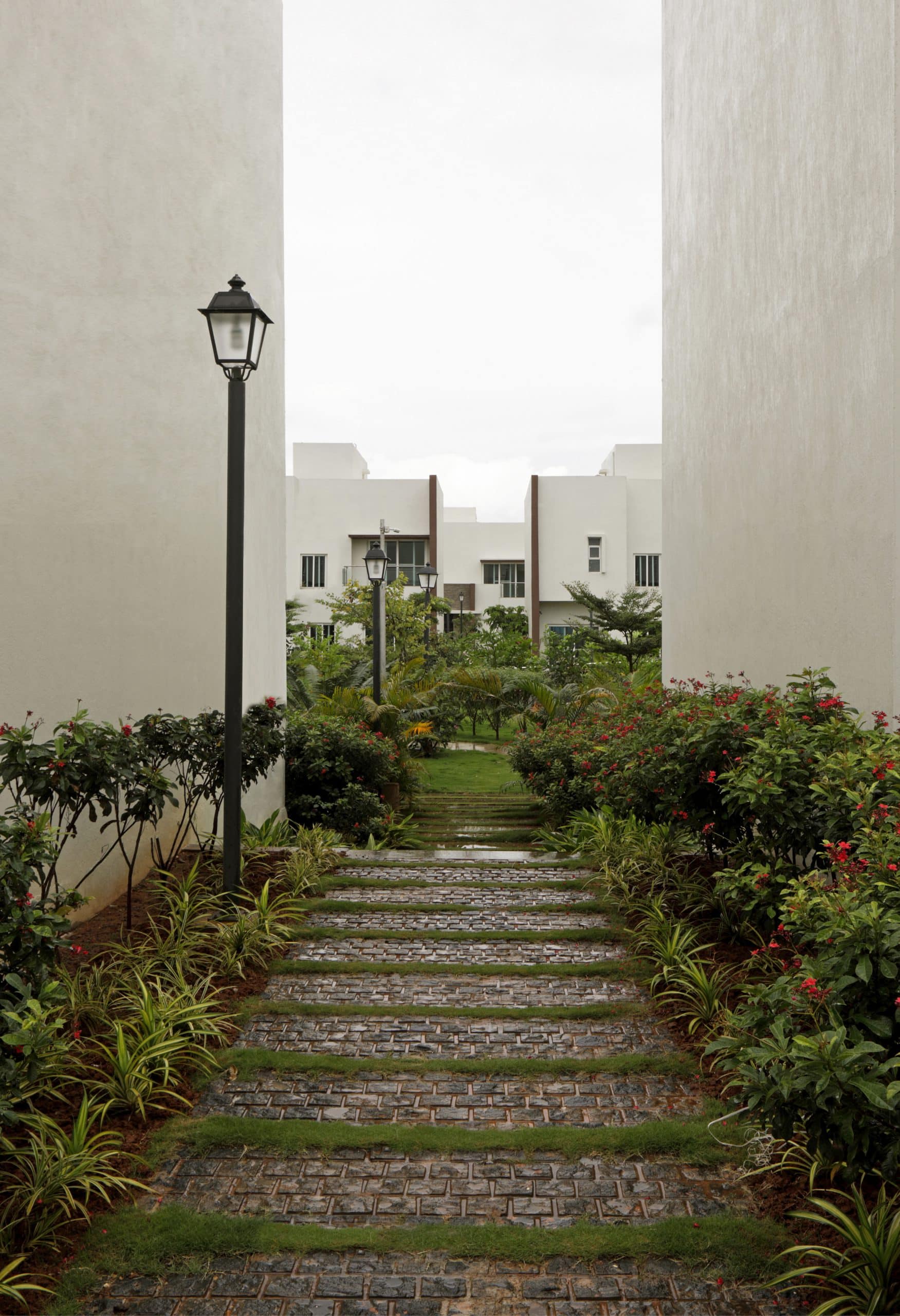 “Villas in a Garden’ was the vision of the developer for this community of premium homes located on a site near Sarjapur on the outskirts of Bengaluru, the Garden City itself. The strategy employed by the design architect to achieve this end was a complete segregation of the vehicular approach ways from the entire site by moving the road network to a subterranean level. INI Design Studio created the innovatively integrated landscape design for the said garden, which was the complete site itself thus freed of vehicular movement. On entry into the community, all vehicles are led to the basement entry through which they can then navigate the underground road network to approach the basement parking of each home. This leaves the entire site at the ground level to be cultivated into a massive open green traversable on foot or by cycling within which rows of villas are arranged around common gardens.