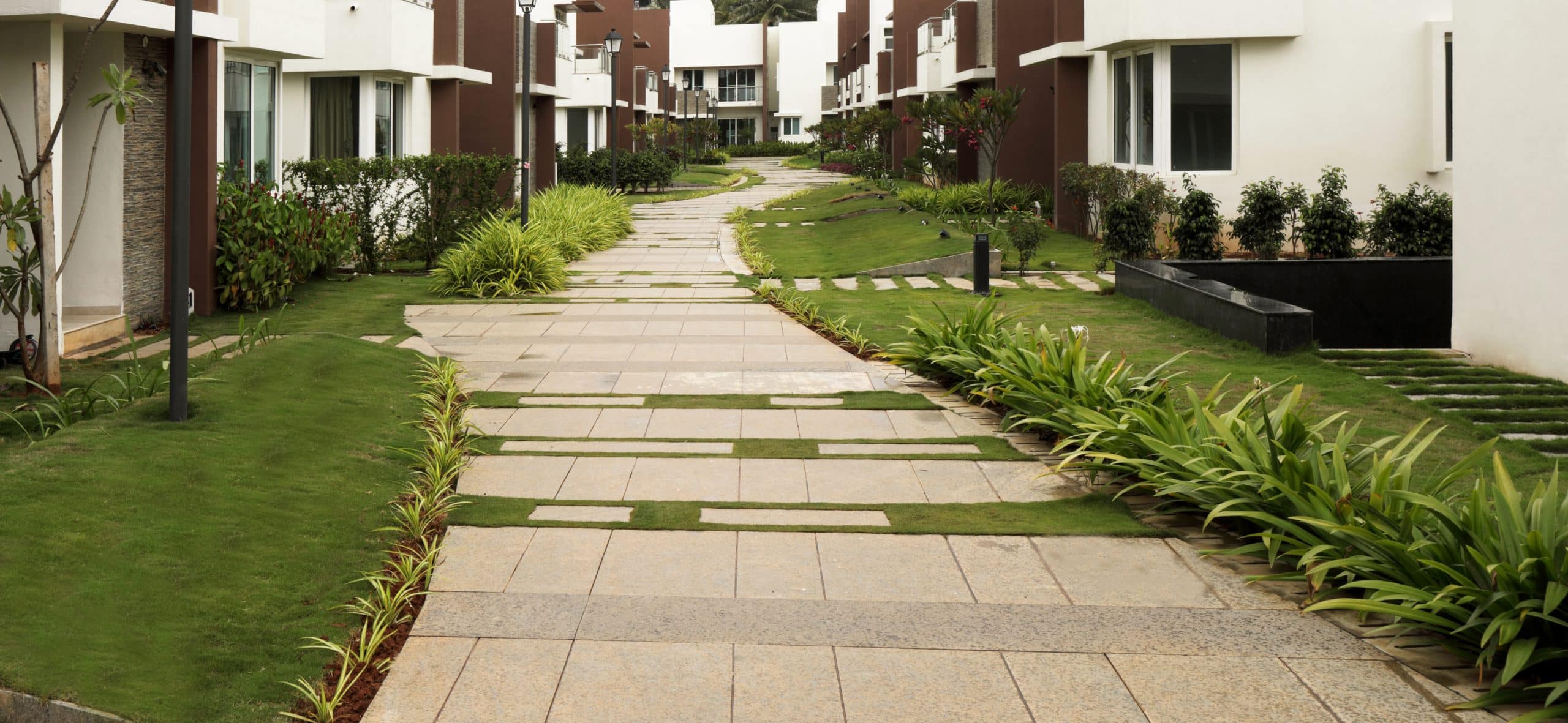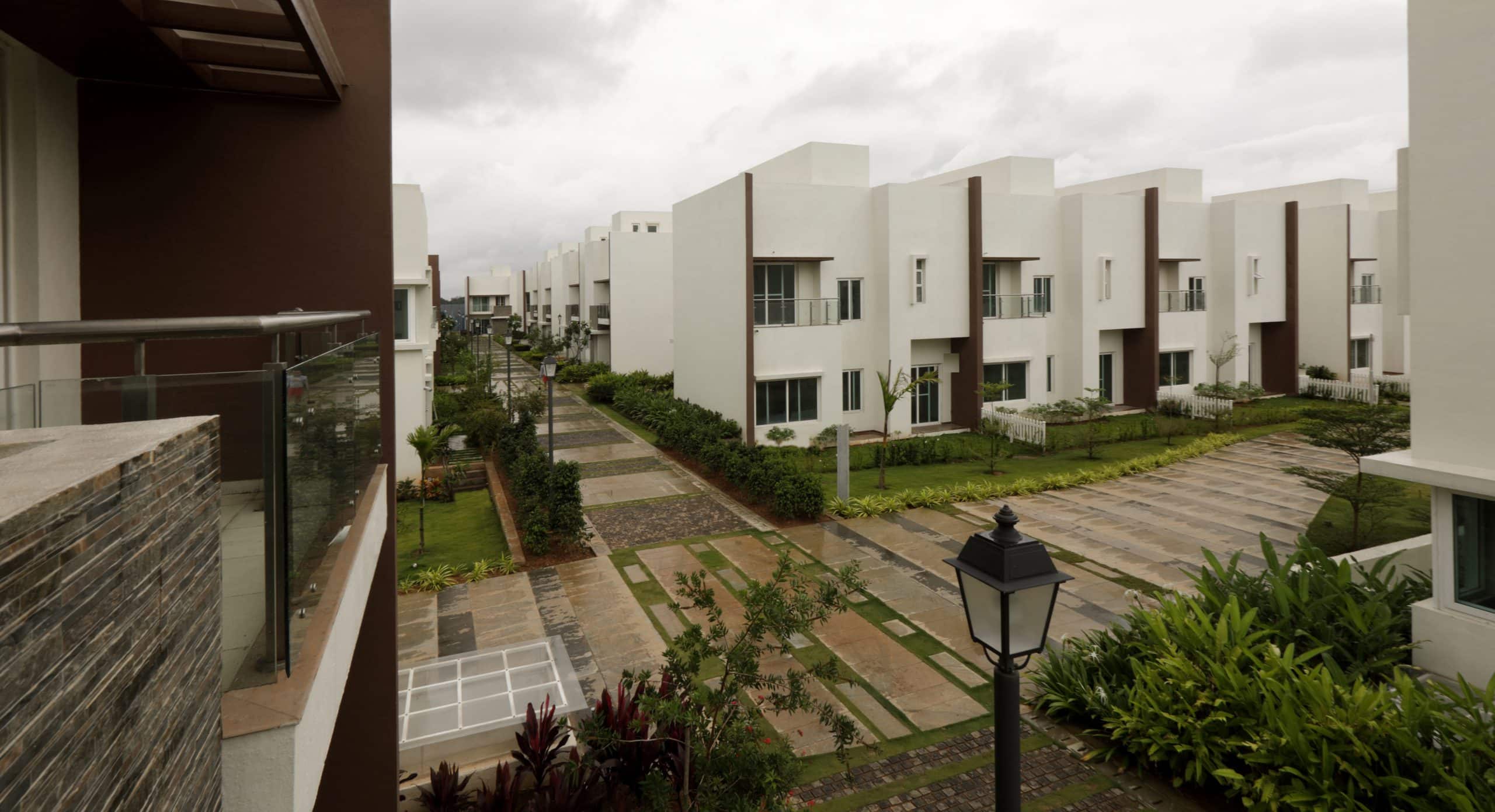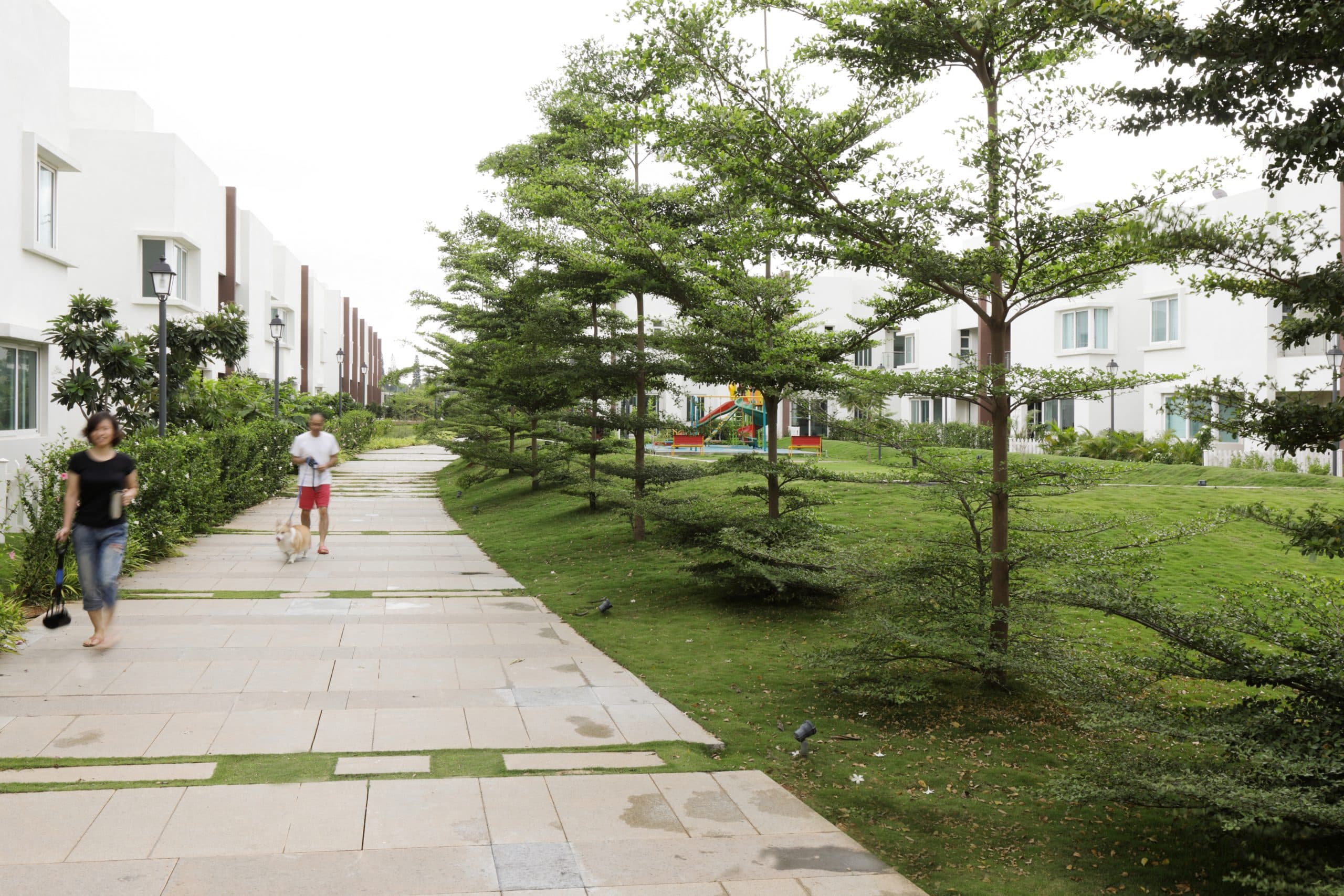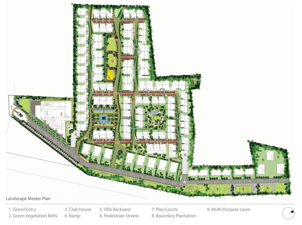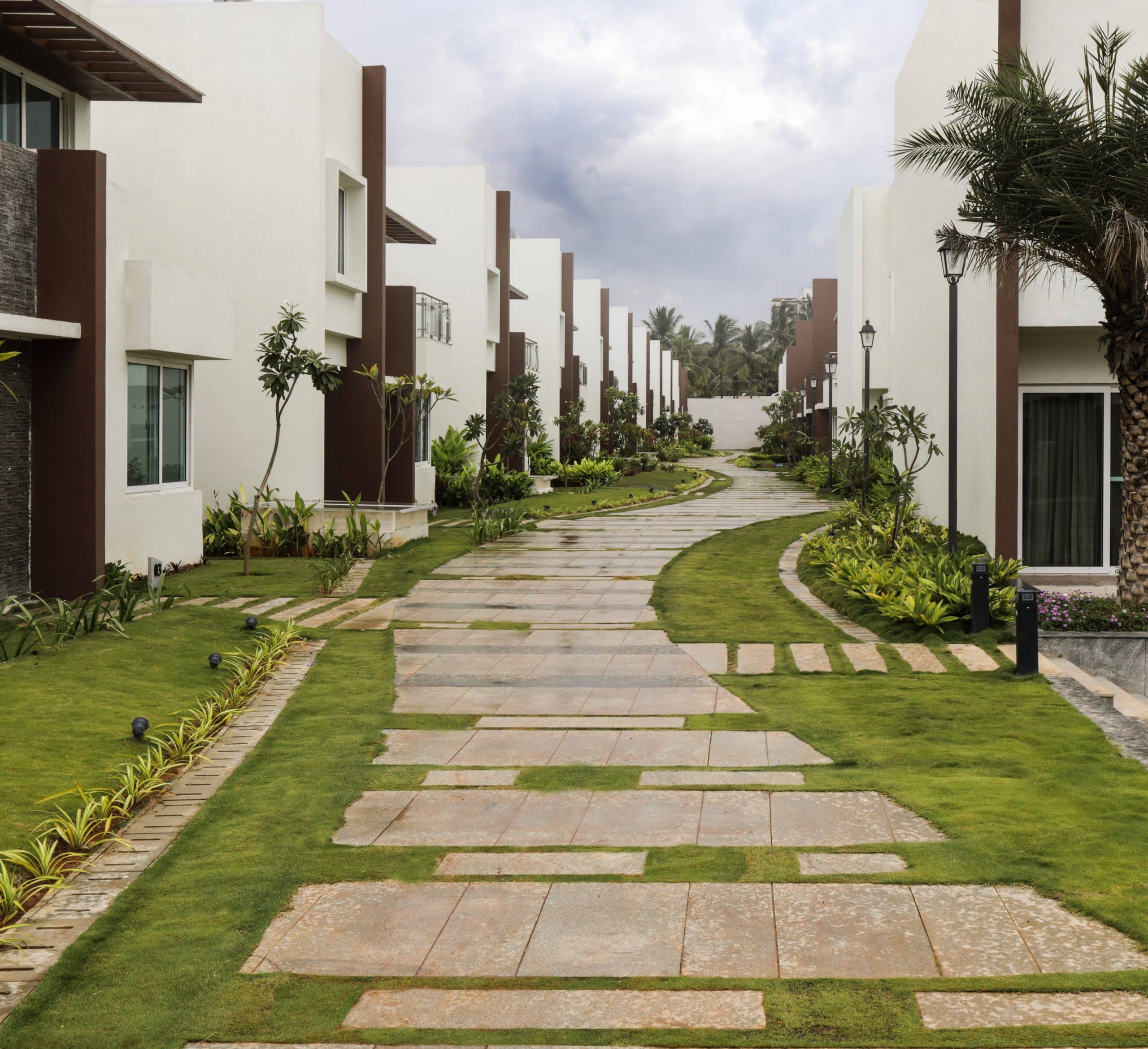 “Villas in a Garden’ was the vision of the developer for this community of premium homes located on a site near Sarjapur on the outskirts of Bengaluru, the Garden City itself. The strategy employed by the design architect to achieve this end was a complete segregation of the vehicular approach ways from the entire site by moving the road network to a subterranean level. INI Design Studio created the innovatively integrated landscape design for the said garden, which was the complete site itself thus freed of vehicular movement. On entry into the community, all vehicles are led to the basement entry through which they can then navigate the underground road network to approach the basement parking of each home. This leaves the entire site at the ground level to be cultivated into a massive open green traversable on foot or by cycling within which rows of villas are arranged around common gardens.