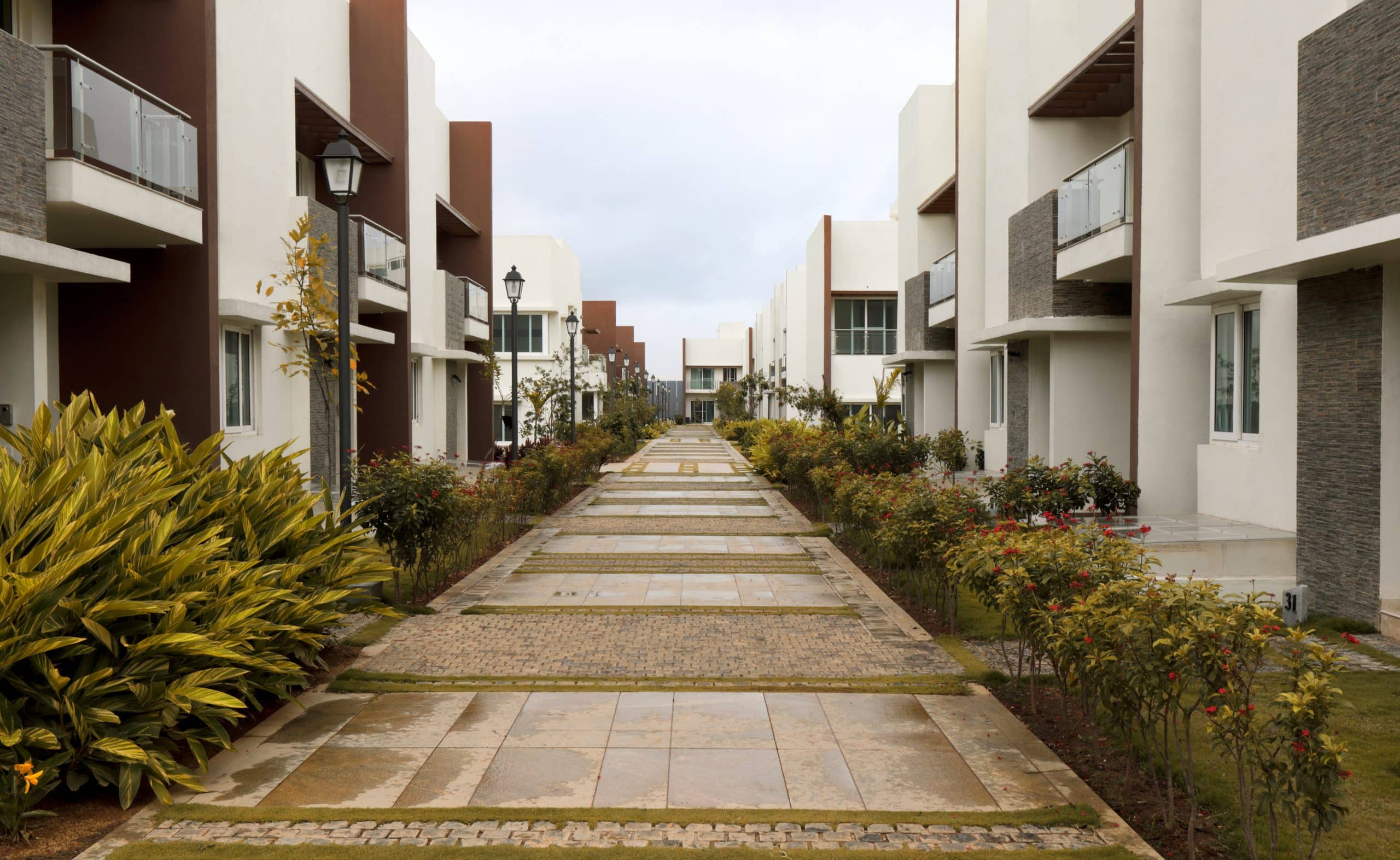 A revolutionary approach in terms of residential development, the Grand Carmen boasts of being a predominantly tar-free community with walkable neighborhoods. Each of the houses is connected vertically through the basement, from where residents can ascend up to their individual houses after parking their vehicles. This allows for manifold landscape insertions on the ground level. The major concept is of meandering streets that open up at some spots and narrow down at others, offering myriad quality to the path. All the units are arranged perpendicular to the street, with the front-end opening on to the street and the rear-end opening towards a private green, shared within a cluster. Each of the open spaces has a different character to it expressed through intricately designed landscape elements such as water feature, gardens, plaza and play areas. The pedestrian walking path is the essence of this development and sets it apart from conventional housing schemes.