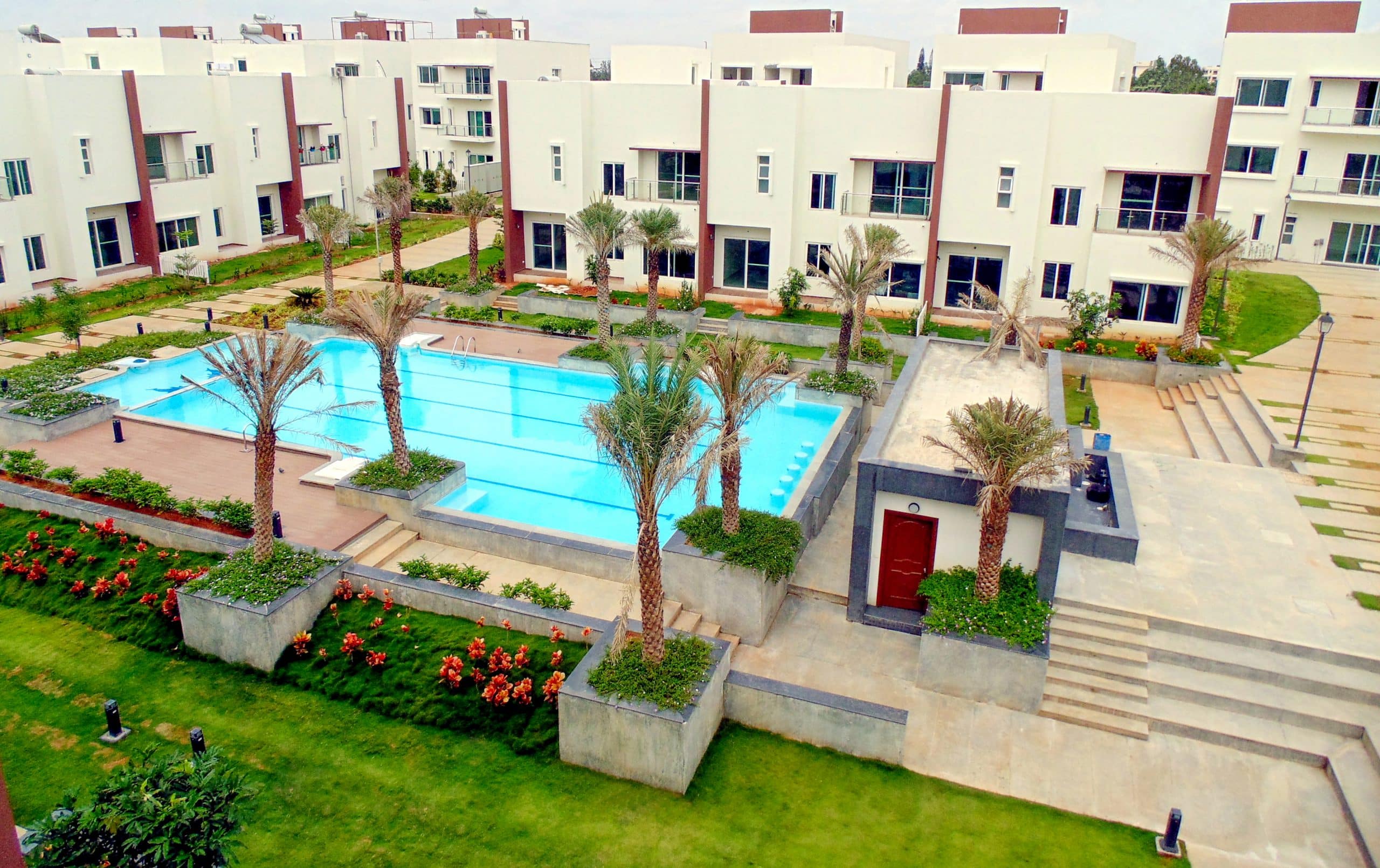 Several fairly large thematic gardens and parks have been placed at common junctures throughout the campus to delight the neighborhood and respond to various requirements of social interaction. These include a Tropical garden vegetated with coconut, plantain and other palms around a lawn with jogging tracks and seating. Another is a lotus garden with plush furnished pavilions placed amidst a beautiful lotus pond; yet another is a common lawn surrounded by an orchard and amphitheater style seating. An outdoor swimming pool also finds emphasis through its aesthetic detailing of split levels.