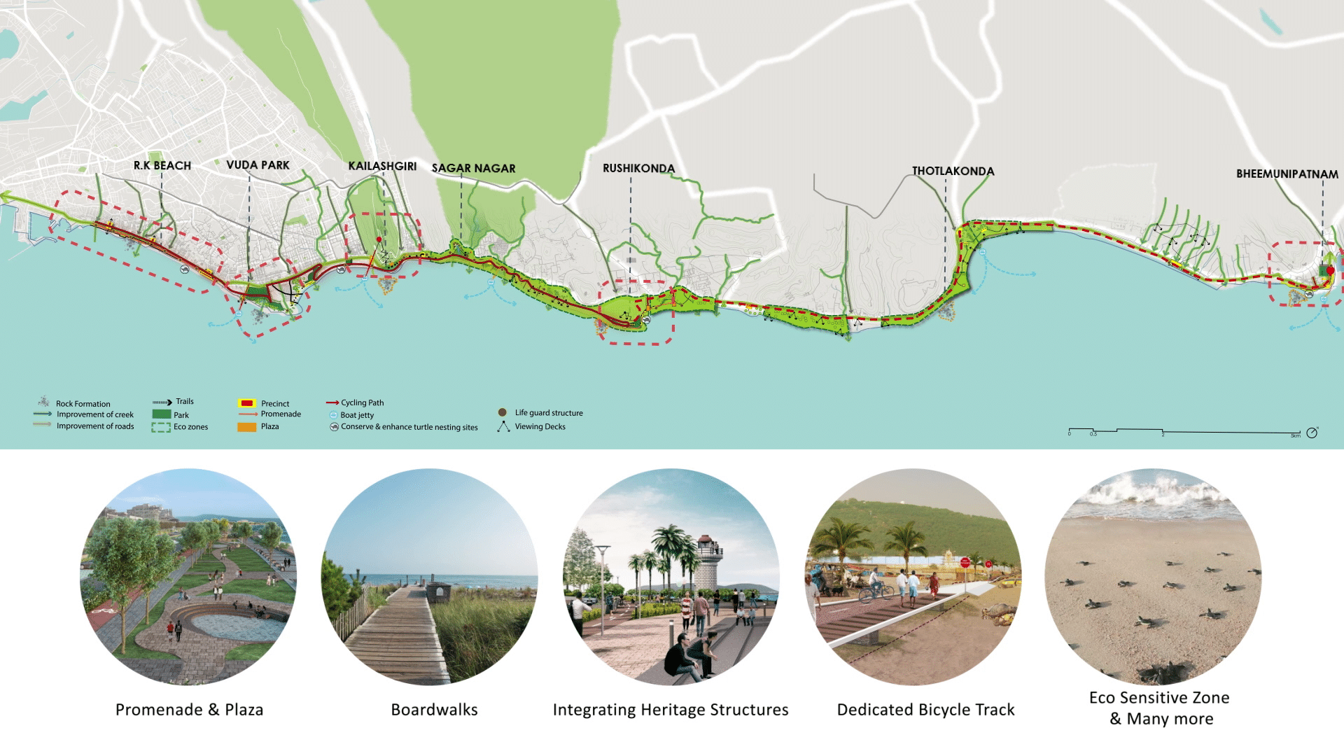 A continuous 14-km long cycling track along the beachfront is proposed with uniform signages, landscape and street furniture that shall bind the entire stretch together lending it a uniform identity while it traverses through varying precincts. A resilient landscape plan throughout the stretch pivoted on local species safeguards the beachfront from the future storm surges. Distinct pockets have been delineated for area-based developments.