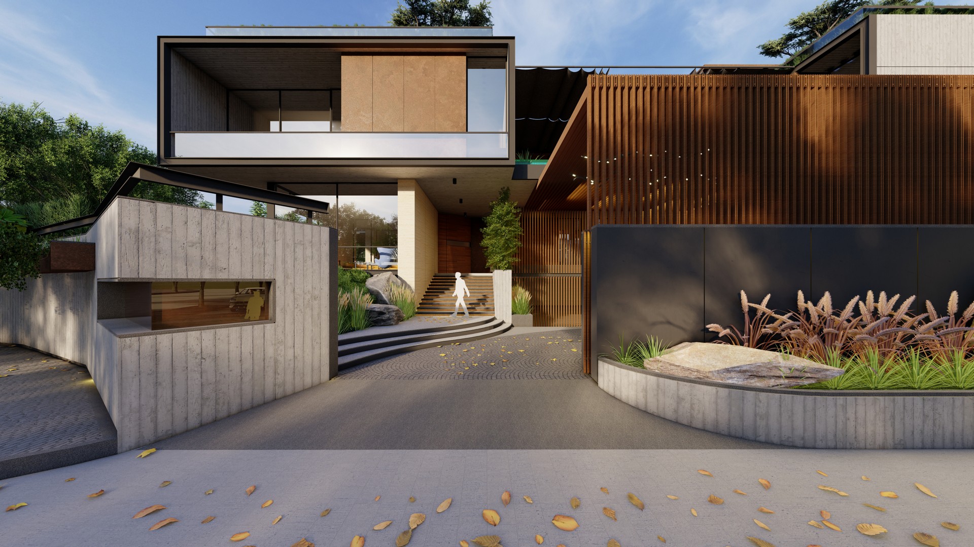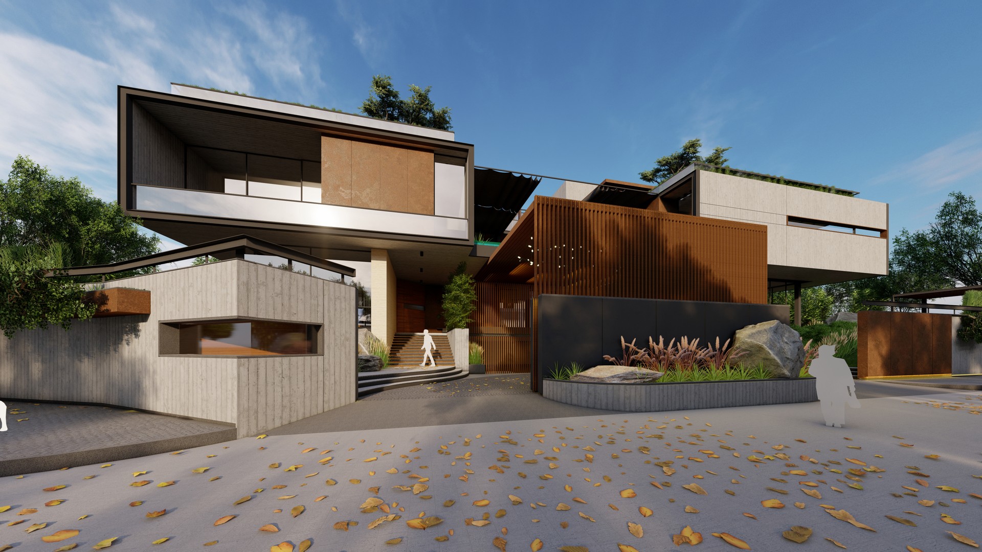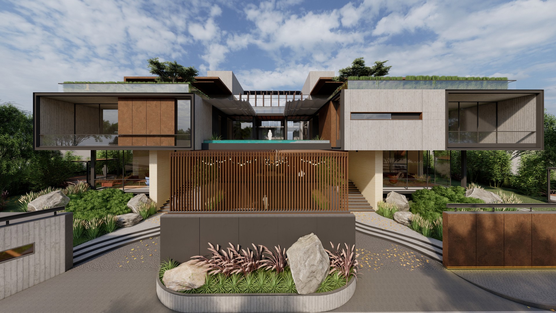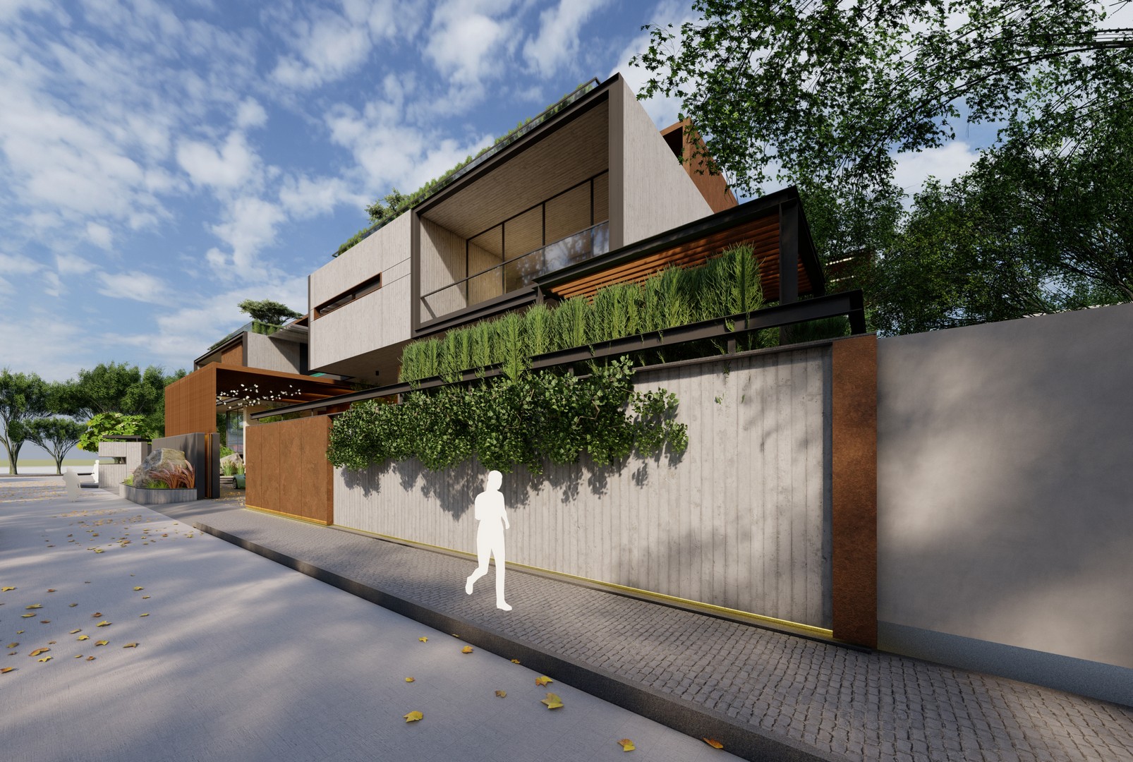 The core of Villa Nandan Baug Terraces's architectural identity lies in its harmonious use of materials, exemplifying sophistication and purpose. The travertine stone base of the ground floor establishes a sense of stability and permanence, while the exposed concrete masses on the first floor exude a contemporary, minimalist elegance. Crowning accents of metal and Corten steel introduces a touch of modern luxury that complements its natural surroundings. This interplay of materials adds depth and character to the structure, while exuding a raw elegance.